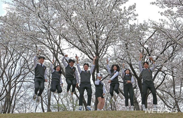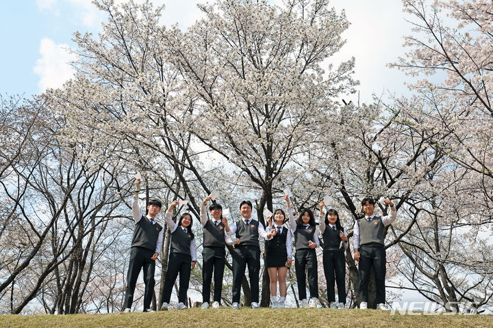 韓国の第22代国会議員選挙の事前投票が始まった5日午後、三一工業高校の生徒たちが、京畿道水原市長安区の錬武洞行政福祉センターに用意された事前投票所で生まれて初めての投票を済ませ、学校前の桜並木の下で記念撮影をしている。