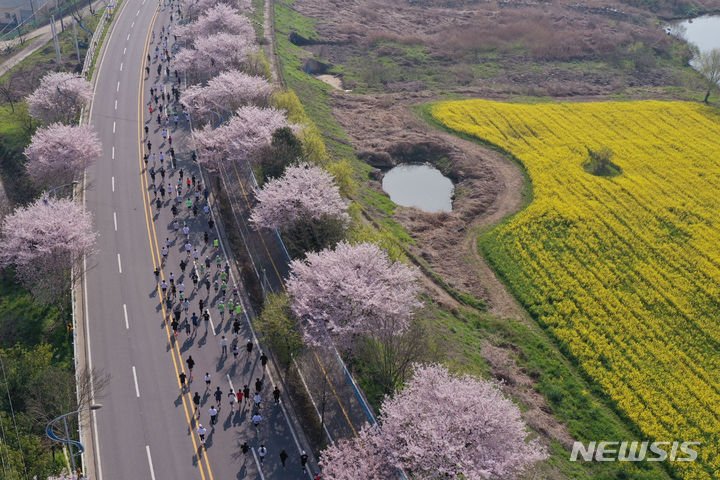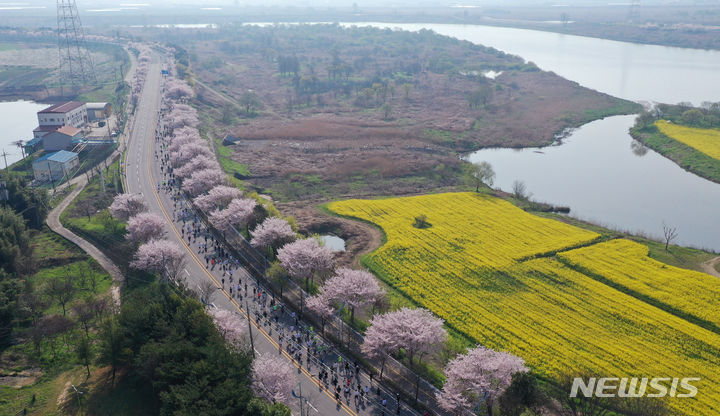 【NEWSIS】7日午前、全羅南道羅州市の羅州総合スポーツパークで、NEWSIS光州全羅南道取材本部主催・羅州マラソン同好会主管の「第10回羅州栄山江マラソン大会」が開催された。写真は栄山江沿いの桜並木を走る参加選手たち。