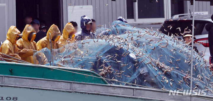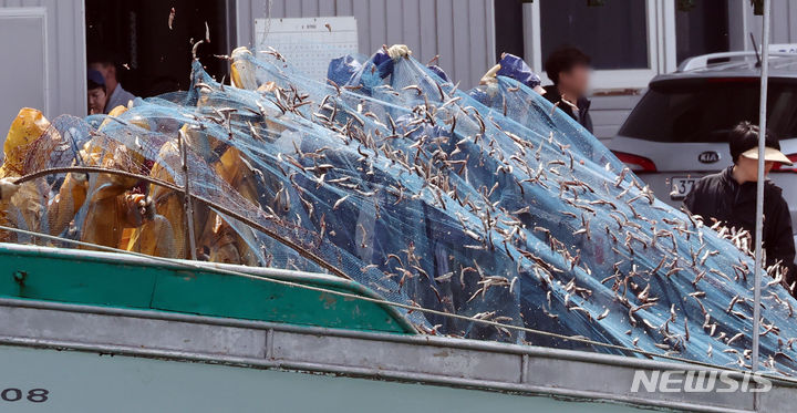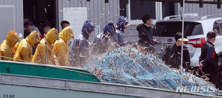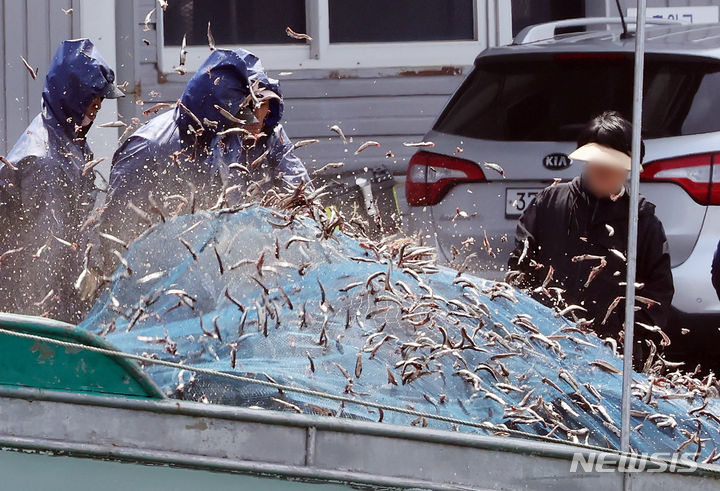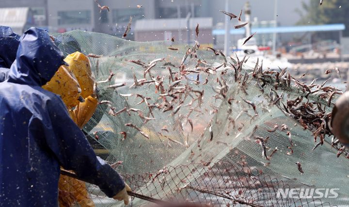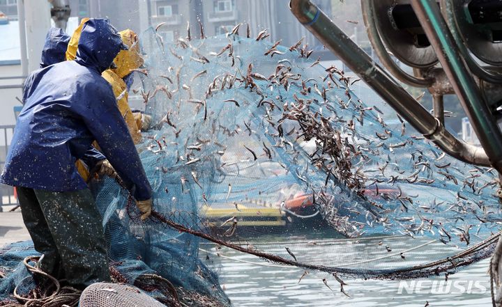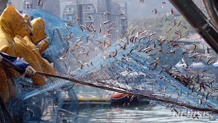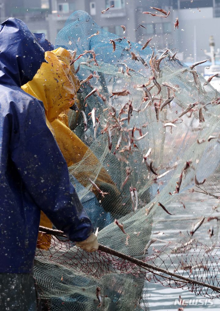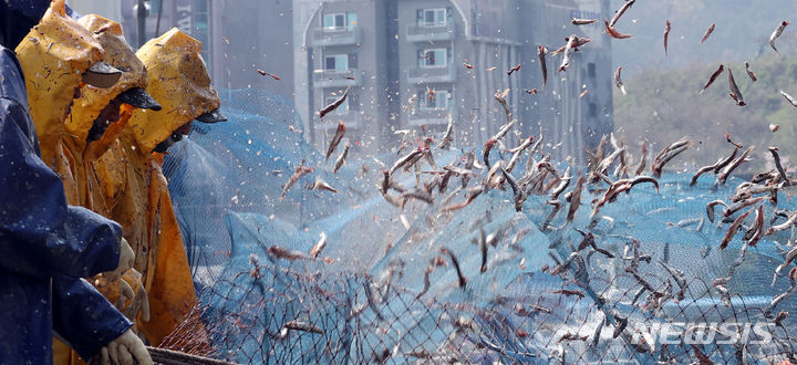 【NEWSIS】7日午後、釜山市機張郡の大辺港で、とれたばかりのイワシを網から払い落とす漁師たち。春の機張イワシは体長10-15センチメートルで、焼き魚用、刺身用、塩辛用などさまざまな味わい方がある。毎年4月末には大辺港で機張イワシ祭りが開かれていたが、今年は財政問題や漁村の高齢化による人手不足などを理由に開催が中止された。