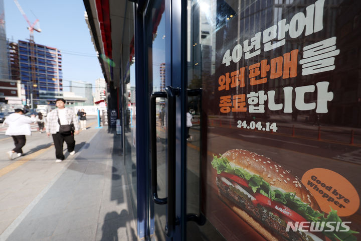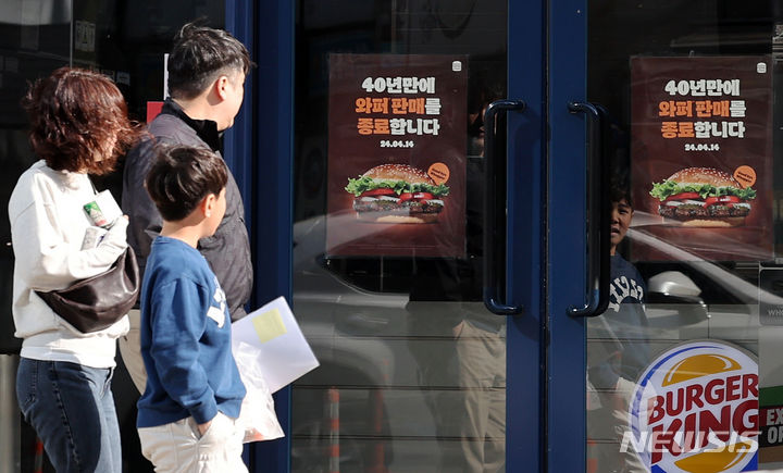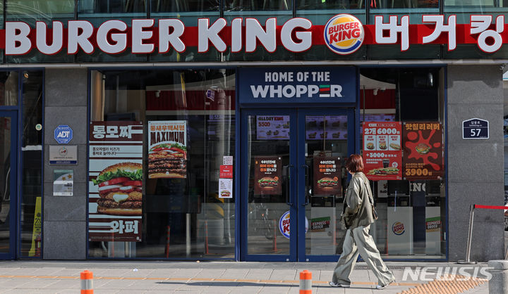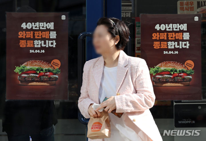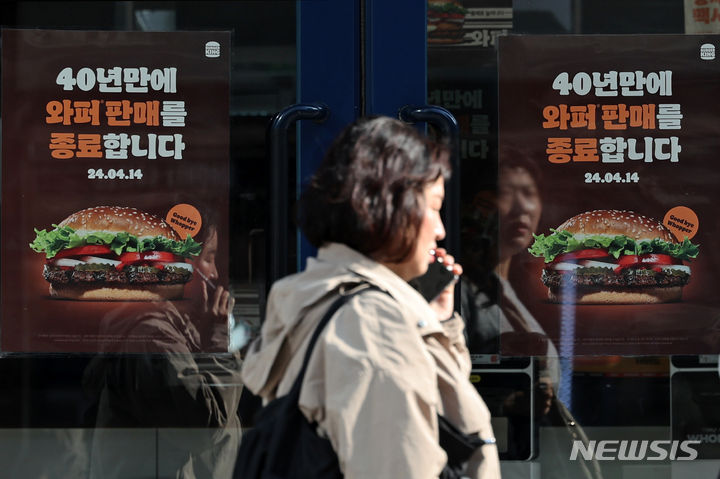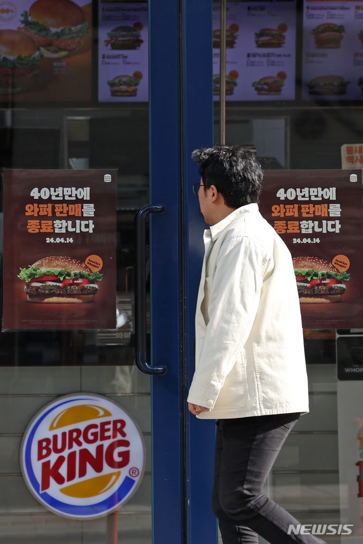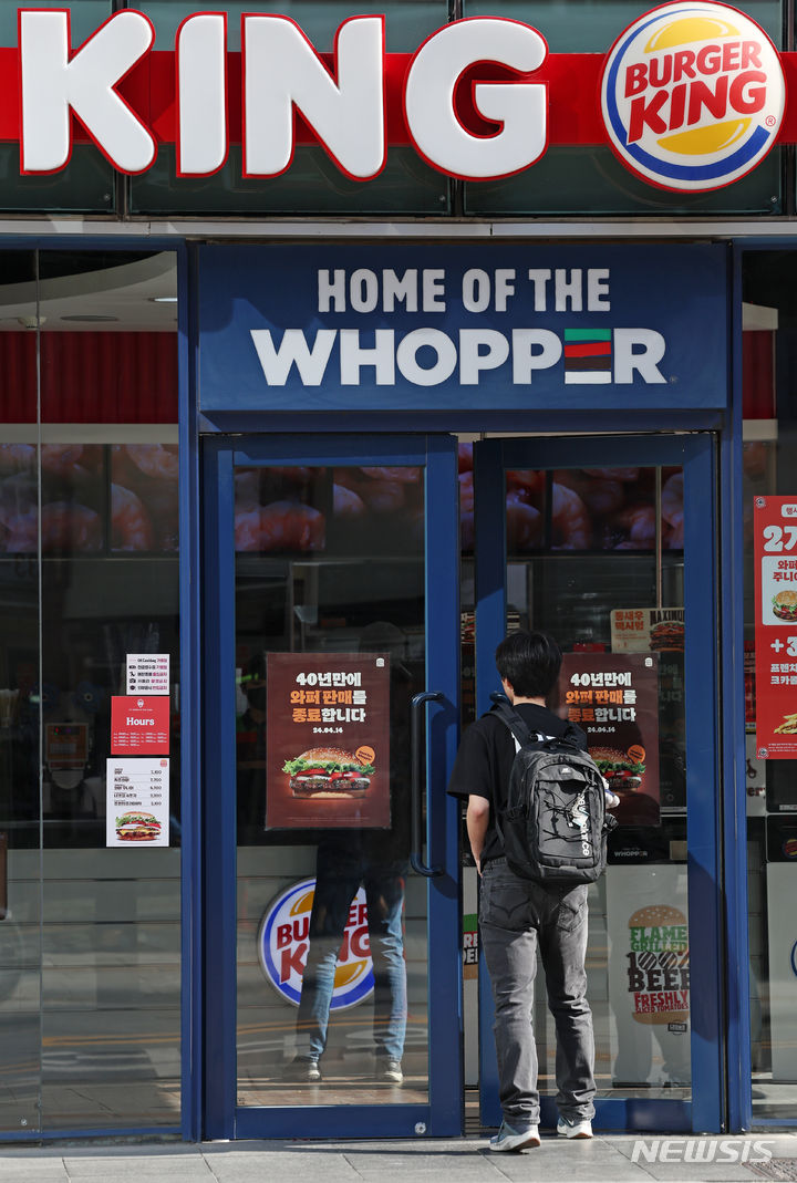 ハンバーガーチェーンのバーガーキングが、代表的なメニュー「ワッパー」の販売を40年ぶりに中断するとの案内文を公式ホームページに掲載し、消費者たちを混乱させている中、9日午前、ソウル市内のバーガーキング店舗に入る市民の様子。実際には販売中止ではなく、ワッパーのリニューアルを控えたプロモーションであることが分かった。