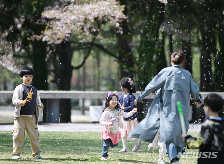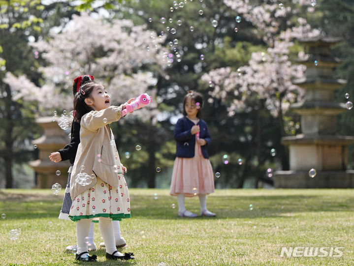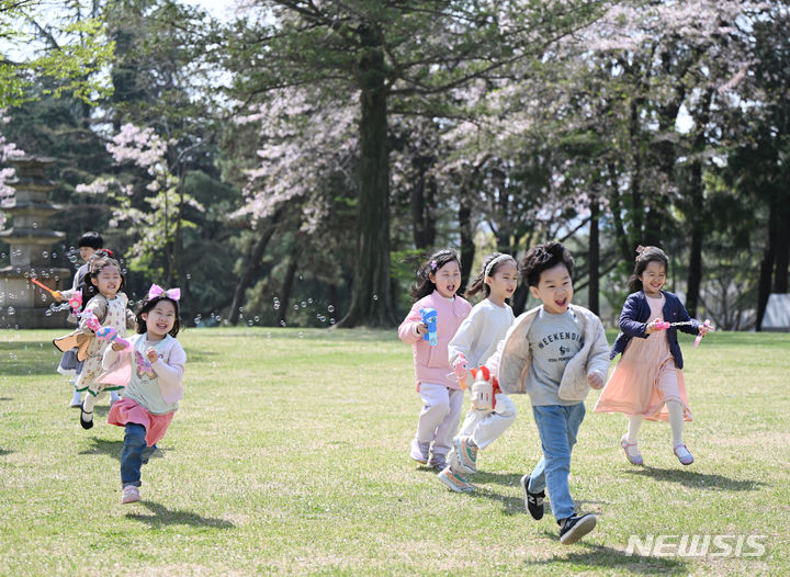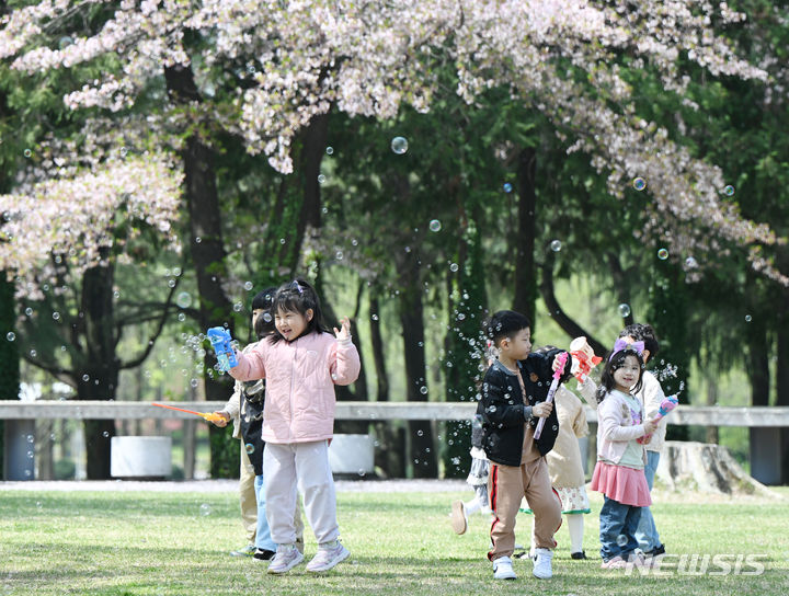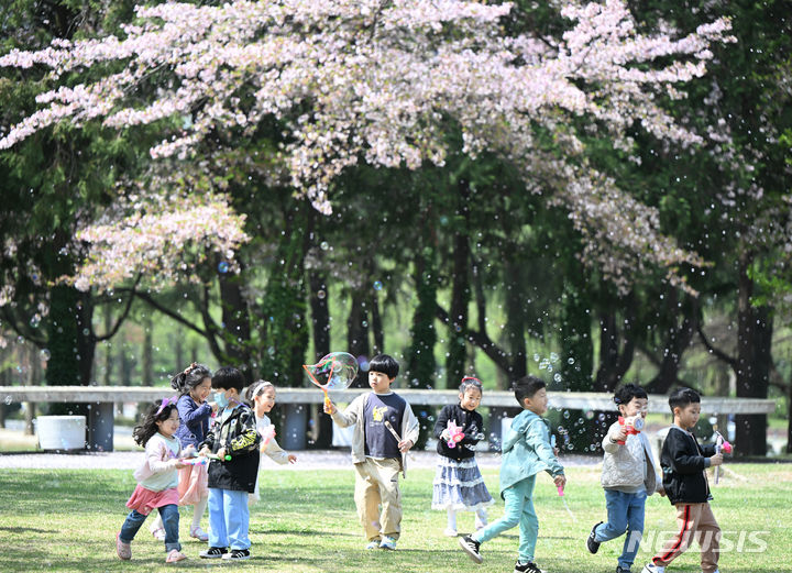 光州市北区竜鳳洞の全南大学で9日午前、野外活動に来たオリニチプ(民間保育施設)の子どもたちが、しゃぼん玉で遊んでいる様子。