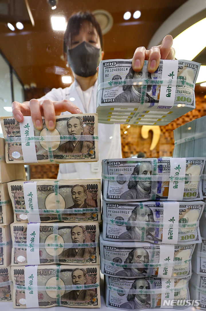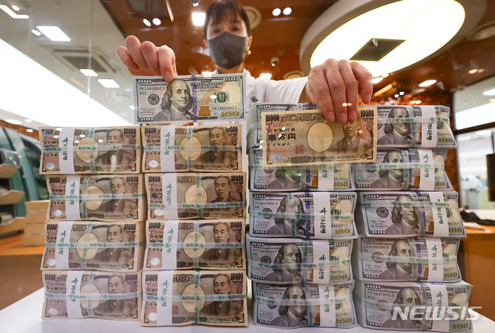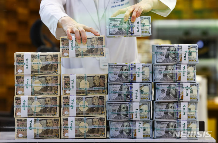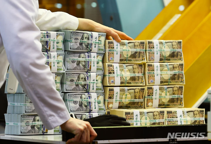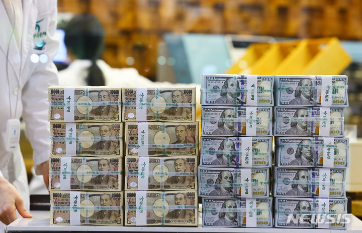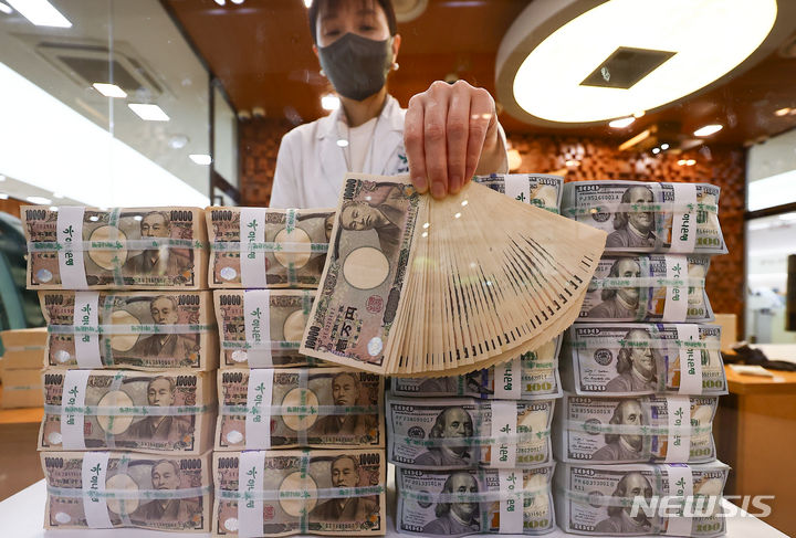 ソウル市中区のハナ銀行偽変造対応センターで11日、行員が円紙幣やドル紙幣を手にしている様子。米国の3月の消費者物価指数(CPI)が市場予想を上回り、利下げ期待が後退し、ニューヨーク外国為替市場で円相場は1ドル=153円16銭で取引され、34年ぶりの円安・ドル高水準となった。