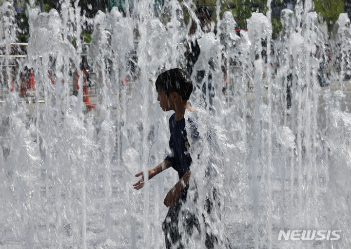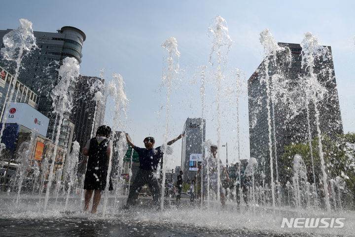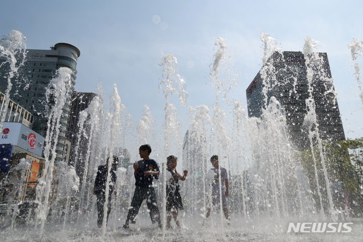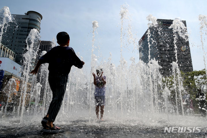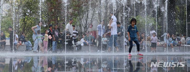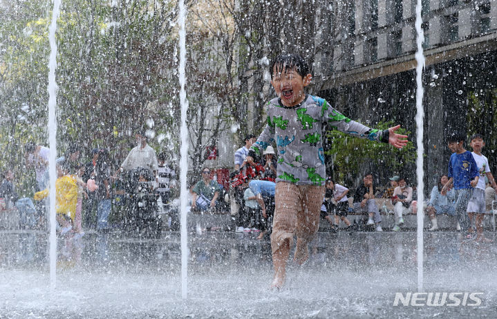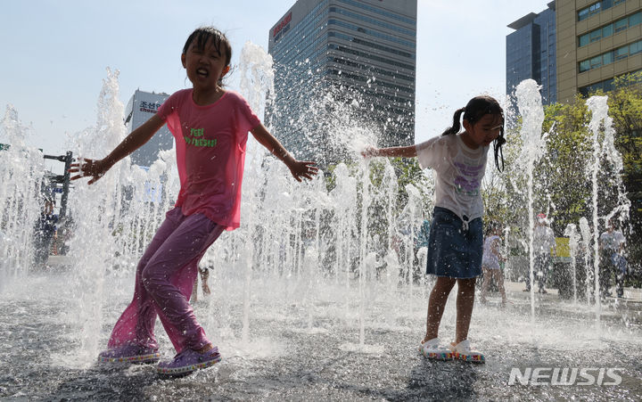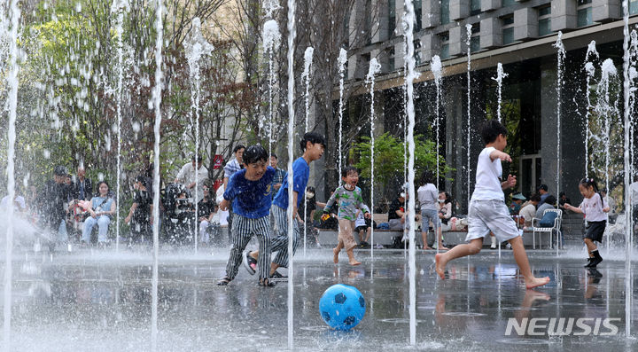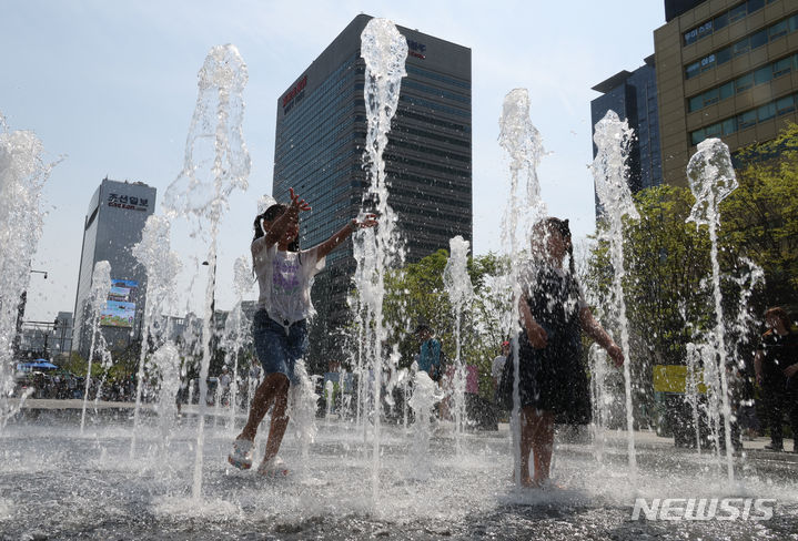 【NEWSIS】ソウルの日中の最高気温が29℃まで上昇した14日、ソウル市鍾路区の光化門広場にある噴水で水遊びをする子どもたち。