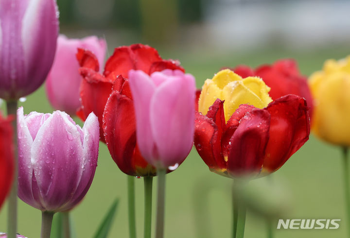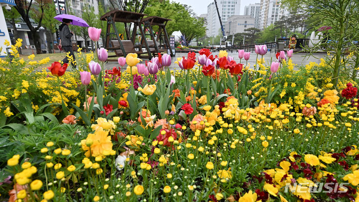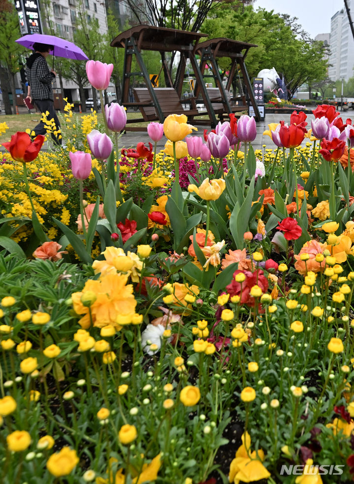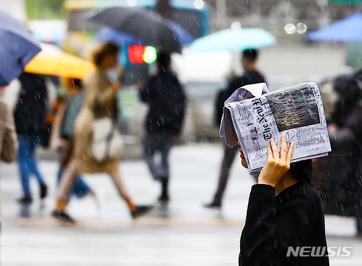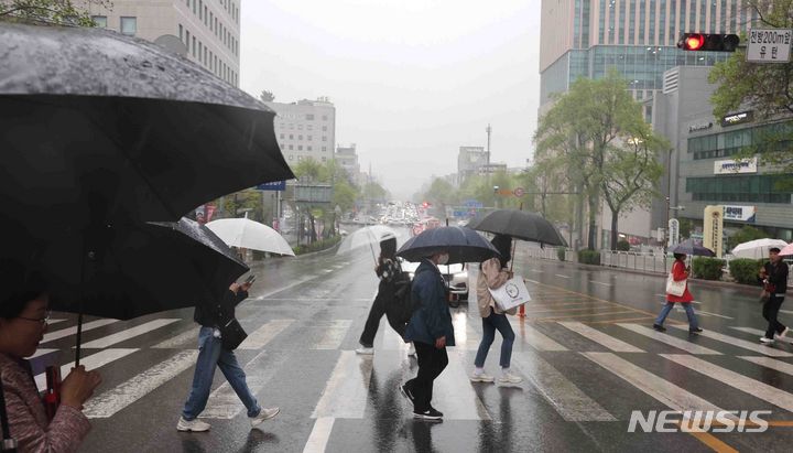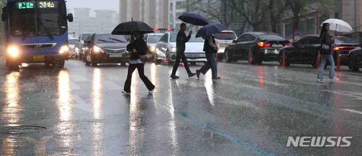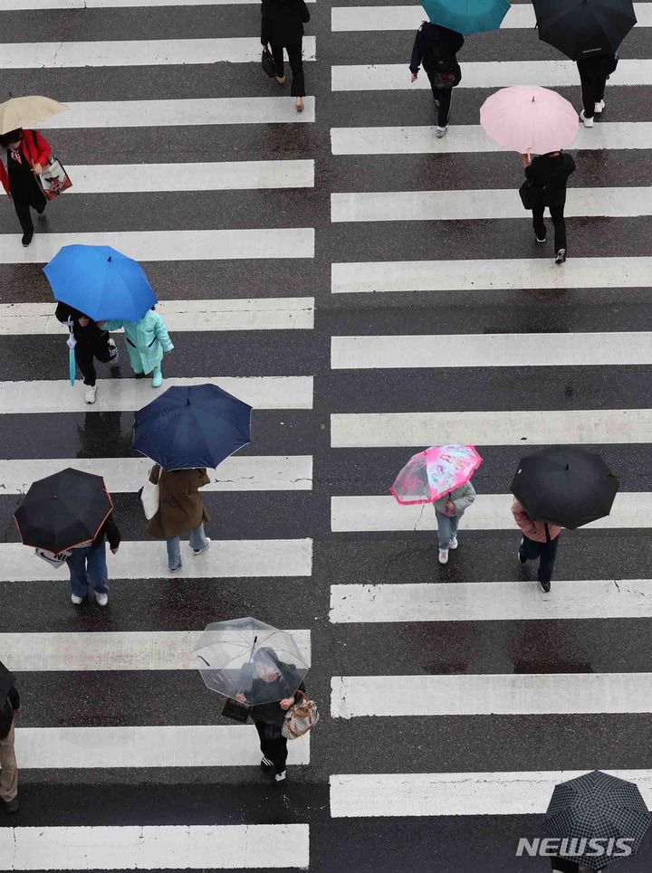 全国的に雨となった15日午前、仁川市南洞区のキル病院近くの横断歩道を、市民が傘をさして歩いていた。