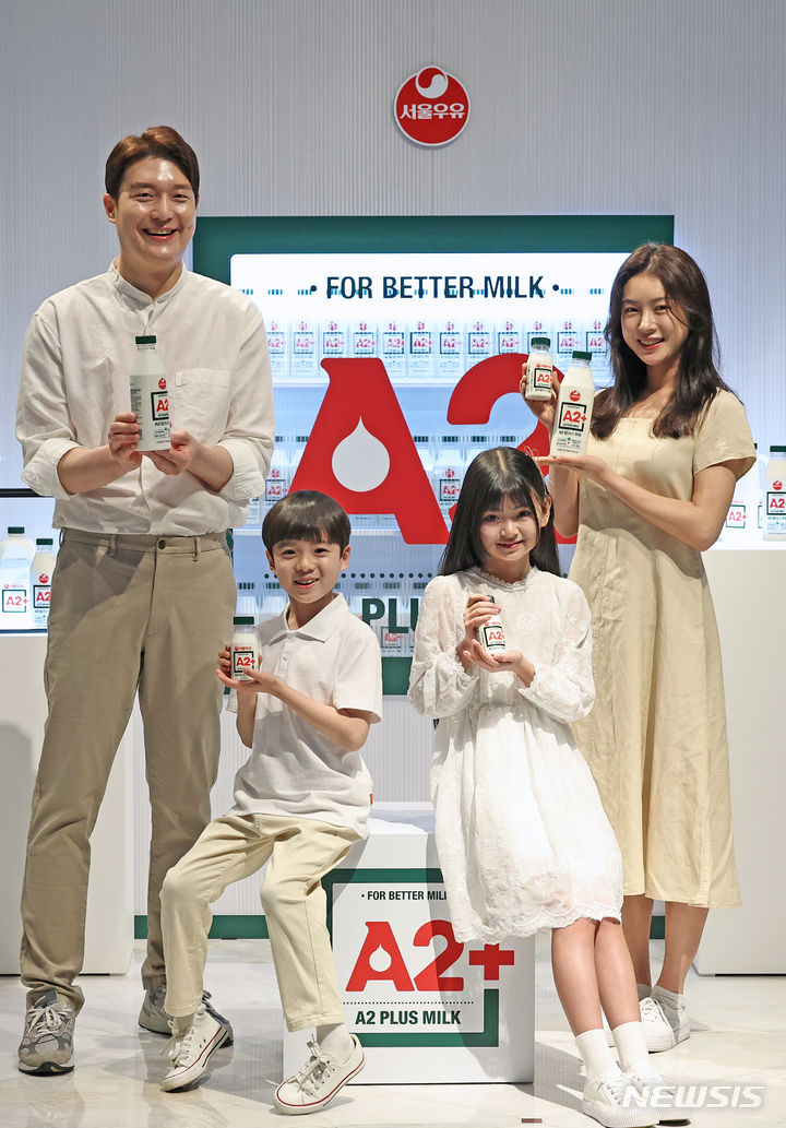 ソウル市竜山区のグランド・ハイアット・ソウルで15日、ソウル牛乳協同組合の新商品発表会が行われ、コンパニオンらが「A2+牛乳」を紹介した。