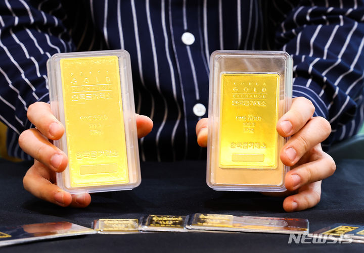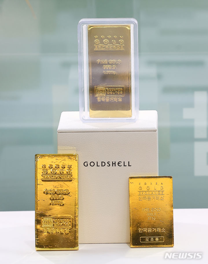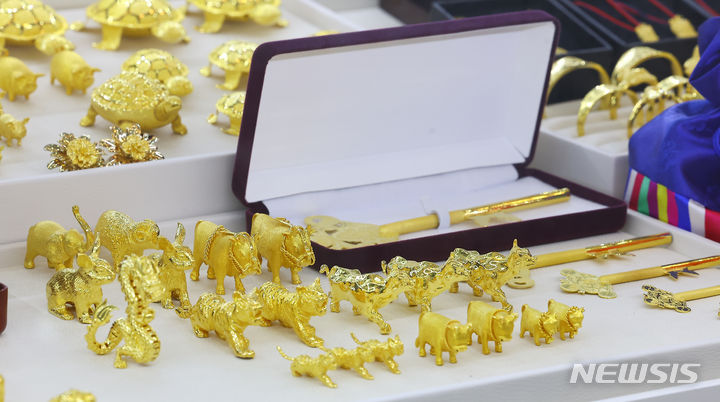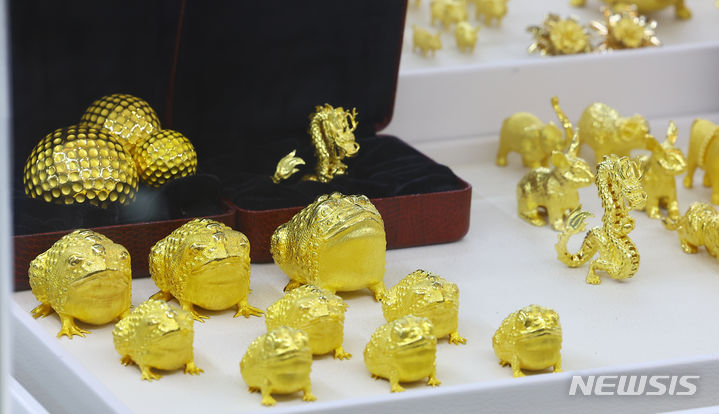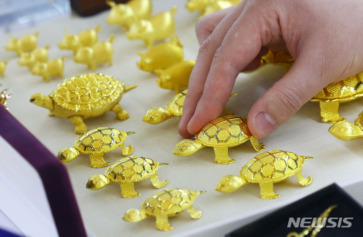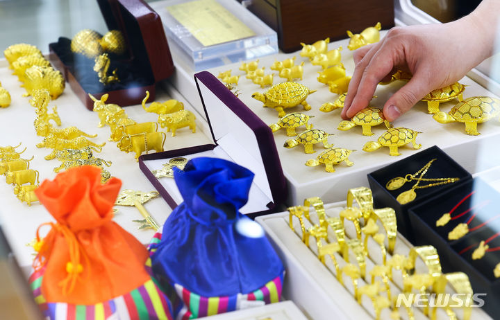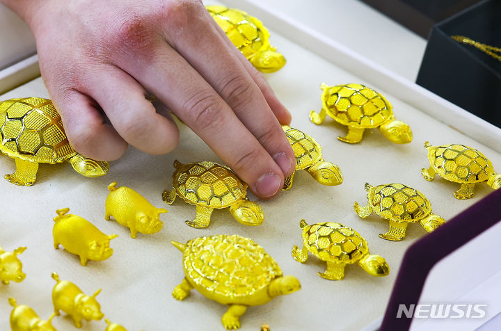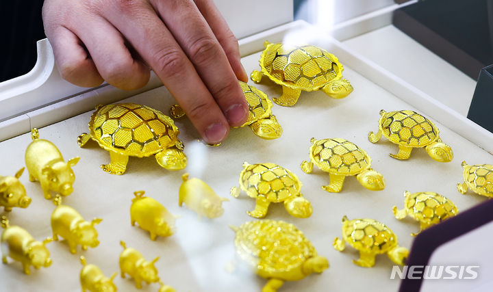 中東の情勢不安を受け、安全資産である金の価格が上昇している。写真は15日、ソウル市鍾路区の韓国金取引所で、職員が金製品の整理をしているところ。