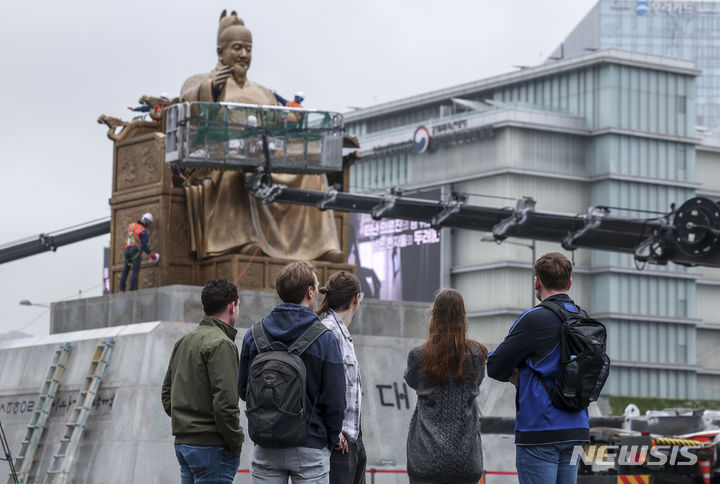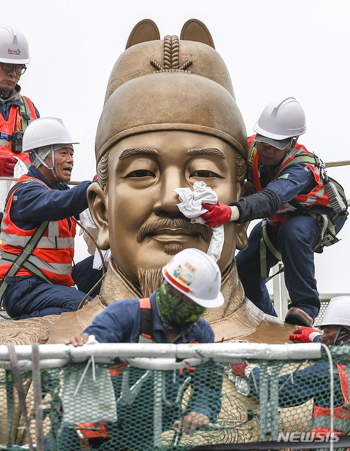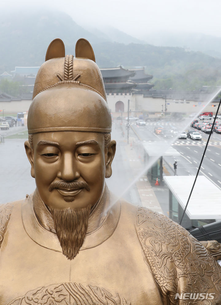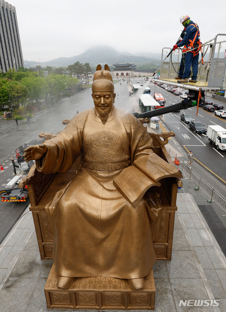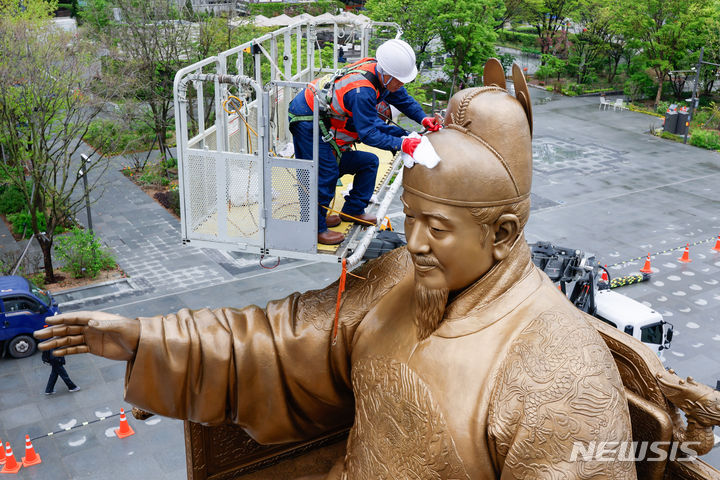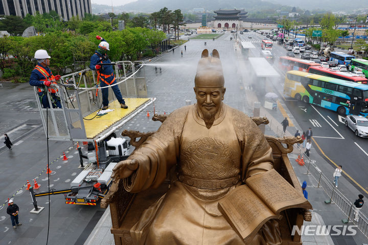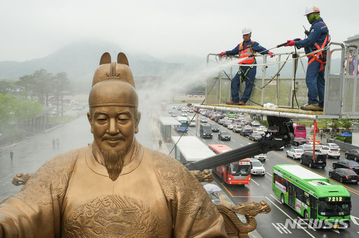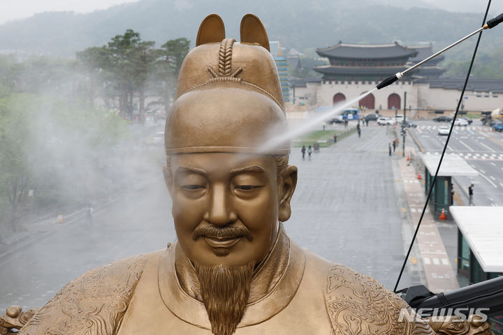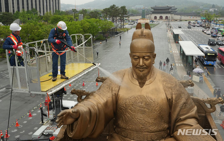 ソウル市鍾路区の光化門広場で15日、ソウル市の関係者たちが世宗大王の銅像の洗浄作業を行う様子(共同取材)。