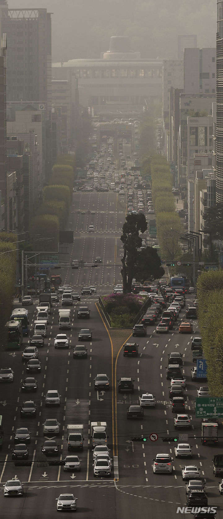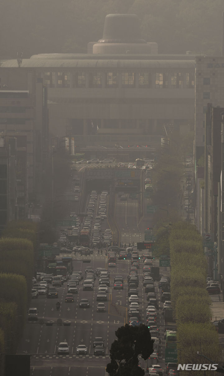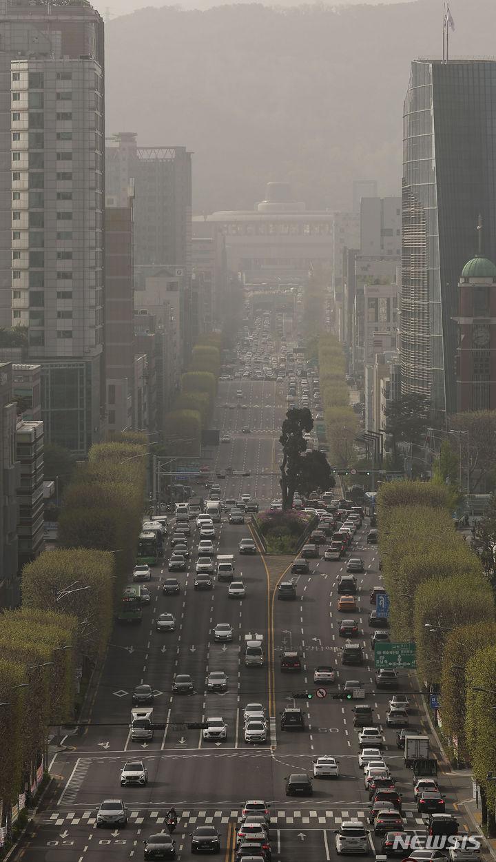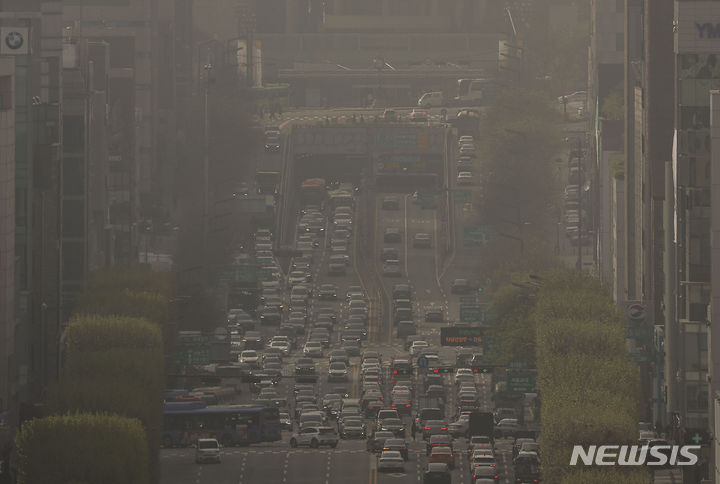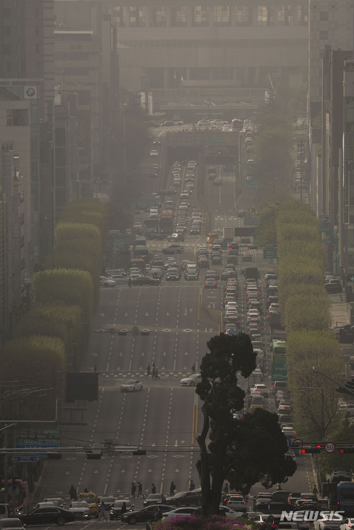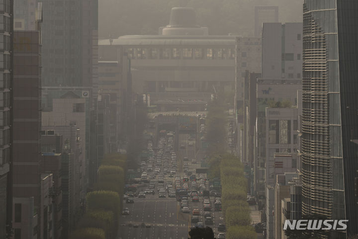 【NEWSIS】黄砂の影響で韓国全域の微小粒子状物質(PM2.5)濃度が「不良」となった17日、ソウル市瑞草区のヌエ橋(蚕橋)から見たビル街はかすんでいた。