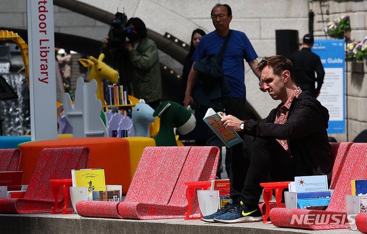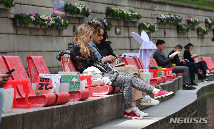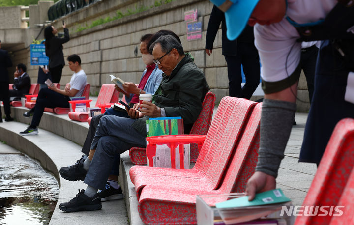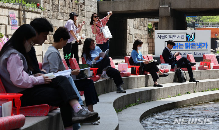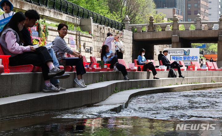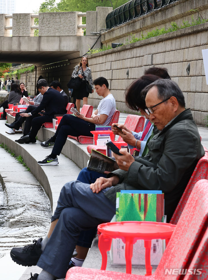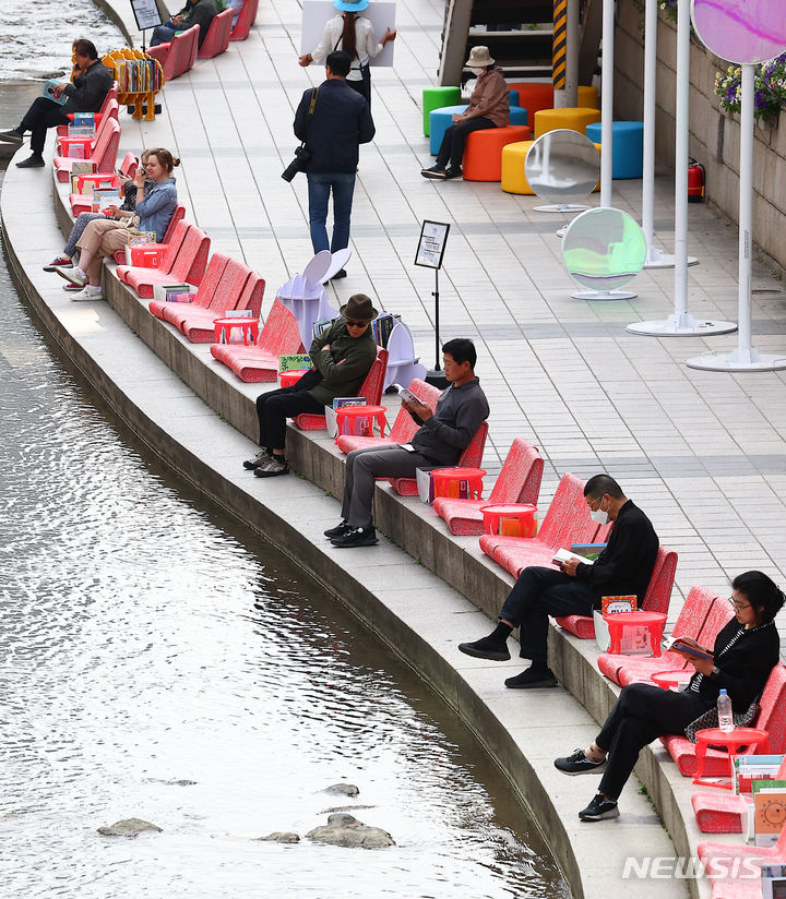ソウル野外図書館「清渓川、本読む澄んだ川辺」運営初日に当たる18日、ソウル市鍾路区の清渓川で市民たちが読書を楽しんだ。