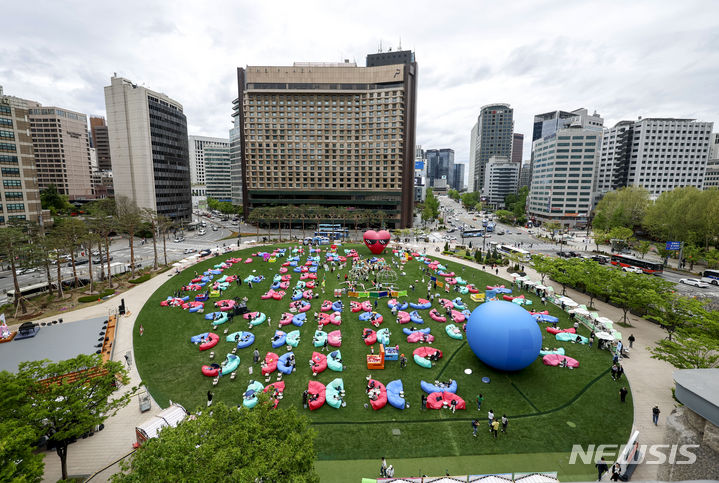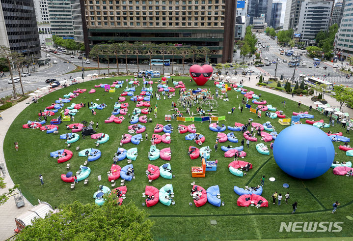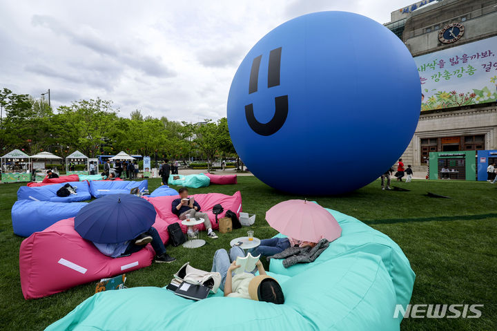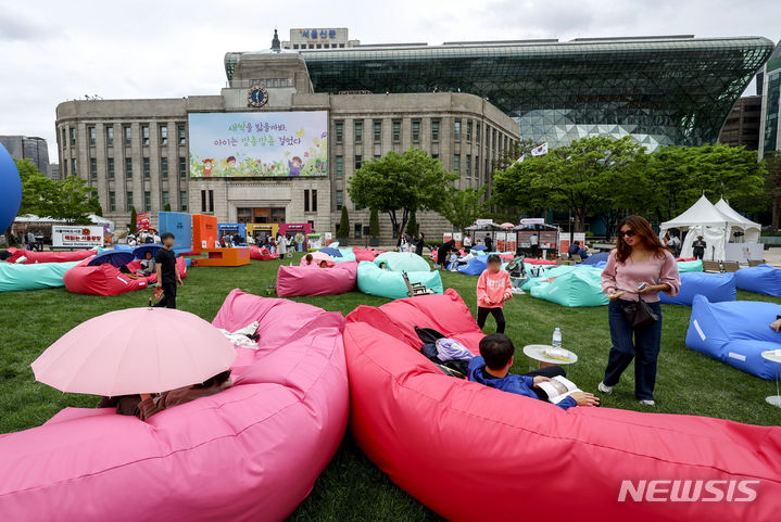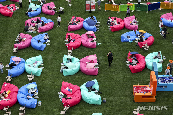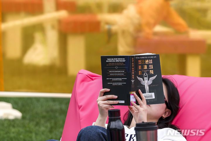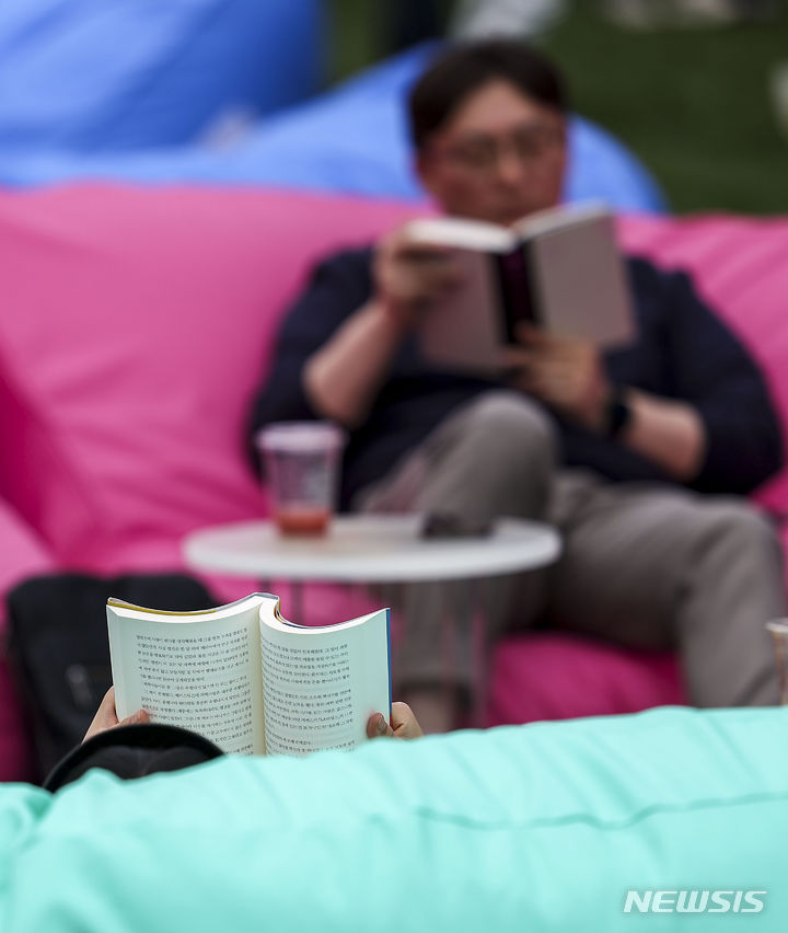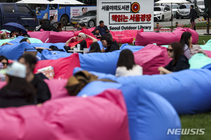 【NEWSIS】 21日、ソウル市中区のソウル広場に設けられた「本を読むソウル広場」で、くつろいで読書をする人々。