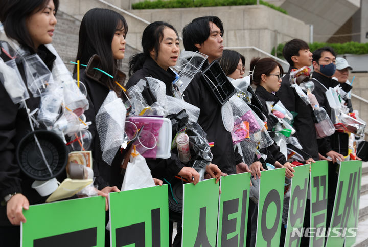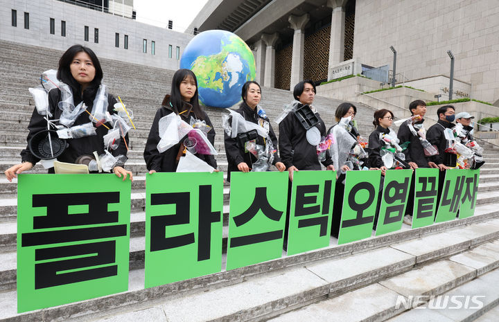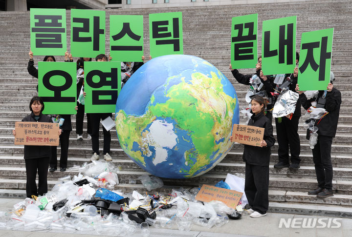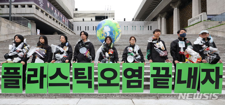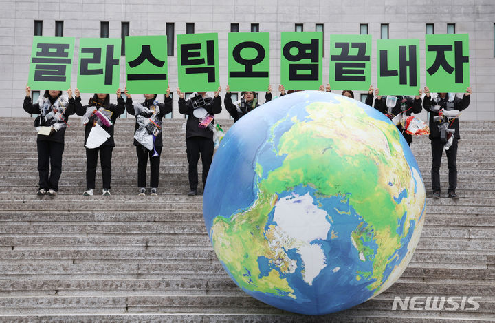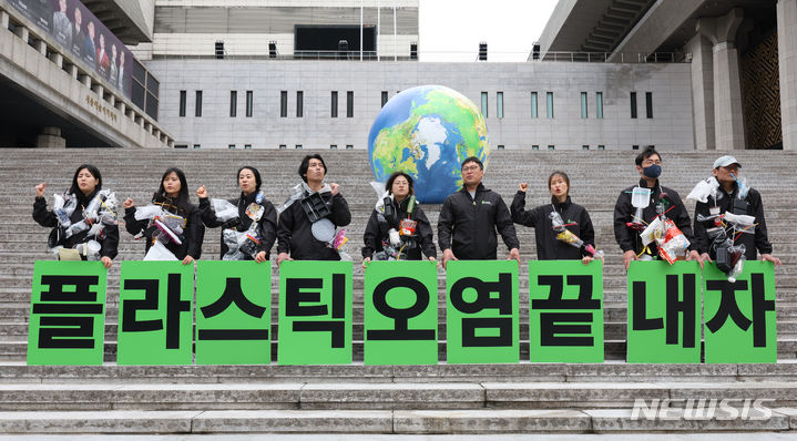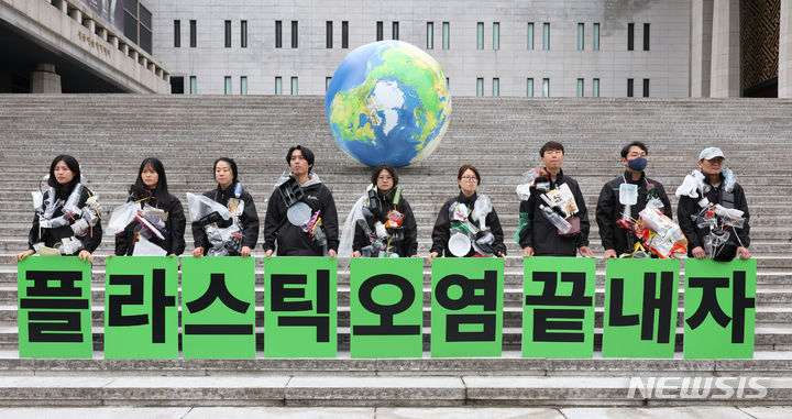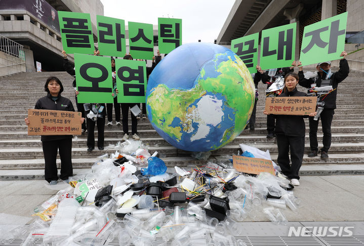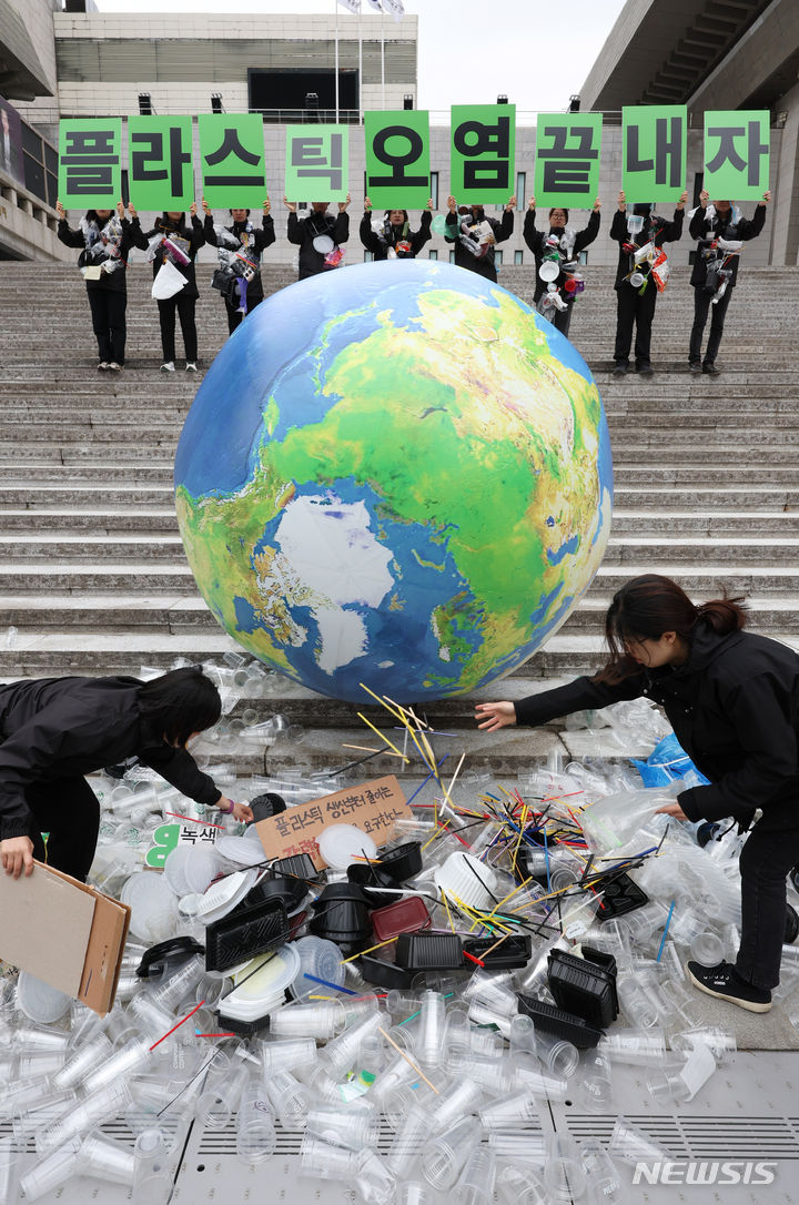 【NEWSIS】地球の環境について考える「地球の日(アースデイ)」の22日、ソウル世宗文化会館の階段で、「地球の日 プラスチック汚染を終わらせよう」という記者会見を開き、パフォーマンスをする市民団体「緑色連合」のメンバーたち。