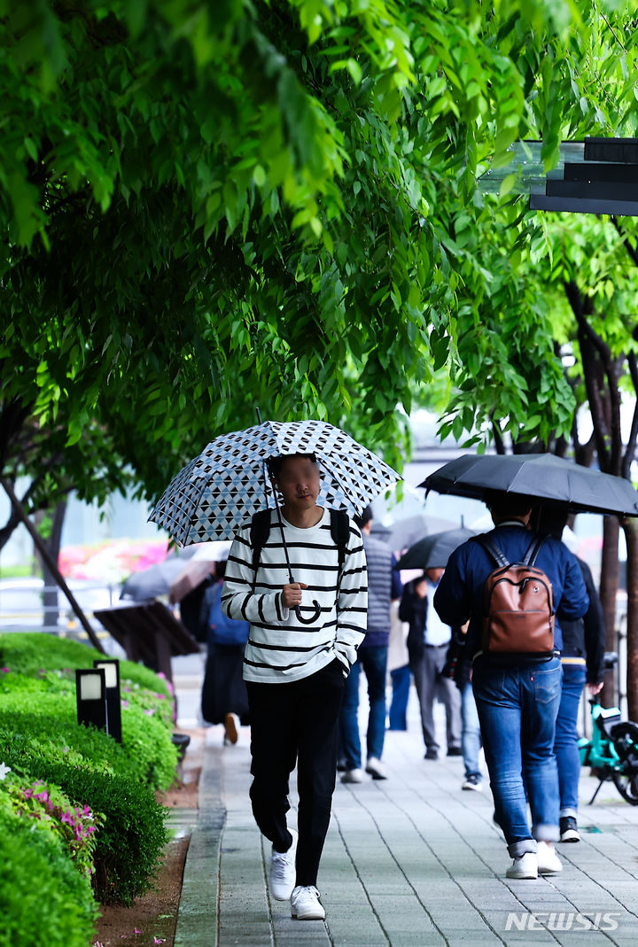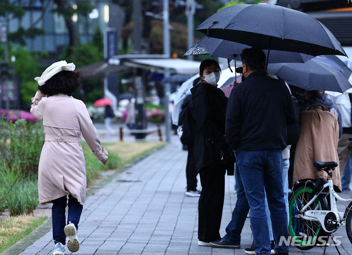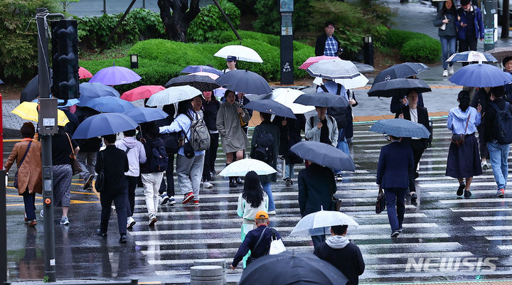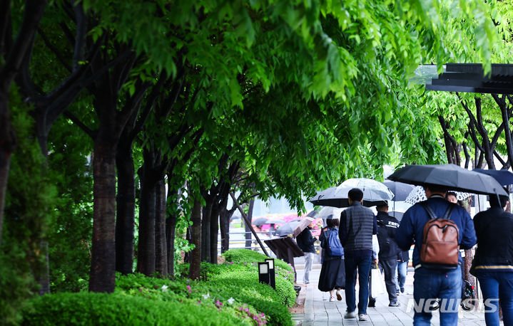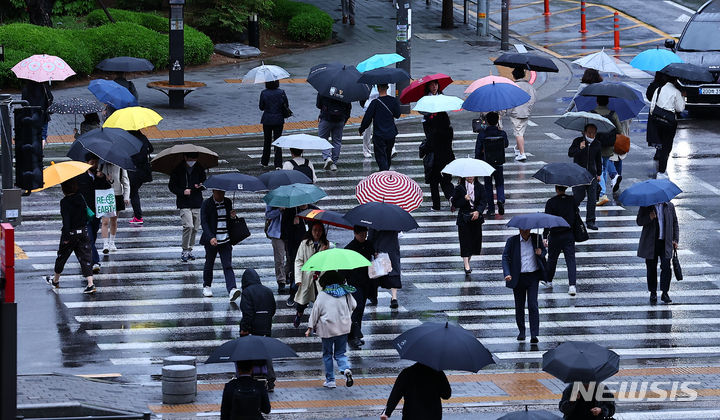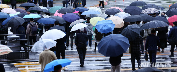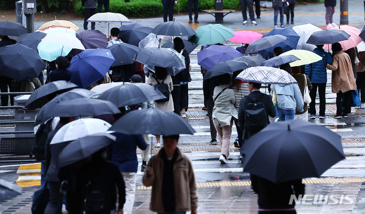 【NEWSIS】雨が降った24日午前、ソウル・竜山駅近くで、傘をさして出勤する人々。