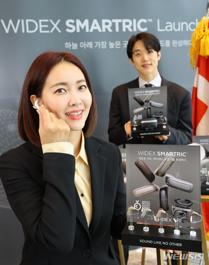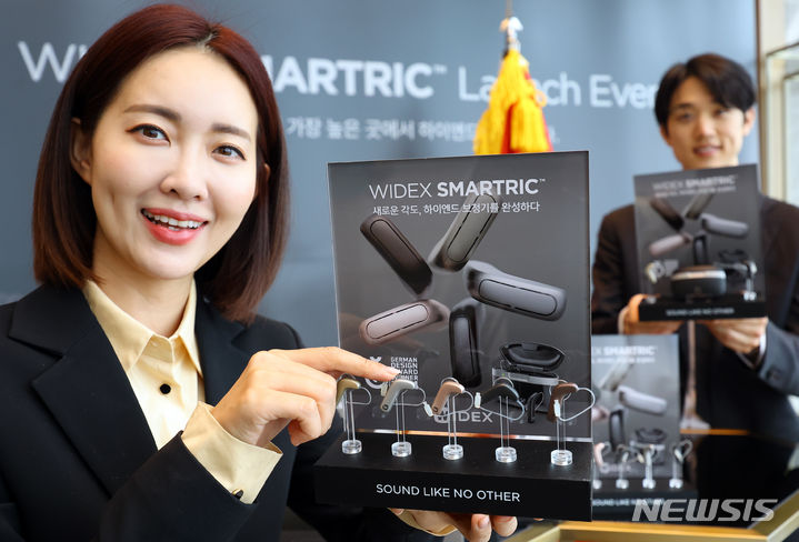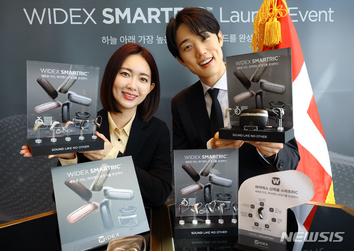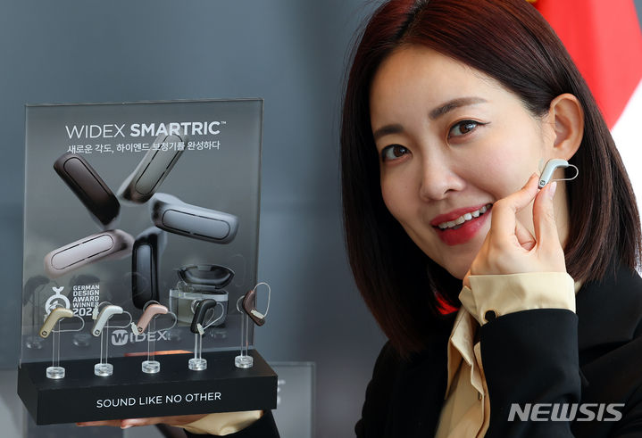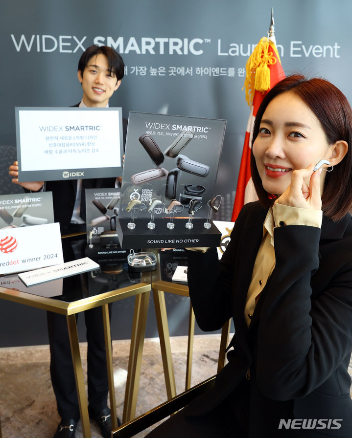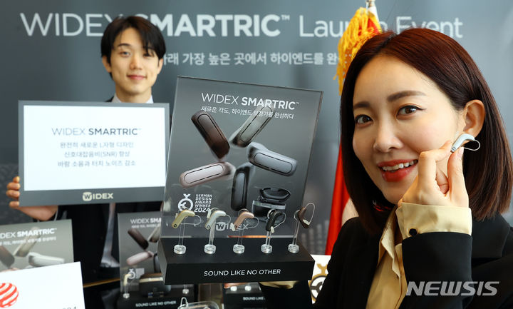 ソウル市松坡区のシグニエル・ソウルで24日、コンパニオンらがデンマークの補聴器メーカー「ワイデックス」の新商品を紹介した。29日に発売されるワイデックス・スマートRICはL字型デザインを基に、利用者中心の聴取環境を提供する。