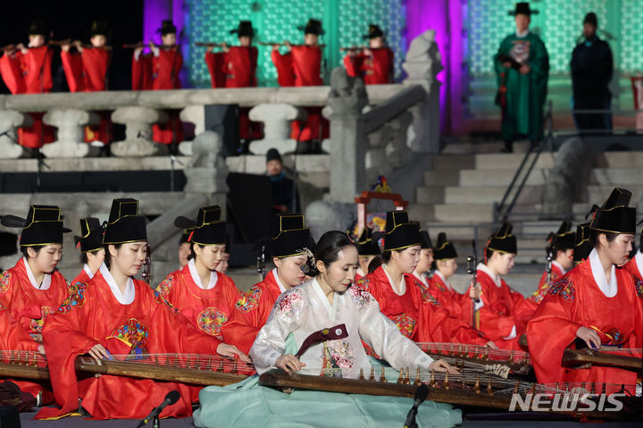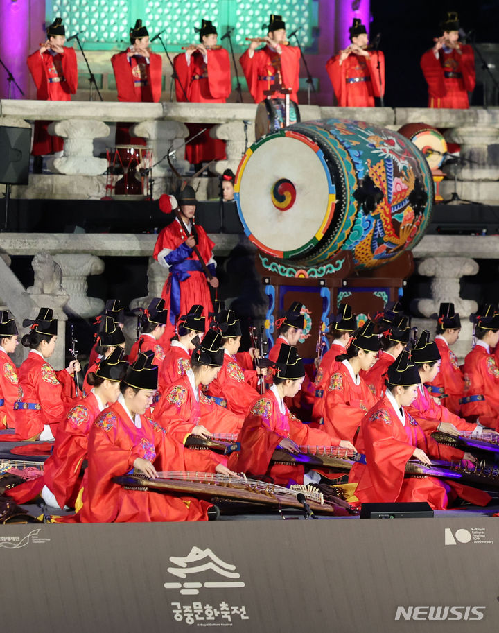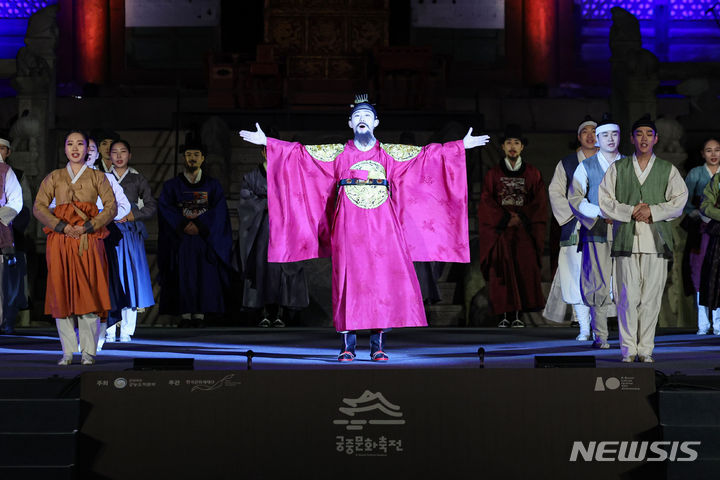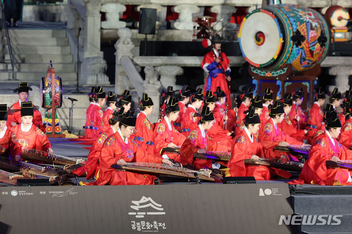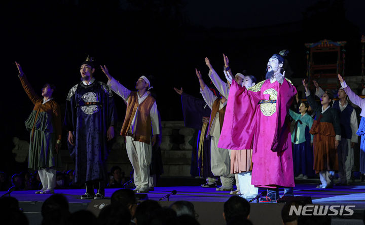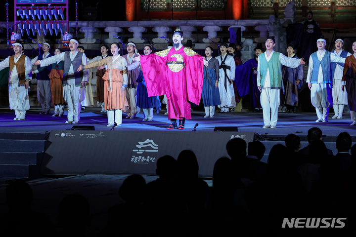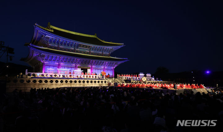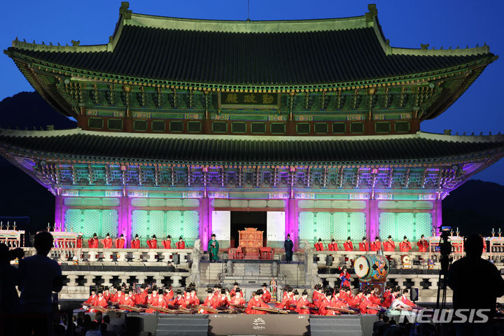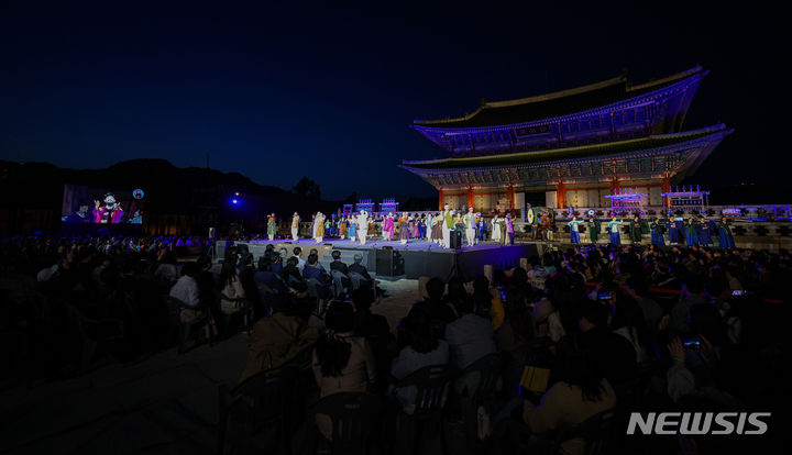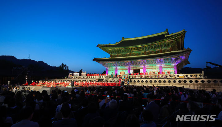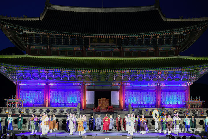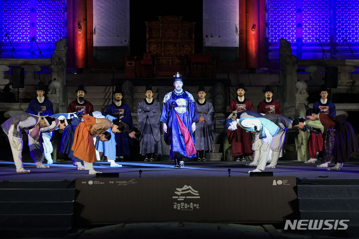 景福宮(ソウル市鍾路区)の勤政殿で26日午後、「2024宮中文化祝典」の開幕祭公演が行われている様子。「宮中文化祝典」は、26日の開幕祭を皮切りに、ソウルの5大宮と宗廟一帯で27日から来月5日まで『古宮ミュージカル-世宗、1446』『共生:時空間の重畳』などさまざまな公演と展示が行われる。