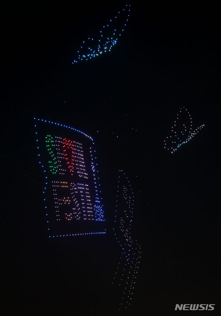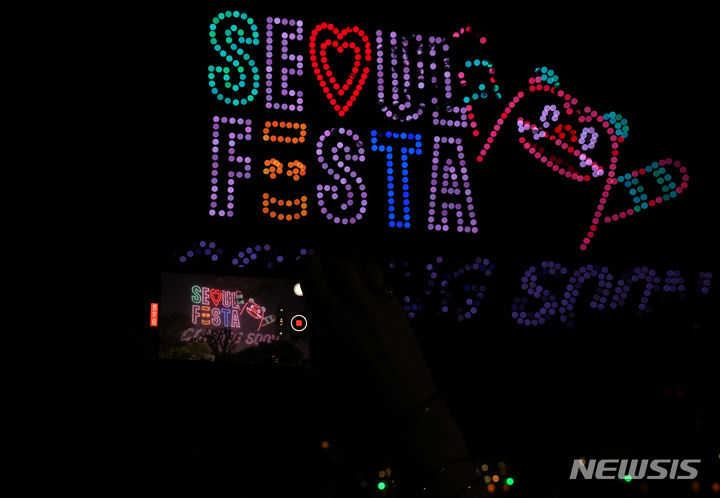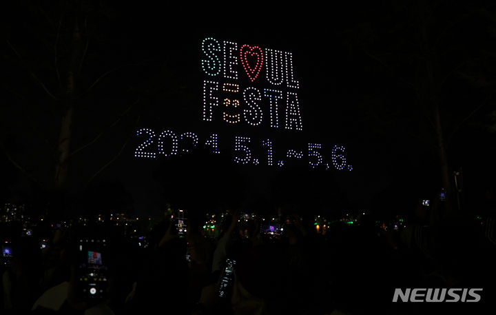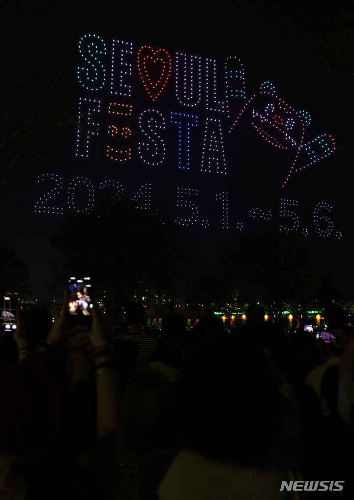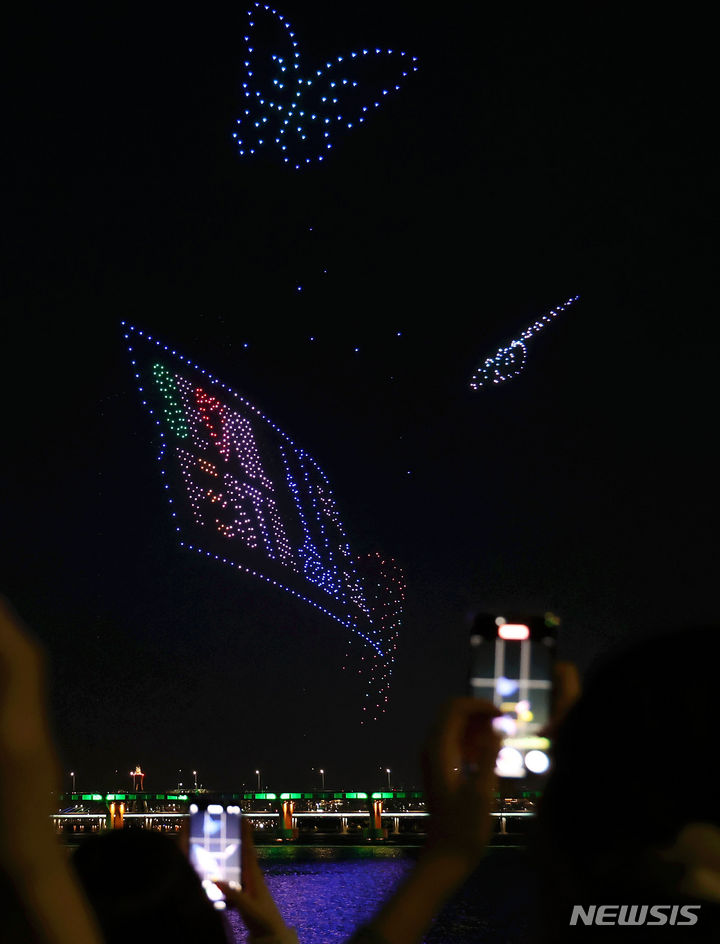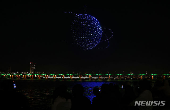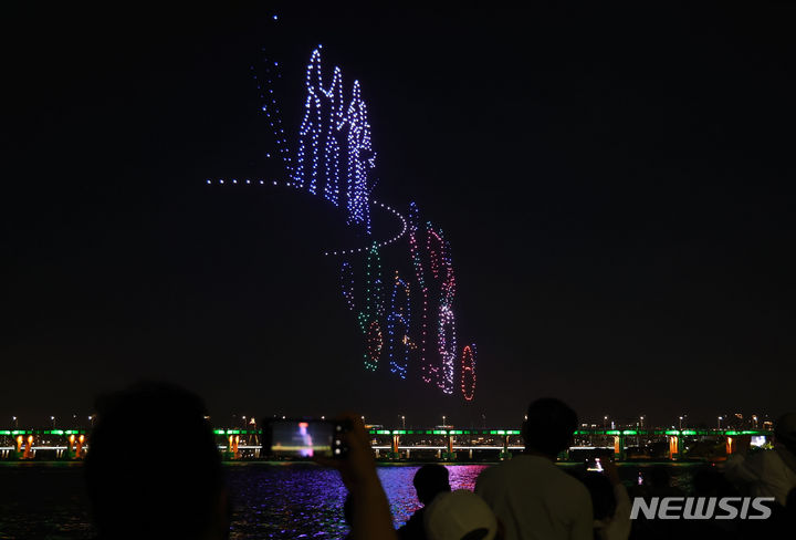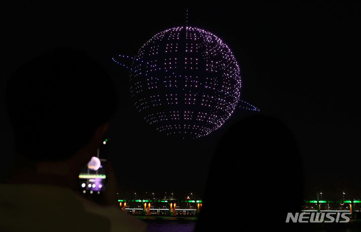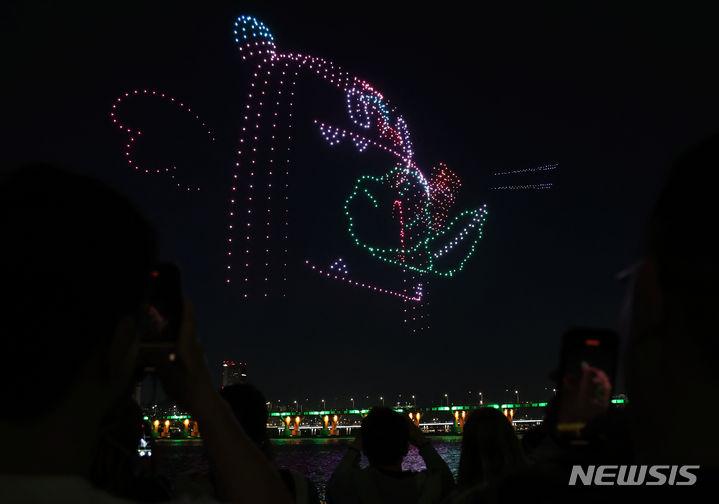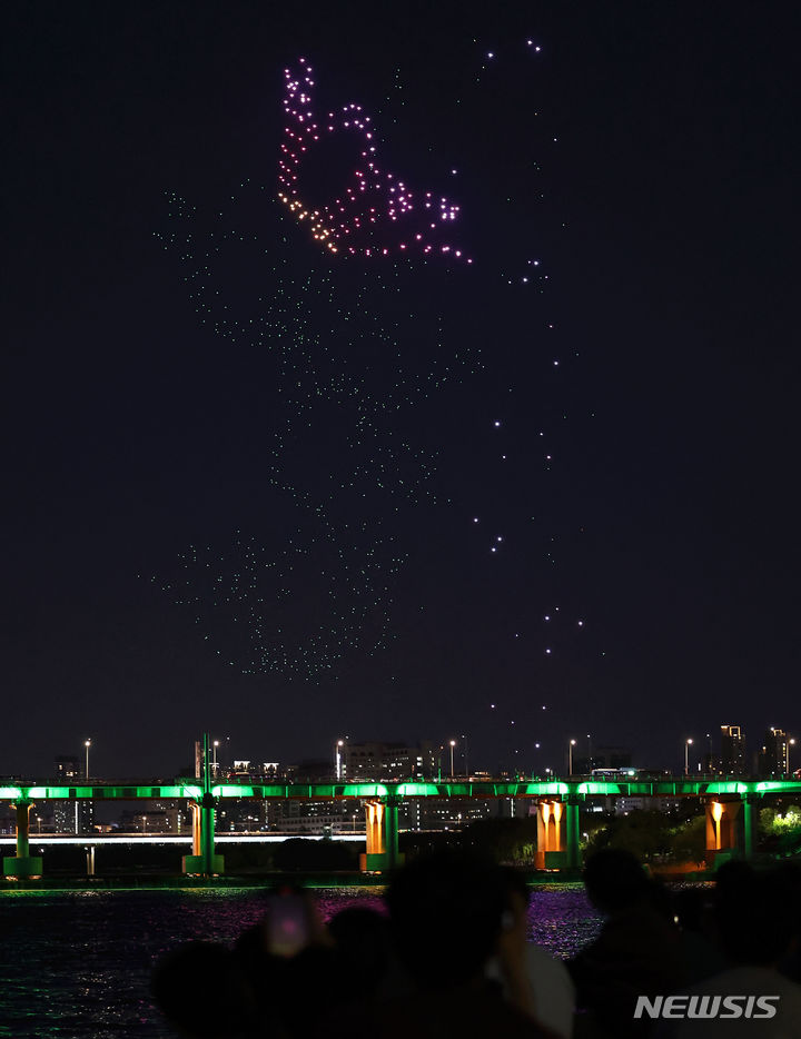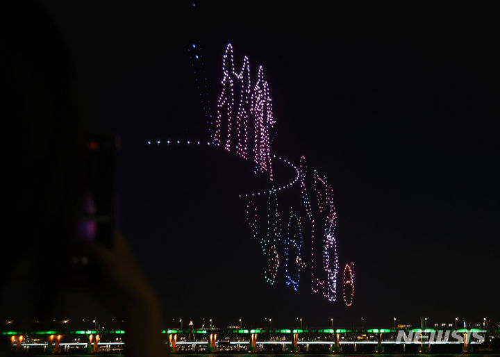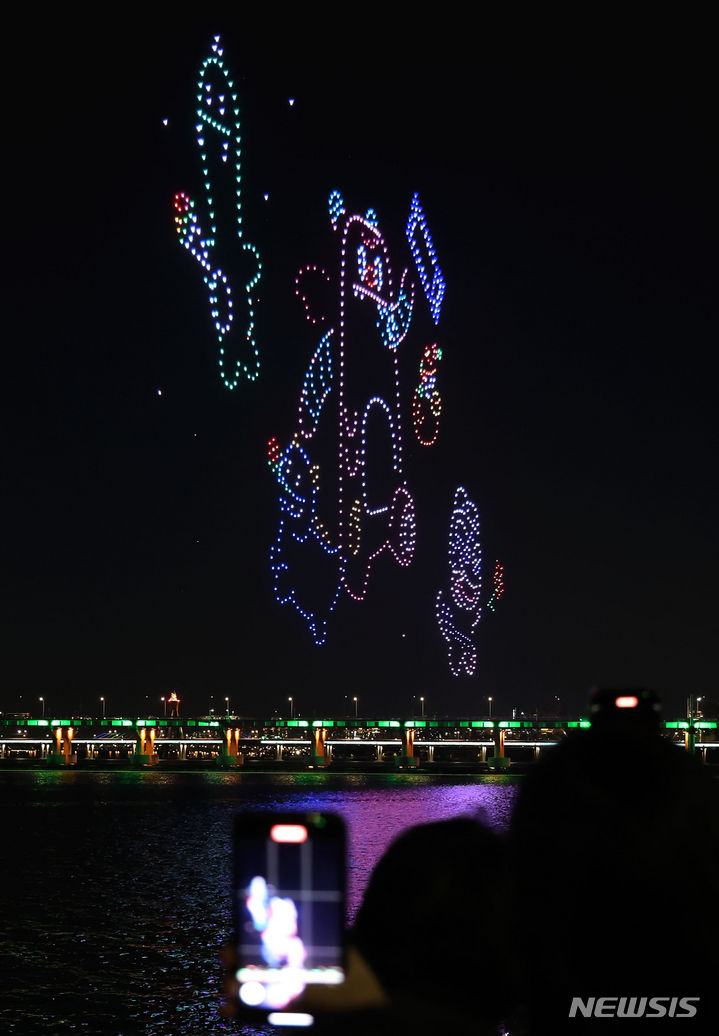 【NEWSIS】27日夜、ソウル市松坡区の蚕室漢江公園で、「2024漢江・光の公演 ドローンライトショー」が開催された。