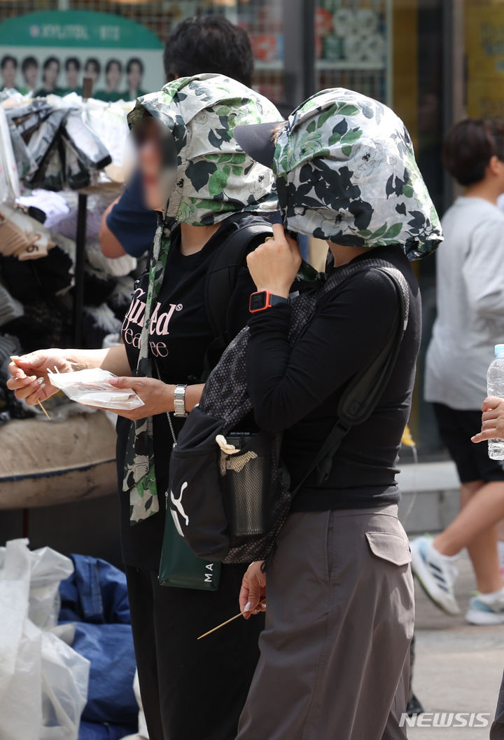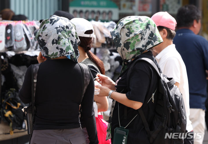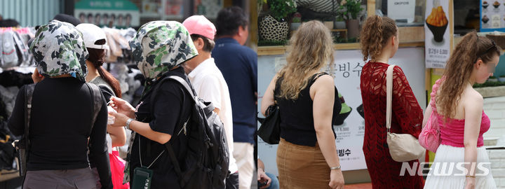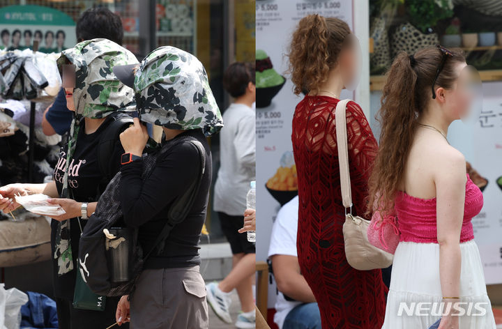 【NEWSIS】初夏の陽気となった28日、ソウルのショッピング街・明洞で、日差しを避けるために頭にハンカチをかぶったり=写真左=、肌を出したり=同右=する外国人観光客たち。