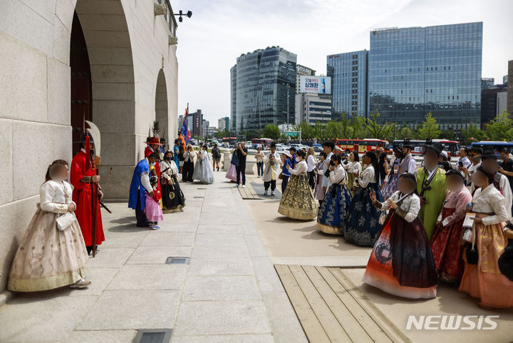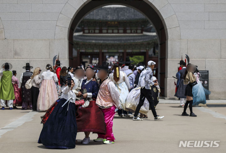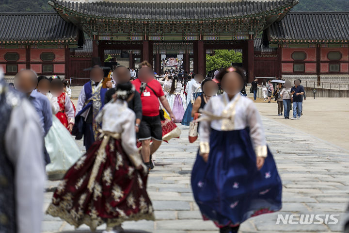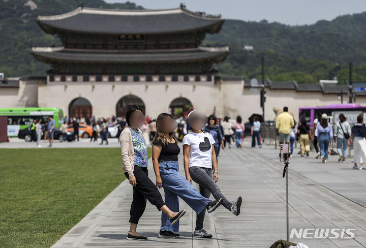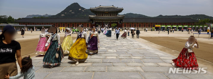 29日、ソウル市鍾路区の景福宮を見て回っている外国人観光客の様子。今年第1四半期には外国人観光客およそ340万3000人が韓国を訪れ、新柄コロナ以降の4半期記録では最大規模となった。「3月韓国観光統計」によると、今年3月に韓国を訪れた外国人観光客は149万2000人で、新型コロナ前の2019年の同じ月と比べ97.1%まで回復した。新型コロナ以降の月別回復率としては最高値だ。特に3月第4週の訪韓観光客は、2019年の同じ週に比べ100.2%回復して33万人を記録し、新型コロナ前を上回った。