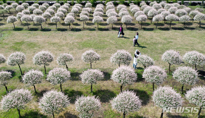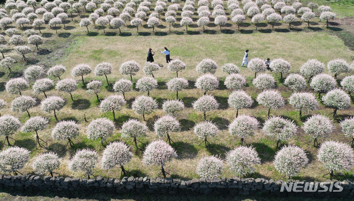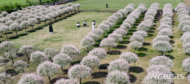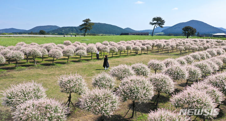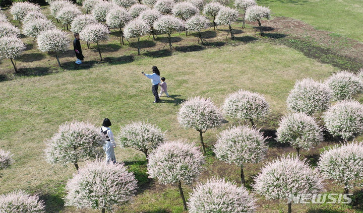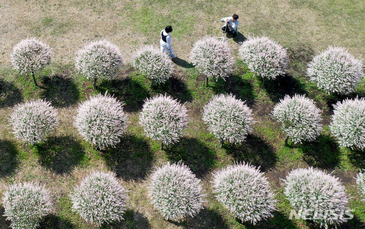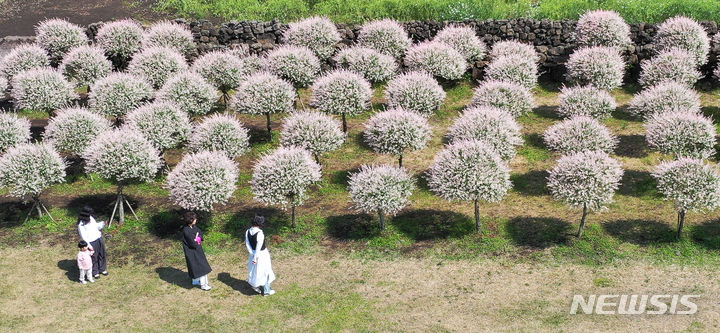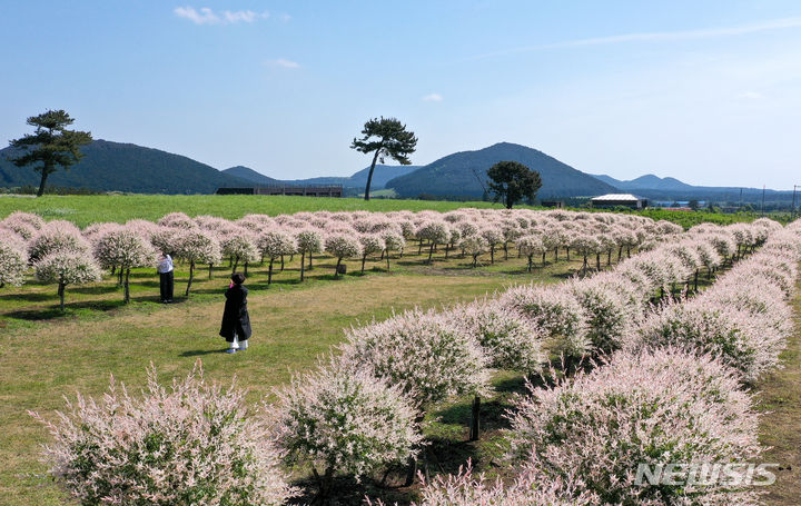 晴天となった2日午前、済州市西帰浦市表善面のボロムワット農場を訪れた観光客たちが、イヌコリヤナギをバックに写真を撮りながら楽しいひとときを過ごしている。