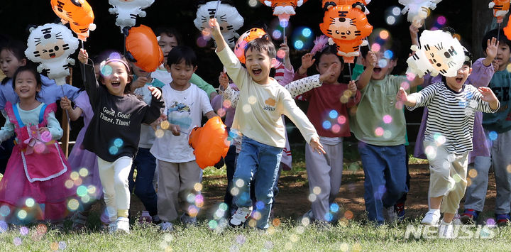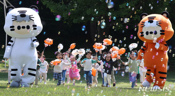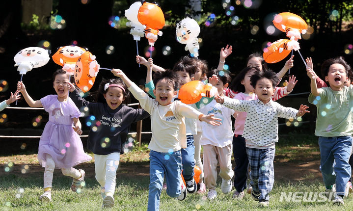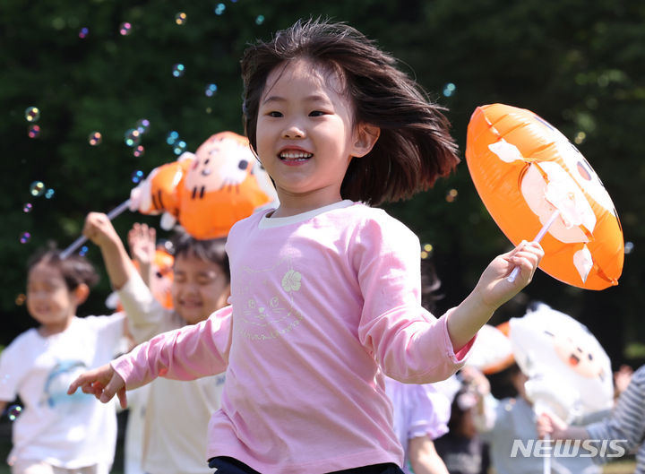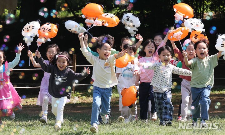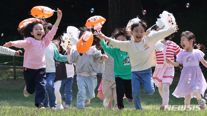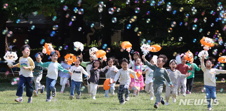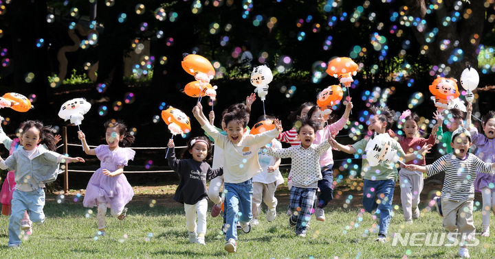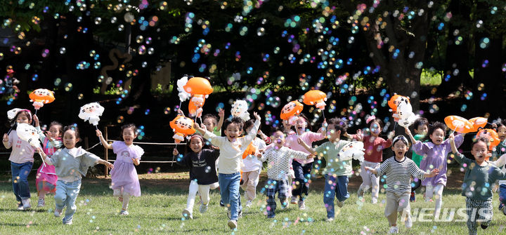 子どもの日を三日後に控えた2日午前、ソウル市松坡区のオリンピック公園内にある漢城百済博物館前の地球村公園で、園児らがしゃぼん玉遊びをしながら楽しいひとときを過ごした。