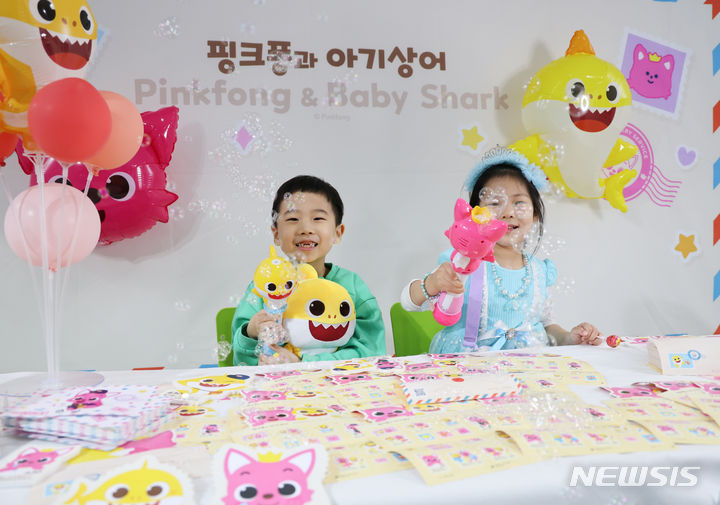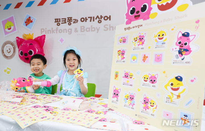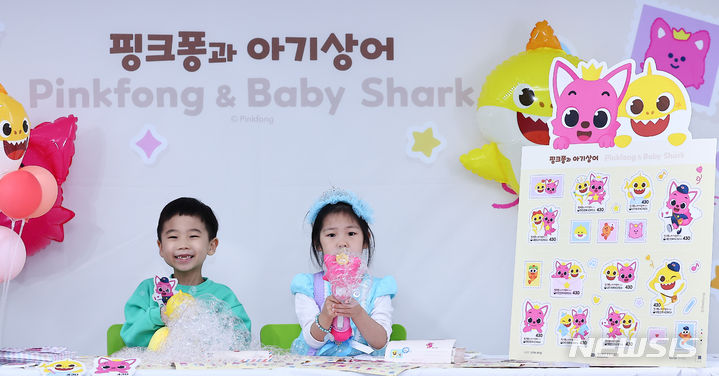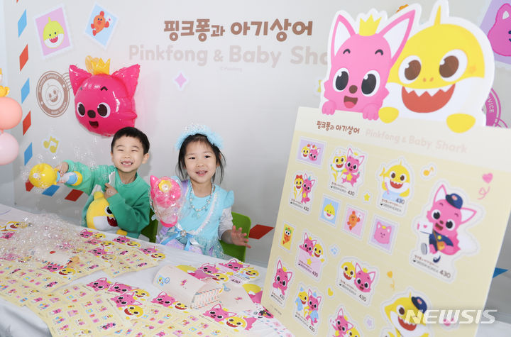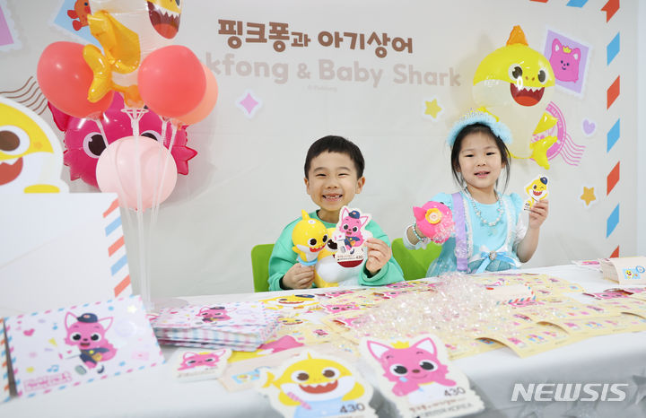 ソウル市中区のソウル中央郵便局で2日、「ピンキッツとちびザメ」記念切手発表イベントが行われ、キッズモデルたちが明るい笑顔を見せている。