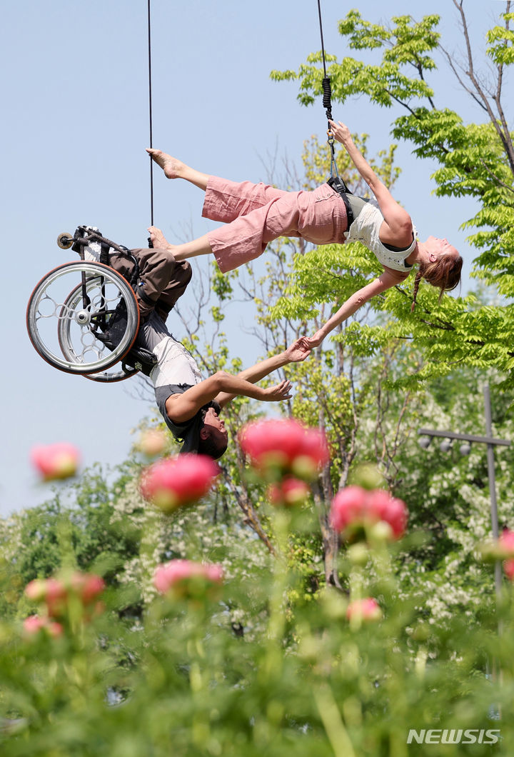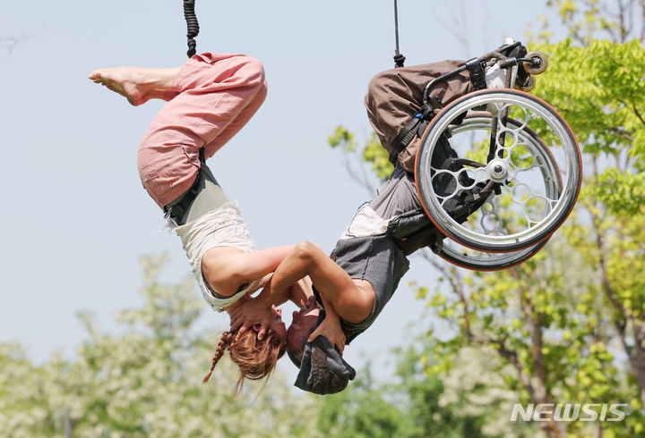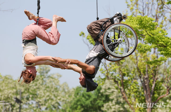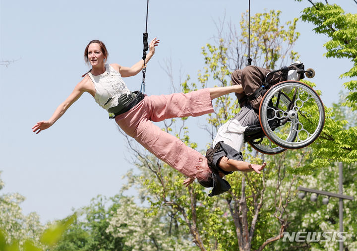 こどもの日の連休が迫った3日、ソウル市竜山区のノドゥルソムで開かれた「2024ソウル・サーカスフェスティバル」の主要作品試演会で、クロエ・ロフタス&ロドニー・ベル(Chloe Loftus & Rodney Bell)が「私たちの間の空気(The Air Between Us)」の公演を披露している。きたる4日・5日の両日行われる韓国唯一のサーカスの祭典「ソウル・サーカスフェスティバル」では、伝統的な演戯から現代作品に至るまで、韓国国内および海外のサーカス公演17本とサーカスを直接体験してみることができるプログラムが披露される予定だ。