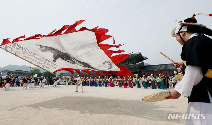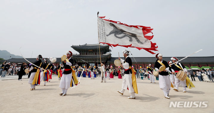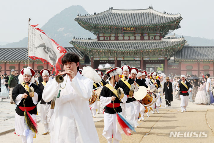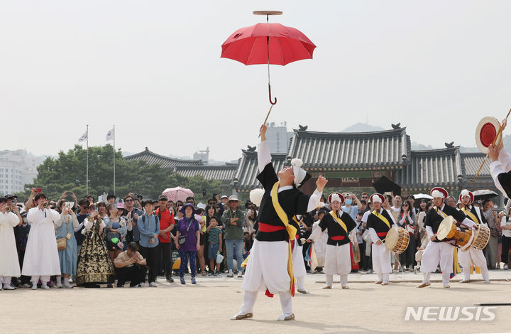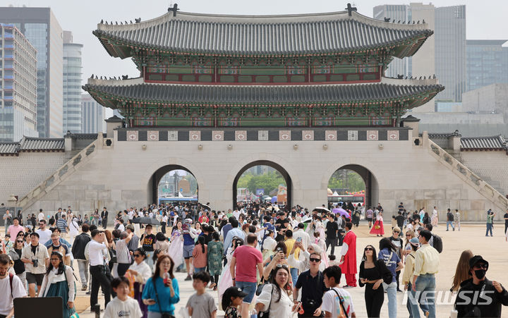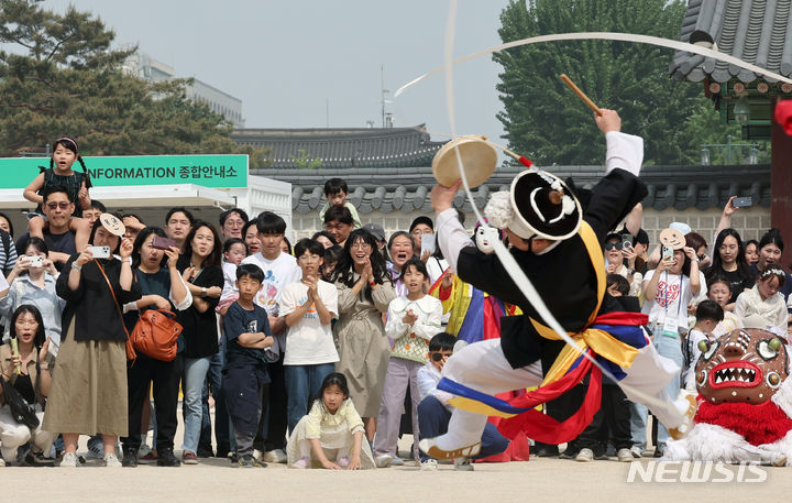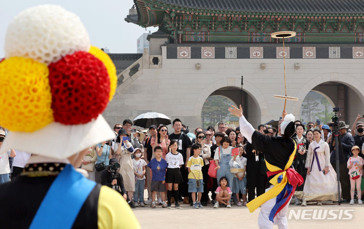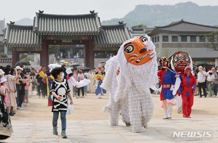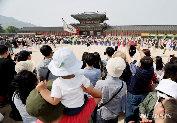 こどもの日の連休が始まった4日午後、ソウル市鍾路区の景福宮を訪れた子どもたちや家族連れが、「宮中文化祝典」のキルノリ(伝統芸能公演に先立って行われるパレード)を見ながら楽しいひとときを過ごしている様子。