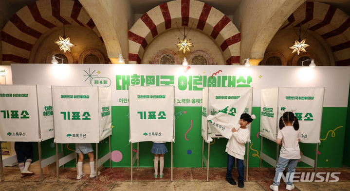 【NEWSIS】「こどもの日」の5日午前、ソウル市松坡区のテーマパーク「ロッテワールド」で、「開かれた緑の傘 第4回大韓民国子ども大賞児童権利授賞式」の記念行事が行われた。写真は投票する子どもたち。