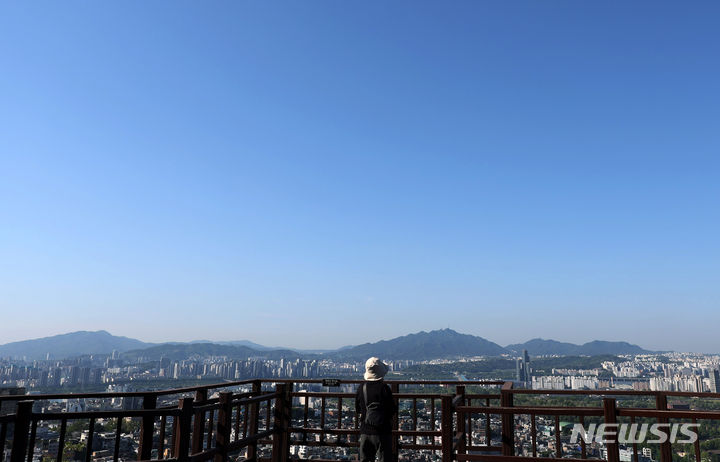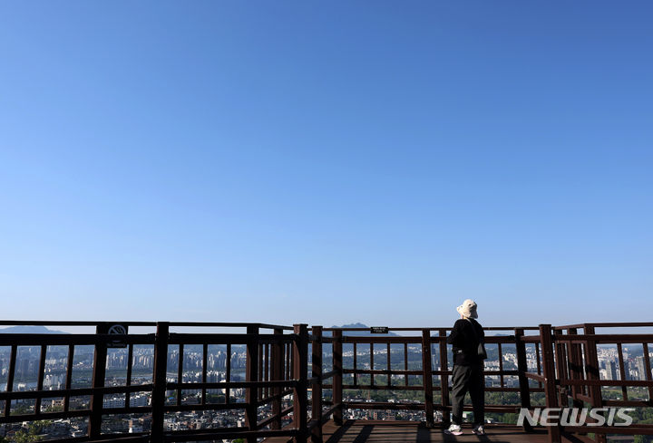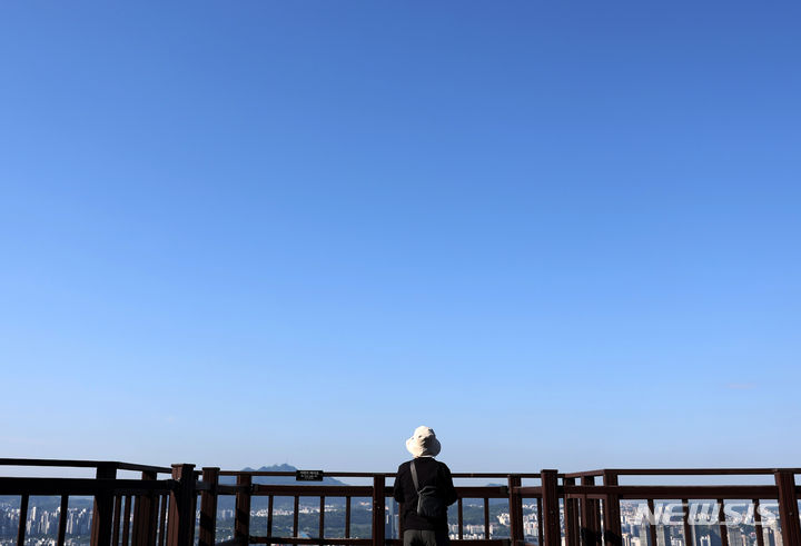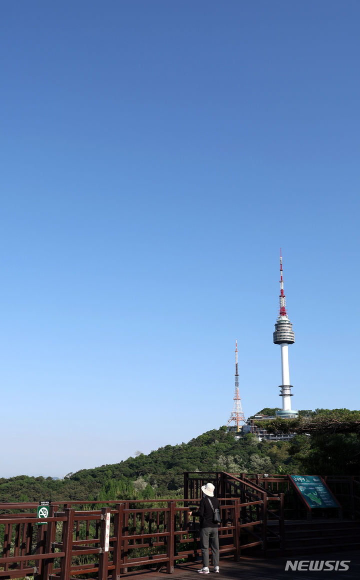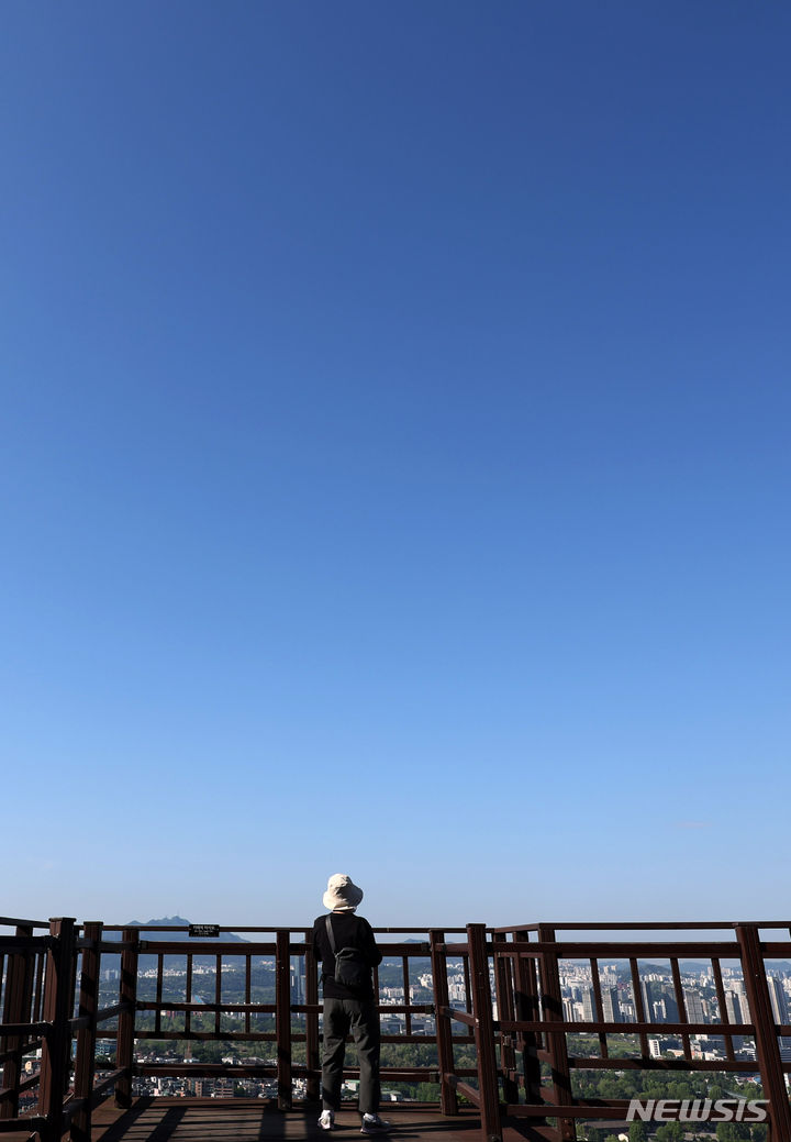 雨が上がり晴天となった8日午前、ソウル市竜山区の南山で、市民が青空を眺めている。