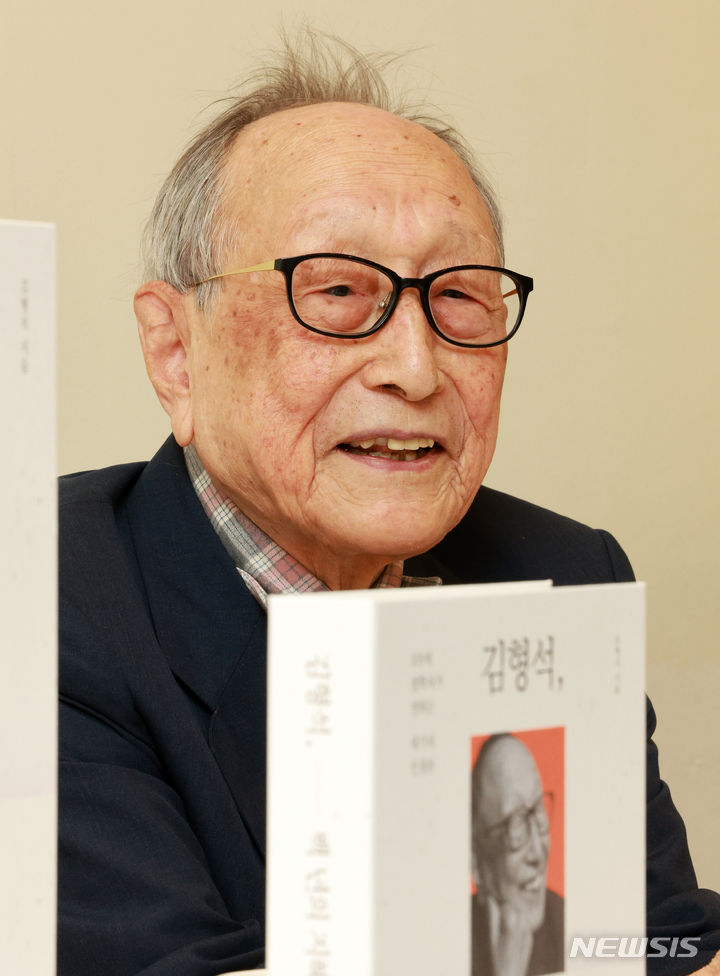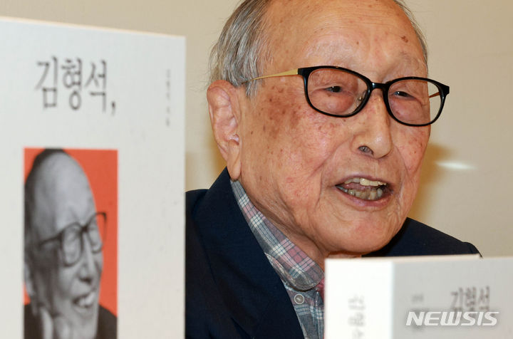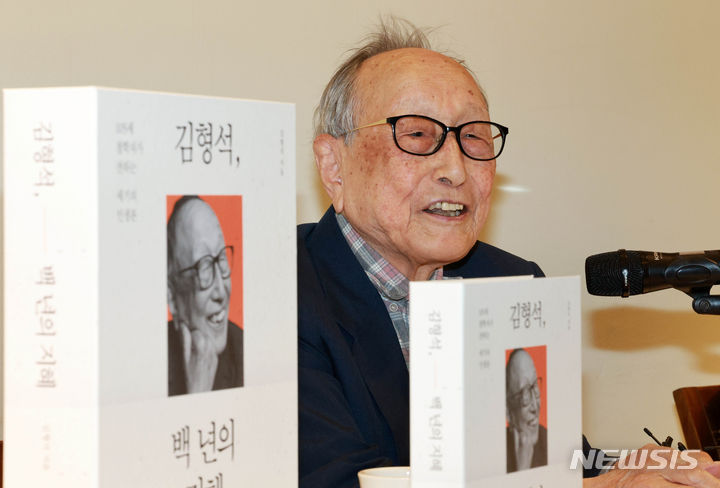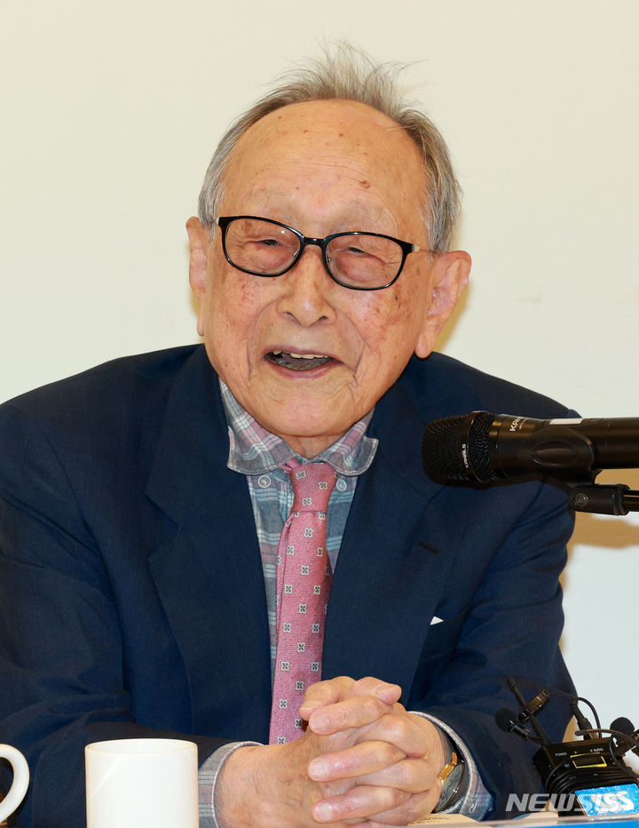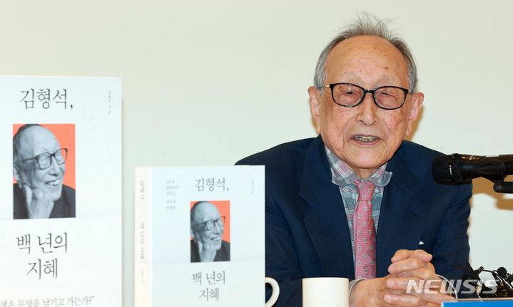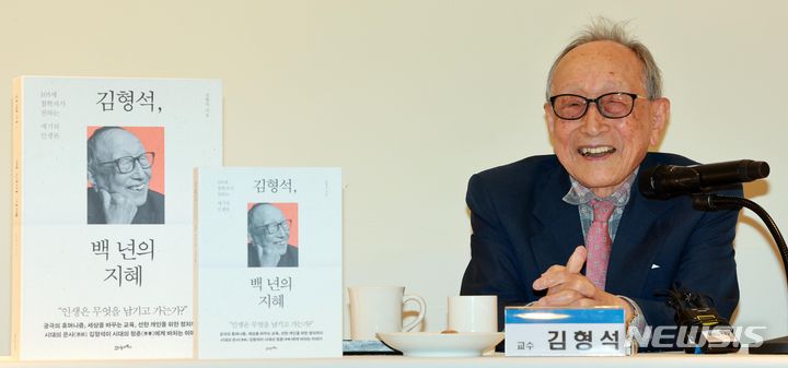 104歳の哲学者・金亨錫(キム・ヒョンソク)延世大学名誉教授が9日午前、ソウル市中区のカンファレンスハウス・タルゲビで開催された「金亨錫、百年の知恵」出版記念記者懇談会で発言をする様子。