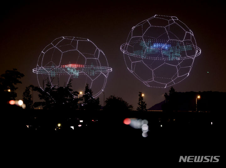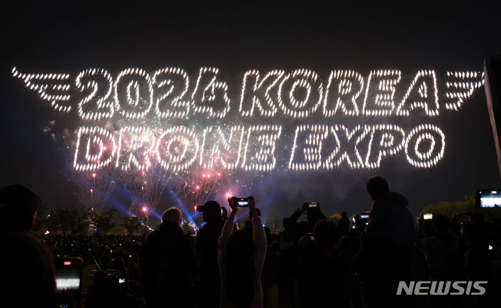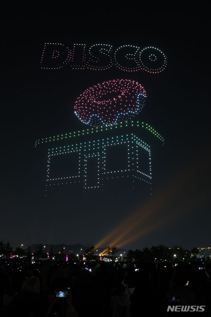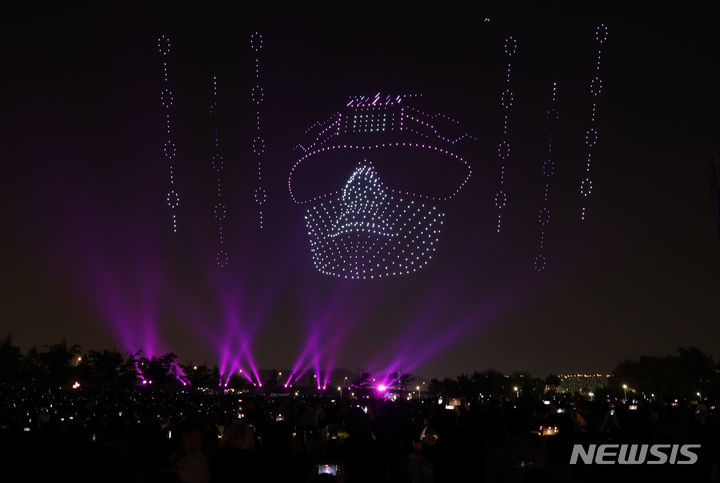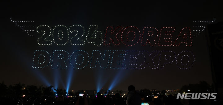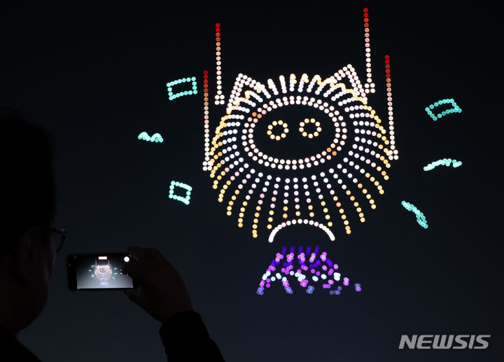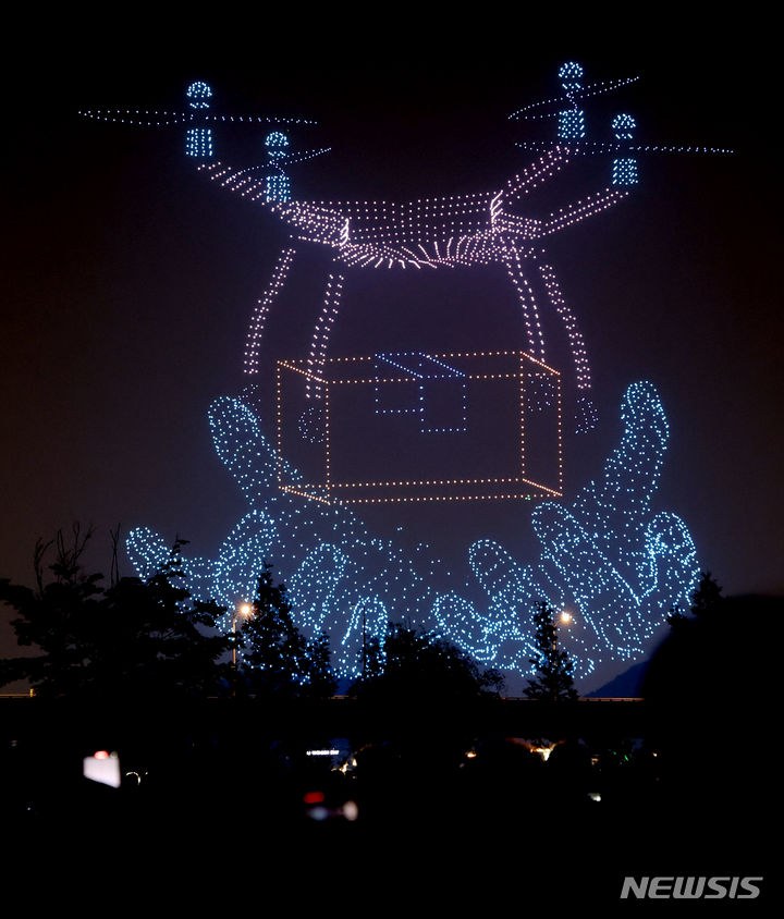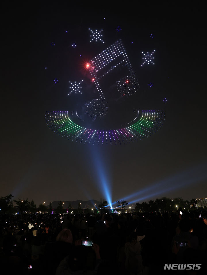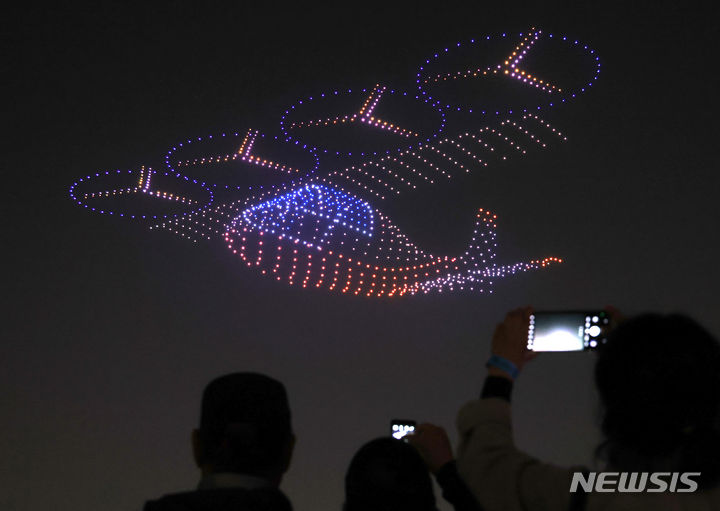 【NEWSIS】9日午後、仁川市延寿区の松島月光公園で、「2024ワールド・ドローン・ライトショー」が開催された。写真はドローン4,500台によるドローン飛行ショーの様子。