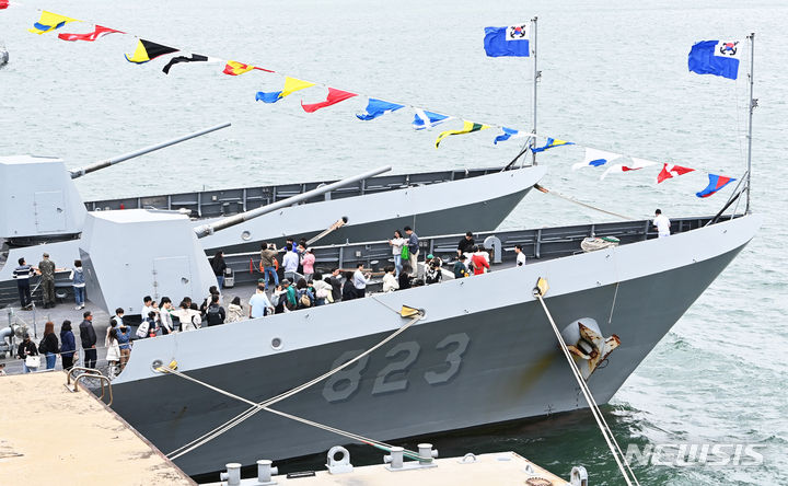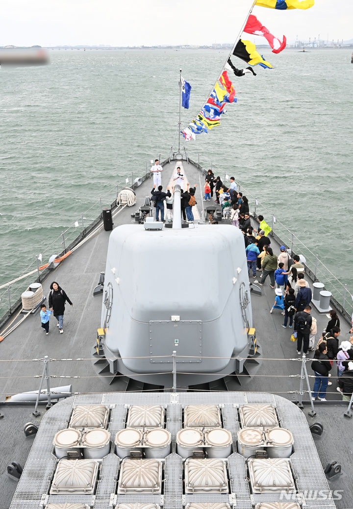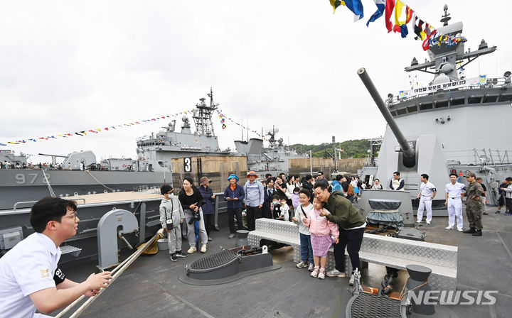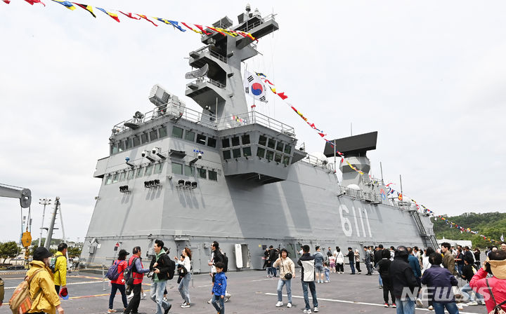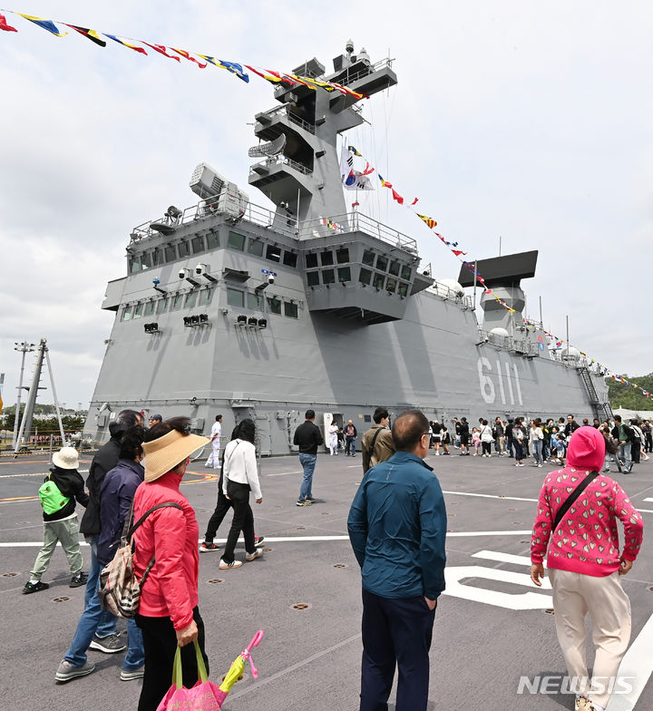 【NEWSIS】第2回海洋フェスティバルが開催された11日、京畿道平沢市の韓国海軍第2艦隊司令部を訪れ、韓国海軍の大型揚陸艦「独島」(1万4000トン級)で乗船体験をする人々。同フェスティバルには大韓民国の海洋を守る主な戦力である「独島」のほか、駆逐艦「乙支文徳」、護衛艦「大田」の公開、韓国海軍・海兵隊の機動装備展示、各種体験館、祝賀ライブなど多彩な催しが行われた。
