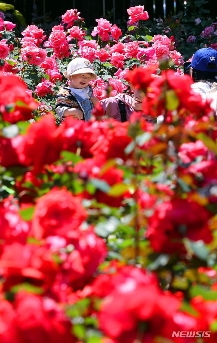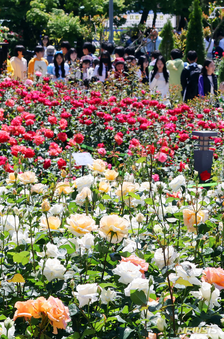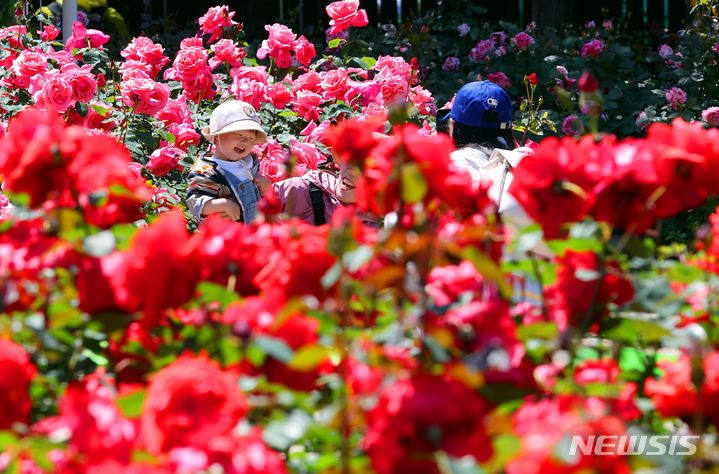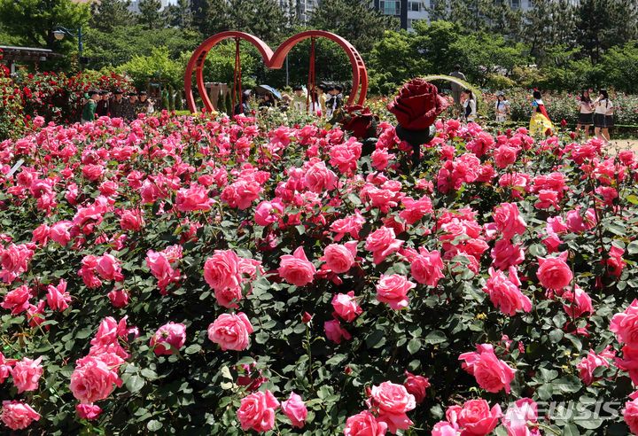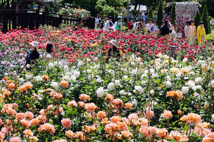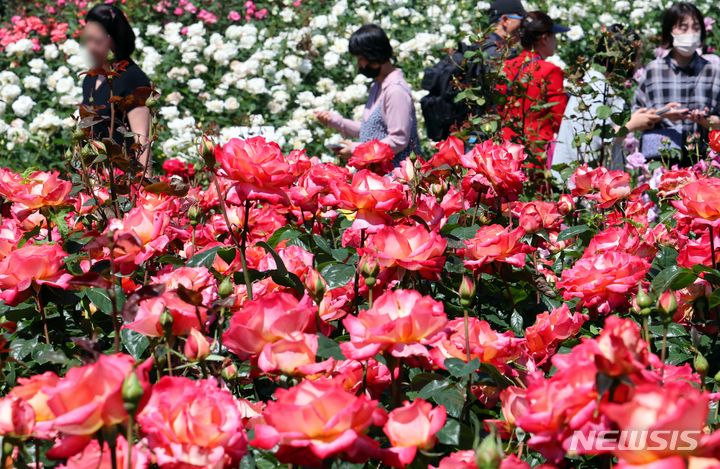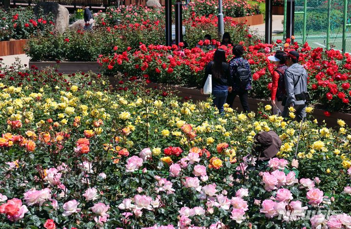 13日、釜山市北区華明洞のバラ園を訪れた市民が、大きく花開いたバラの花畑で散策を楽しんでいる様子。このバラ園では1万8950平方メートルの敷地に49種類のバラ、1万2860株が植えられている。