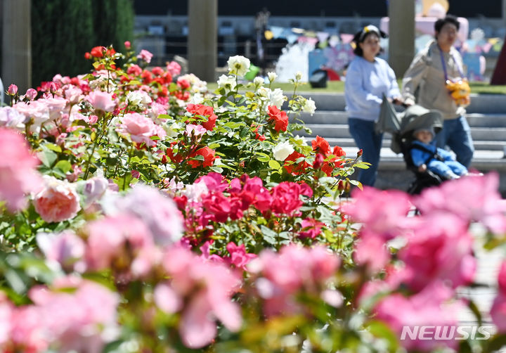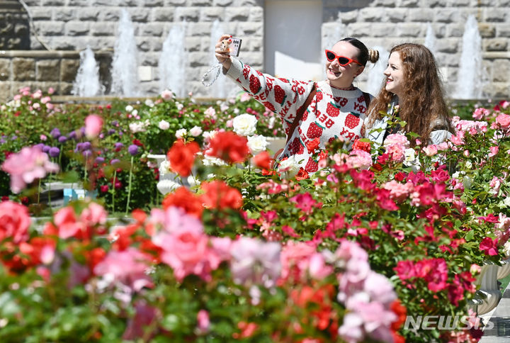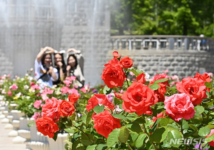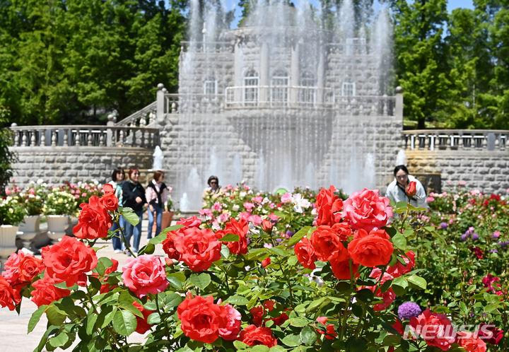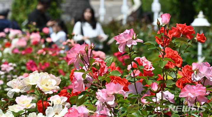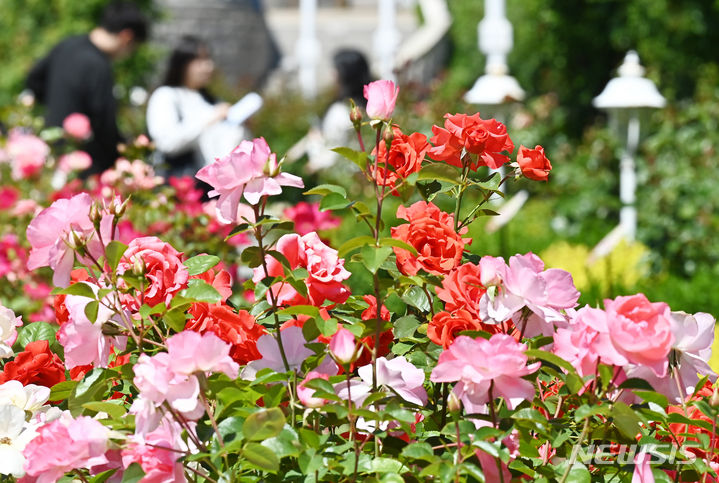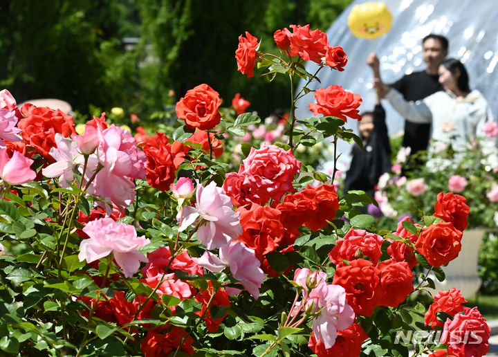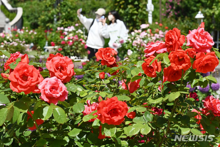 【NEWSIS】エバーランド・バラ祭りがあすに迫った16日、京畿道竜仁市のエバーランド・ローズガーデンでは、訪れた人々が大きく咲いたバラの花を見て回っていた。