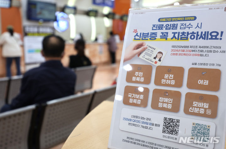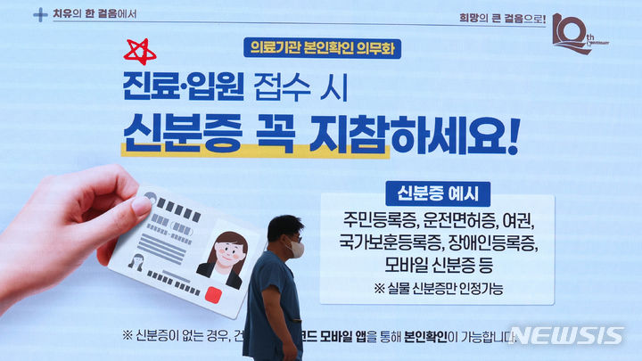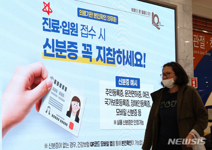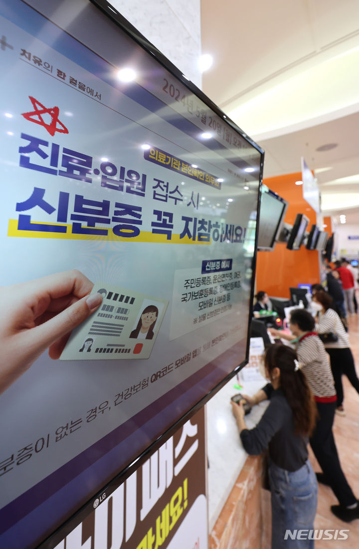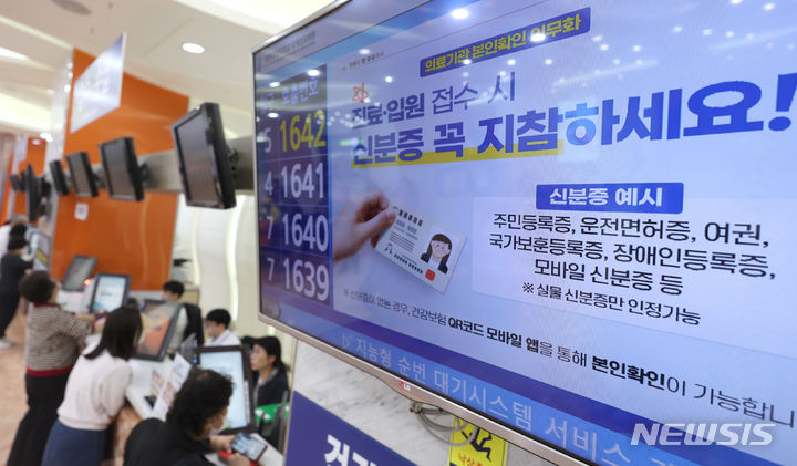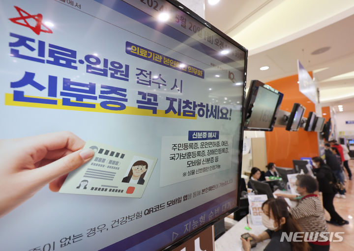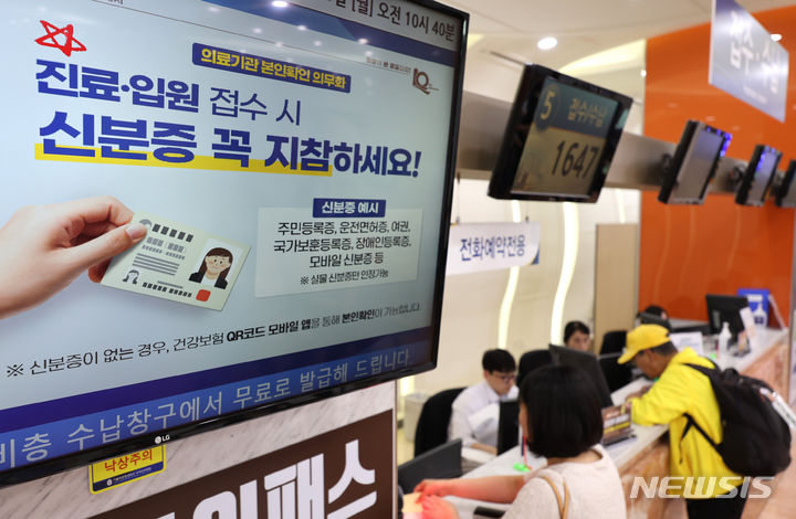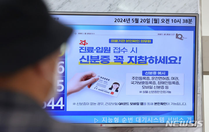 「療養機関本人確認強化制度」が施行された20日、仁川市西区にある国際聖母病院の受付窓口モニターに、身分証持参の案内文が表示されている様子。