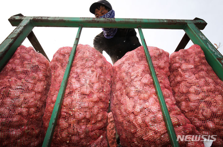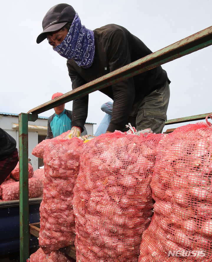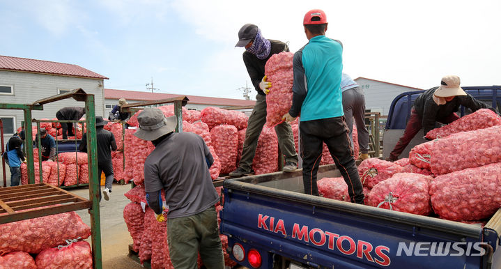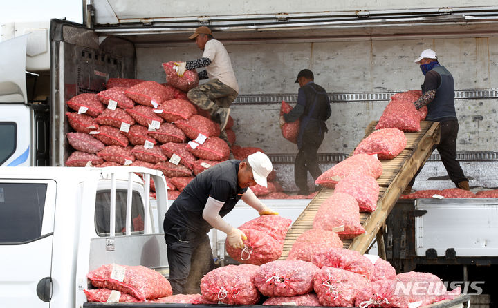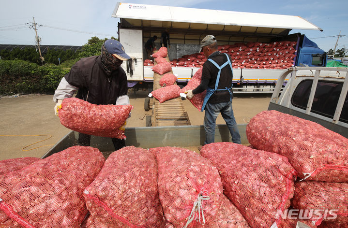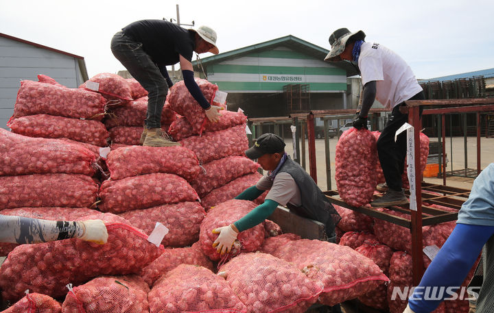 済州島西帰浦市大静邑の大静農協流通センターで20日午前、他の地域に先駆けて初のニンニク買い上げが行われている様子。