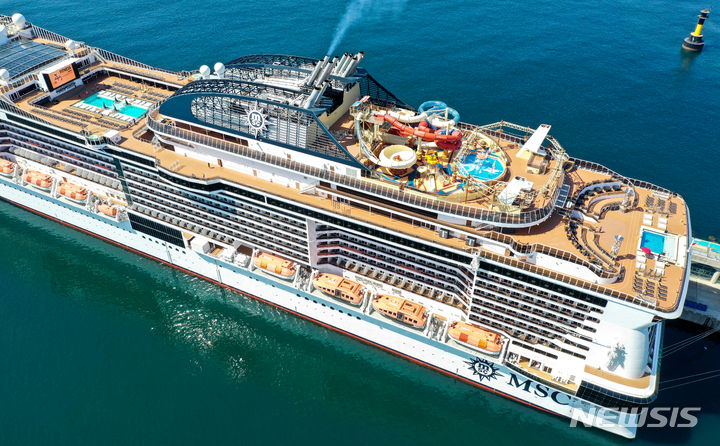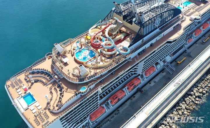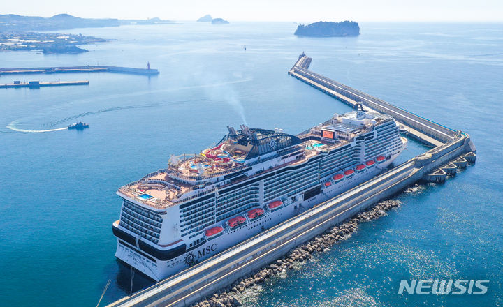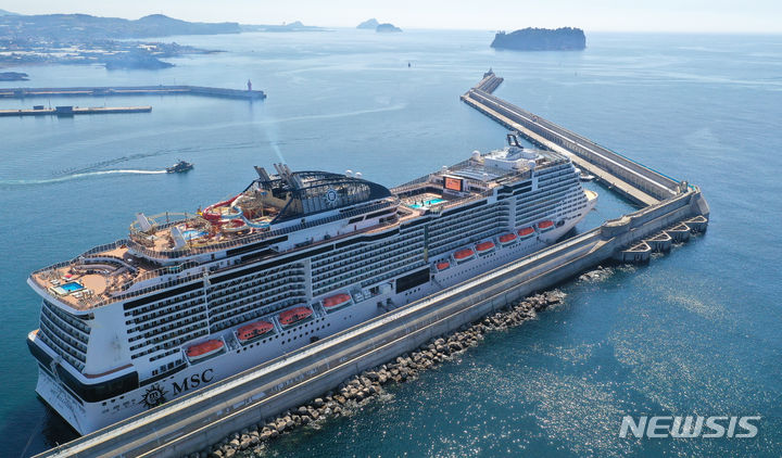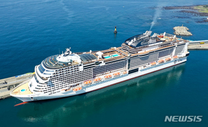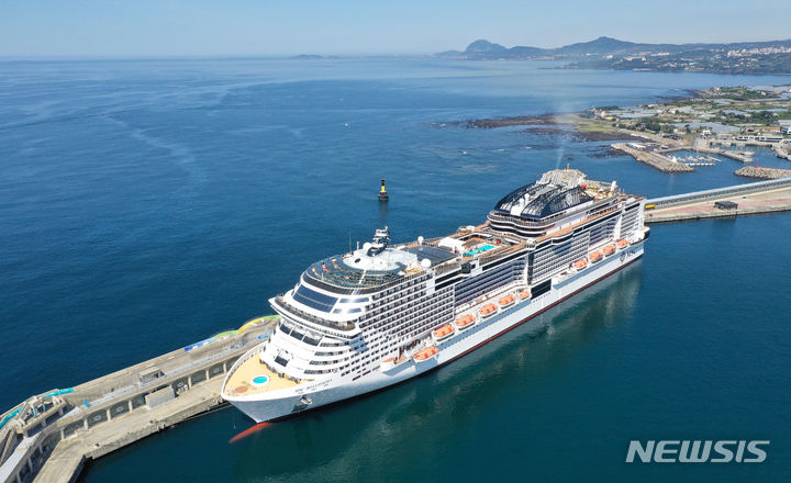21日午前、済州道西帰浦市の江汀クルーズ・ターミナルに、日本人観光客を乗せて入港した17万トン級の豪華客船MSCベリッシマが停泊している。