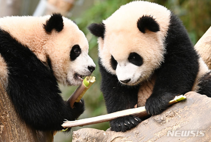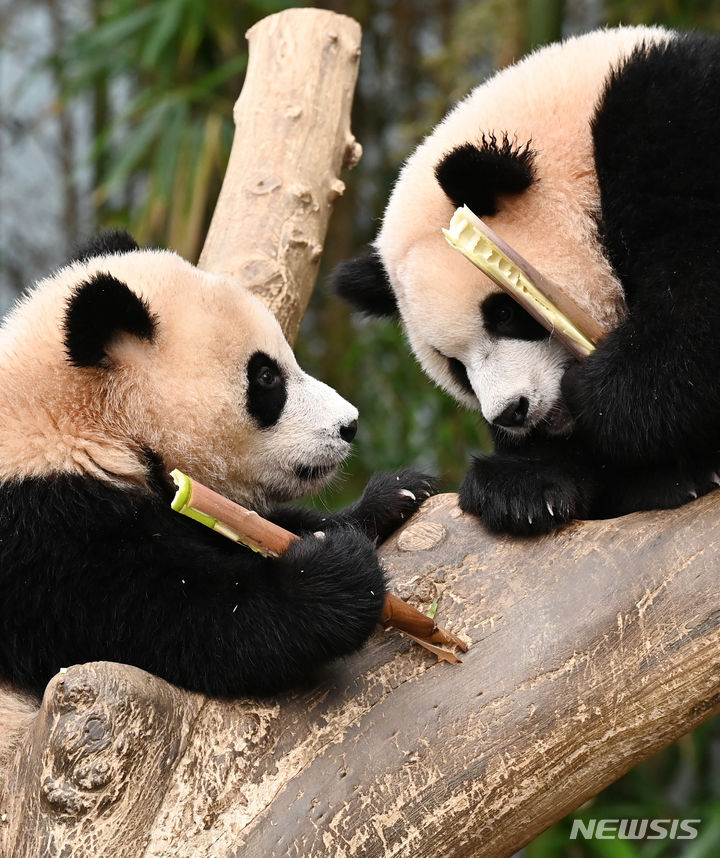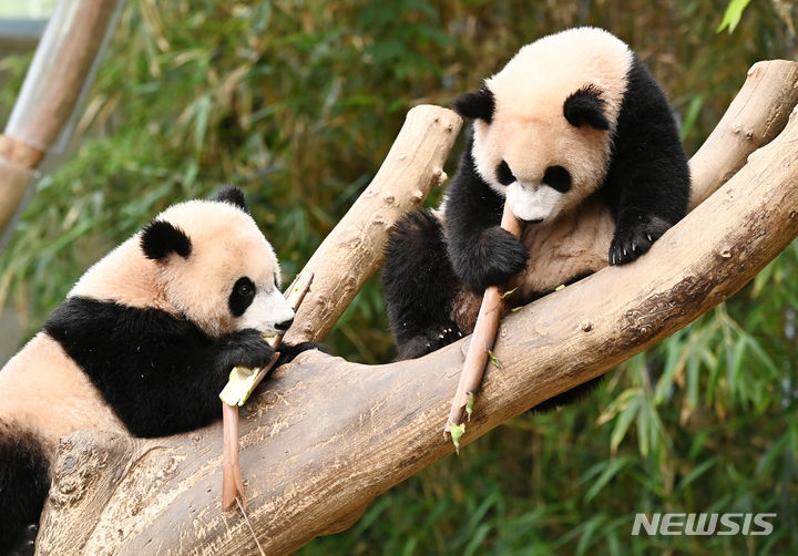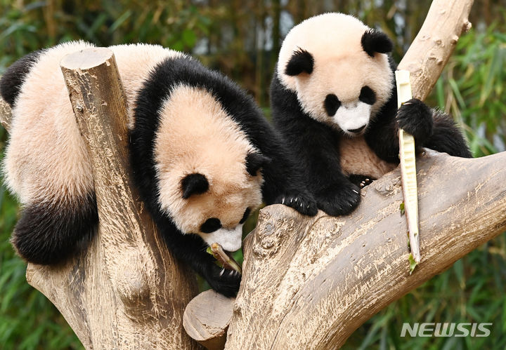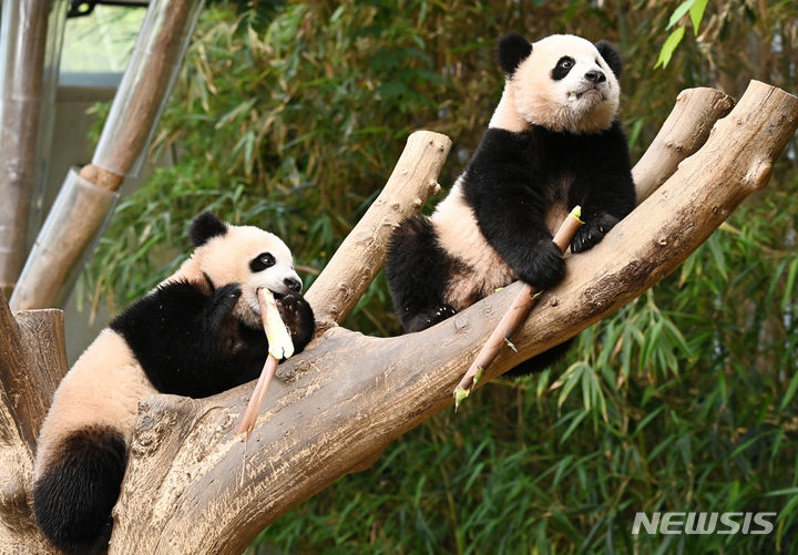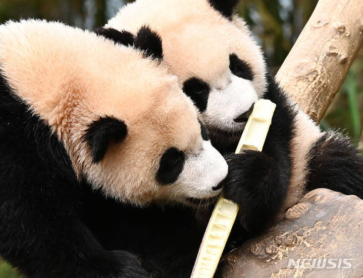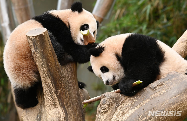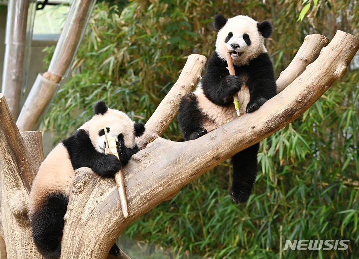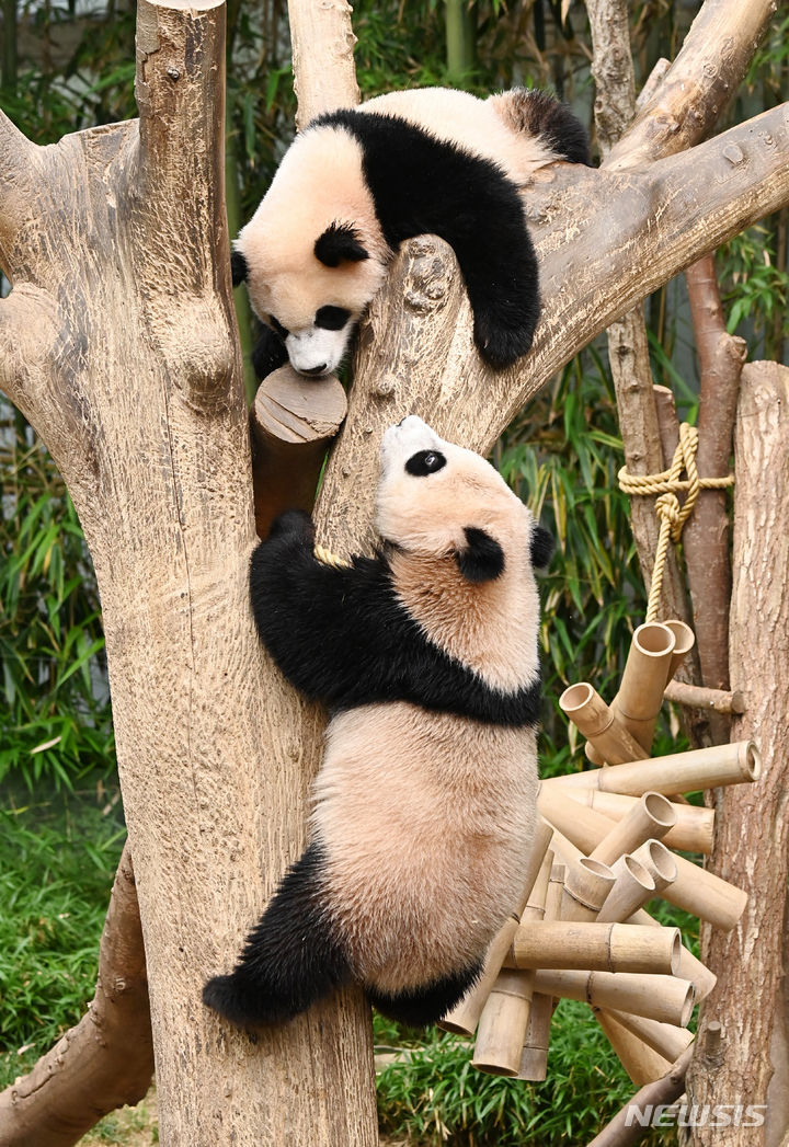 「国際生物多様性の日」に当たる22日、エバーランド(京畿道竜仁市)の「パンダワールド」屋内飼育施設で、韓国初の双子のパンダ「睿宝(ルイバオ)」と「輝宝(フイバオ)」が木に登り、一休みしている様子。国際生物多様性の日は、1992年に国連環境計画(UNEP)の条約交渉会議で「生物多様性条約」が採択されたことを記念し、生物種の重要性と生態系の保全を目的として制定された国際記念日だ。