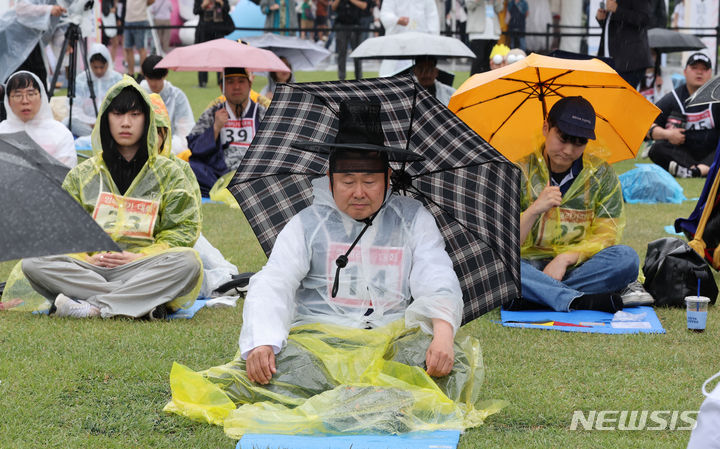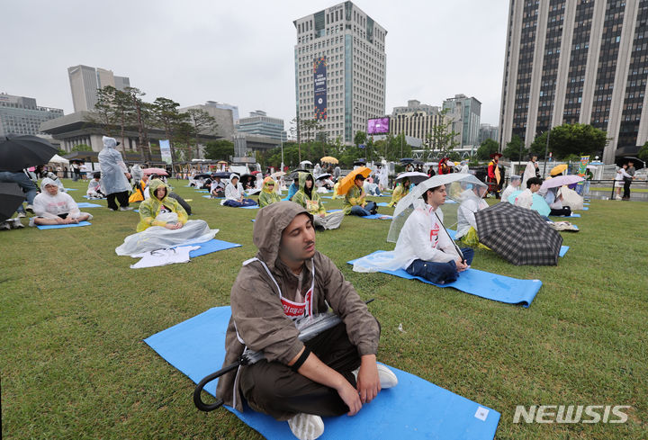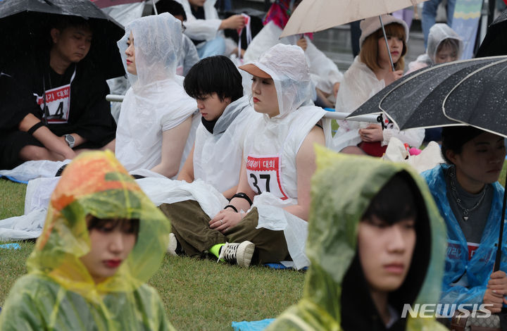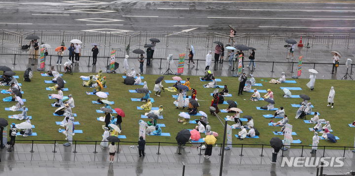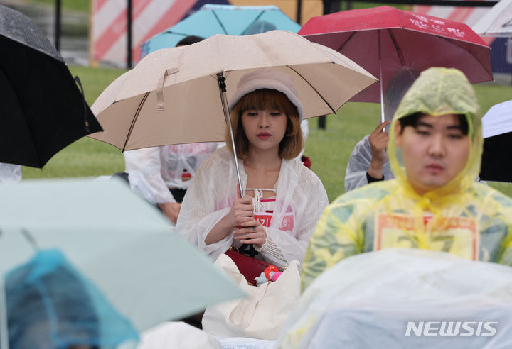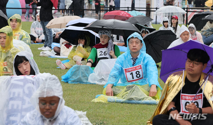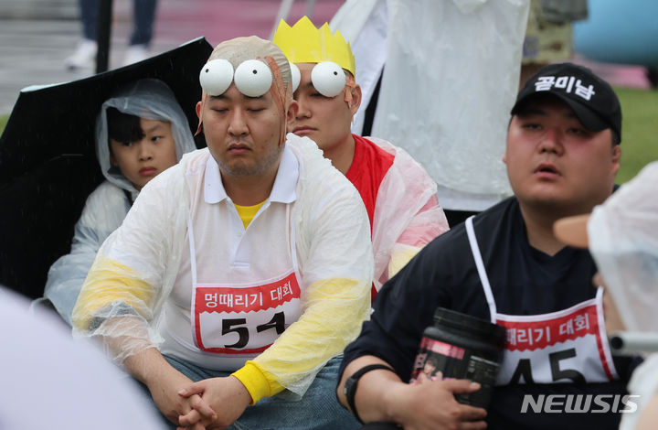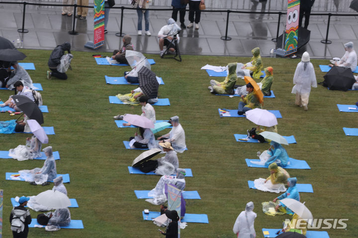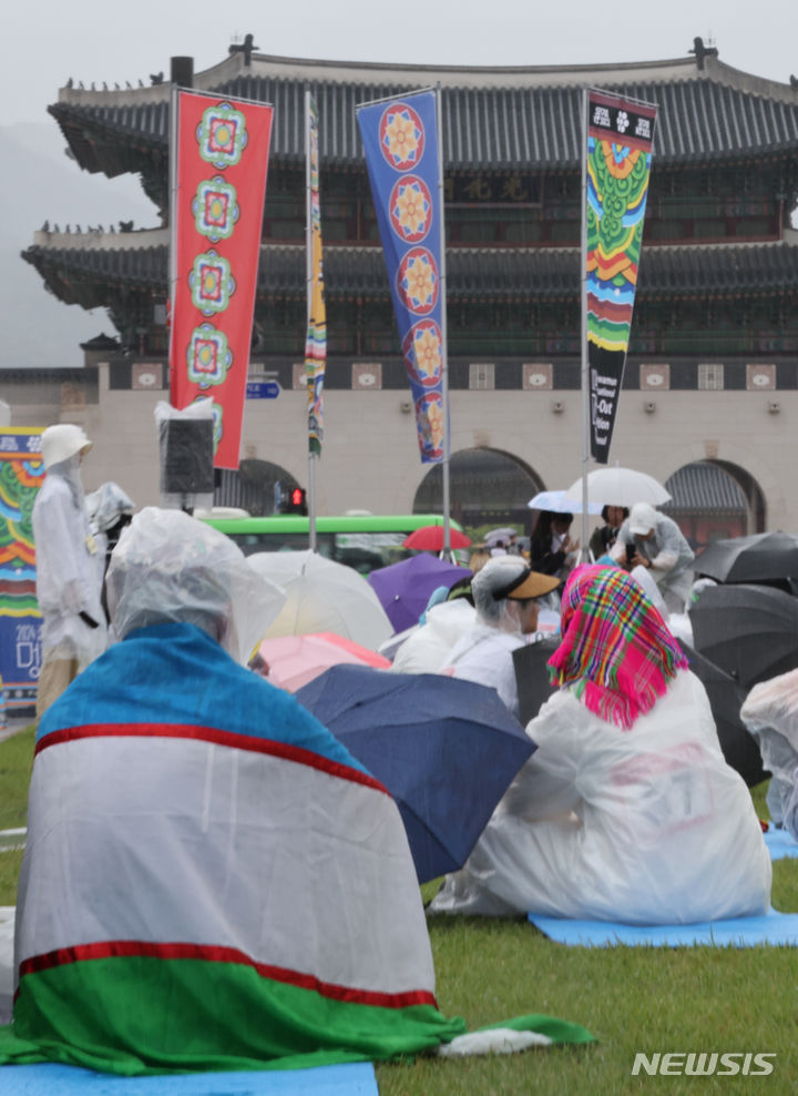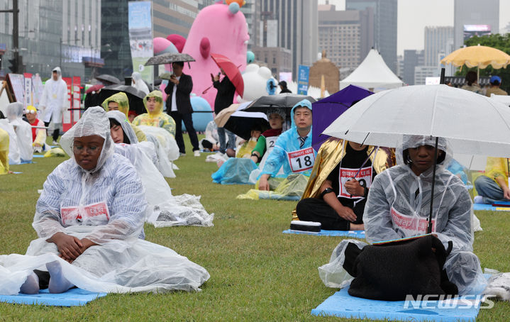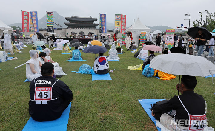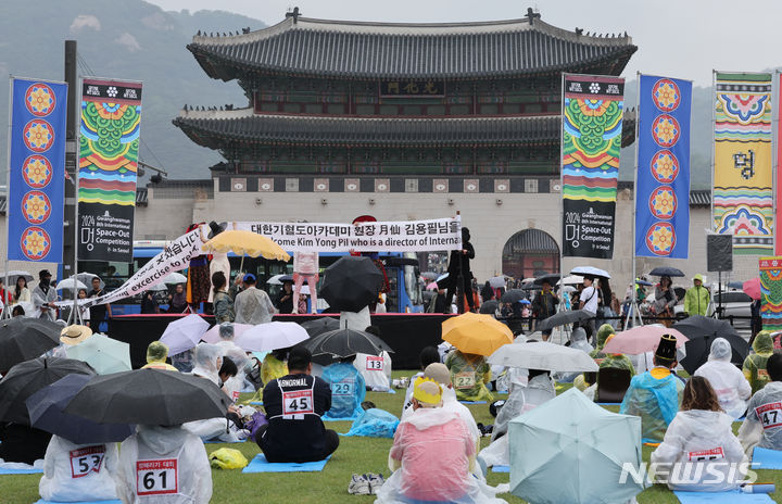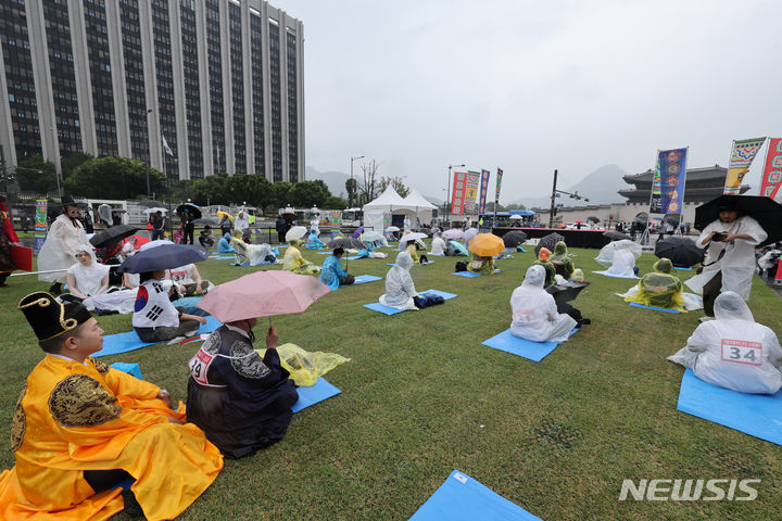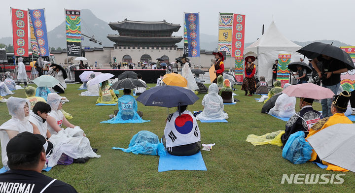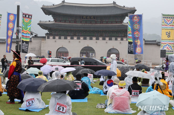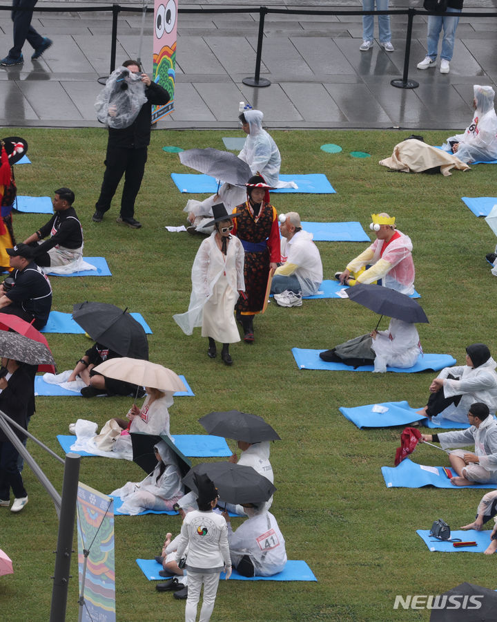 【NEWSIS】26日、ソウル市鍾路区の光化門広場で行われた「2024ソウル世界都市文化フェスティバル」の「インターナショナル・ぼーっとする大会」の様子。雨が降る中、国内外の人々が伝統衣装などを着て参加した。
