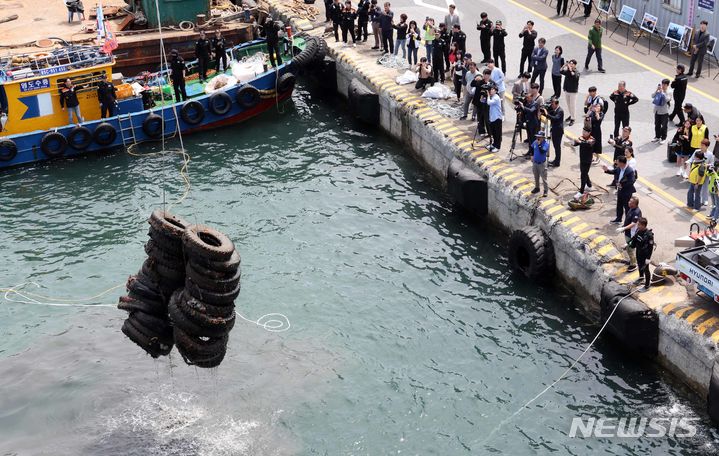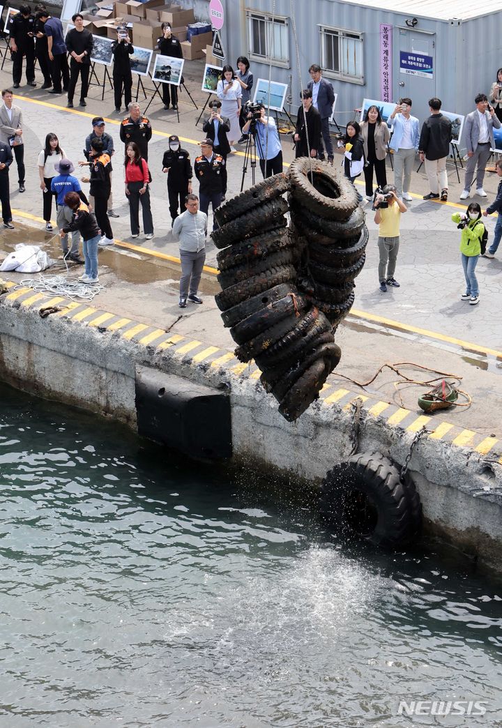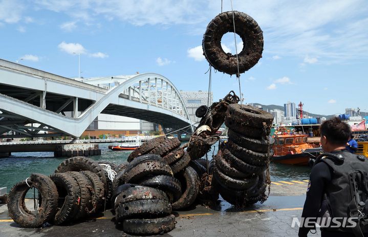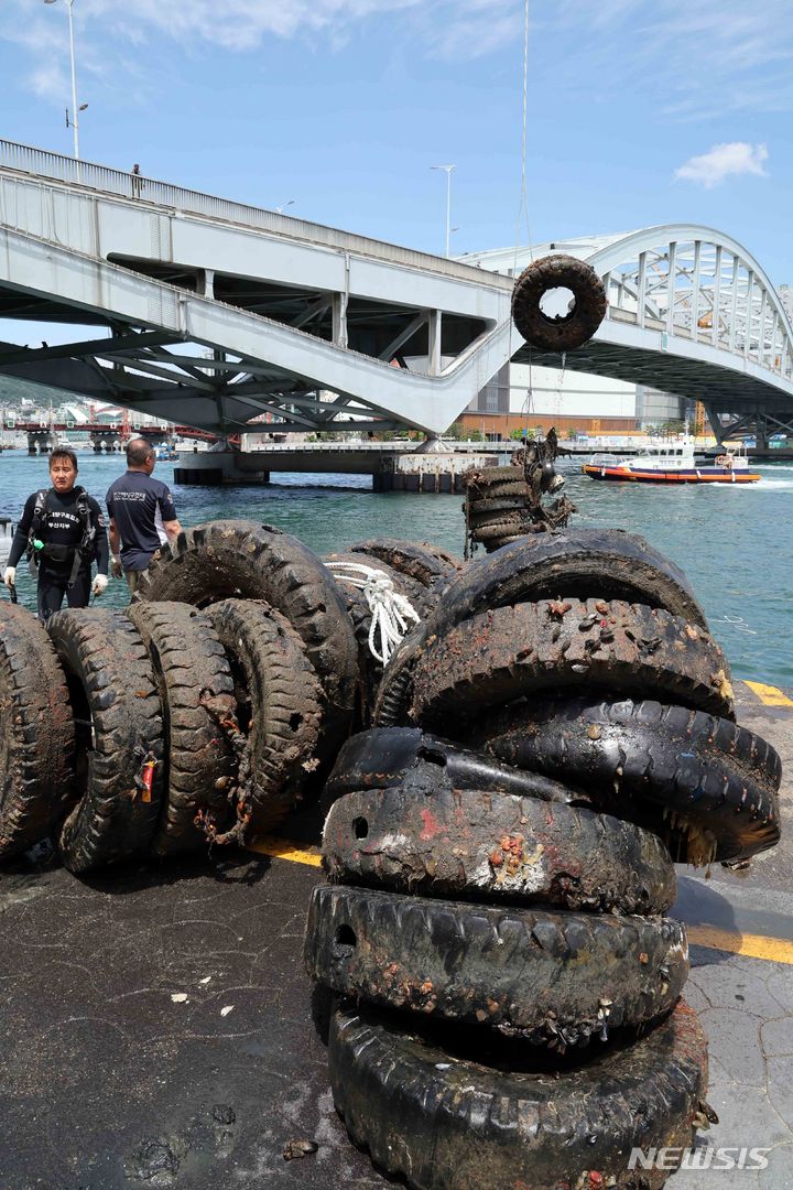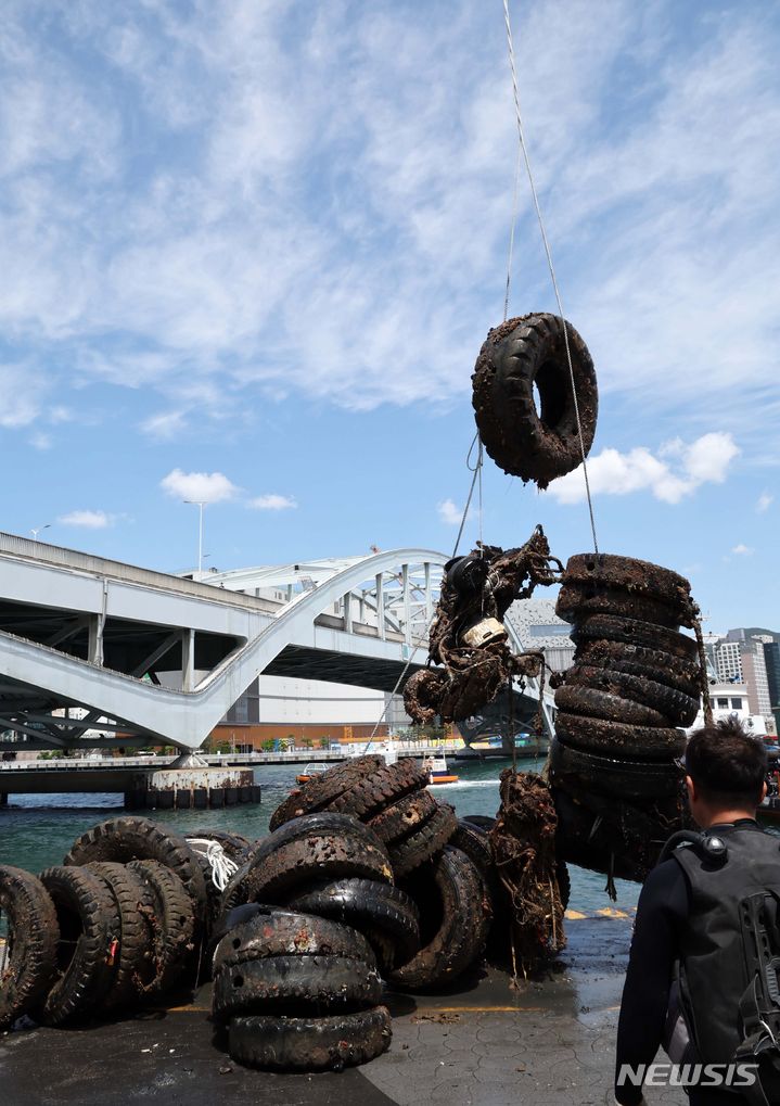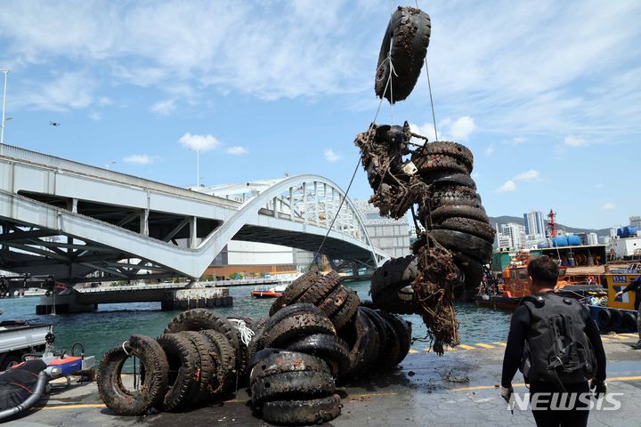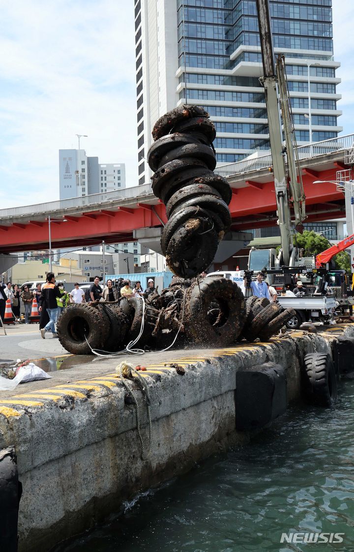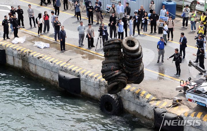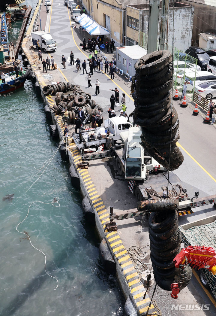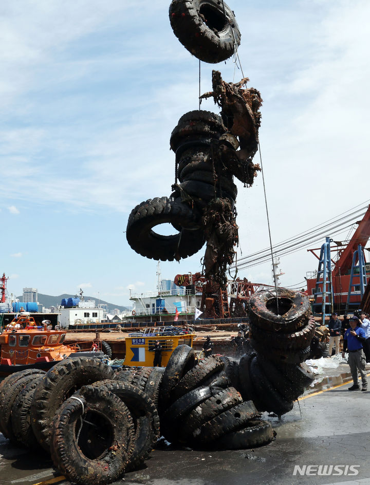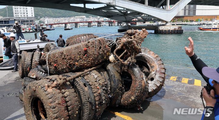 韓国で第29回海の日(5月31日)を控えた28日、釜山市影島区蓬莱洞の物揚場で、中央海洋特殊救助団や韓国海洋救助協会のダイバーらが回収した廃タイヤ・オートバイなどの海洋ごみをクレーンで運ぶ様子。