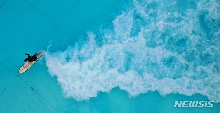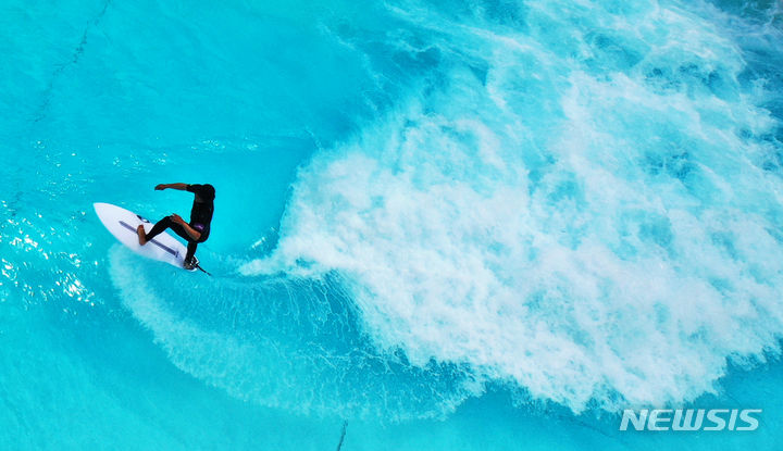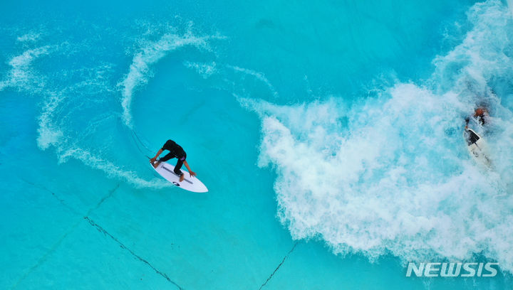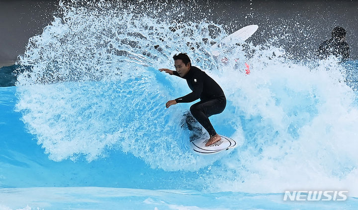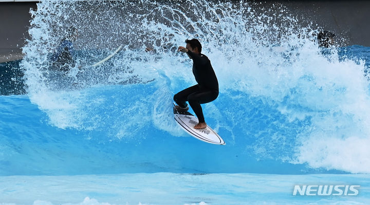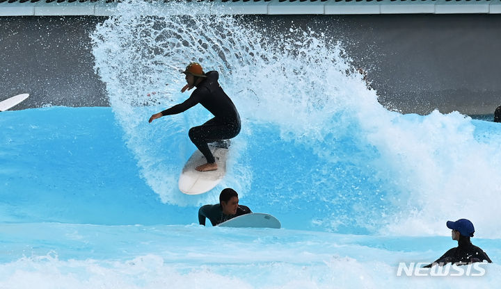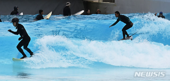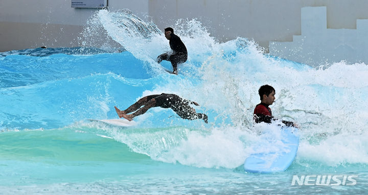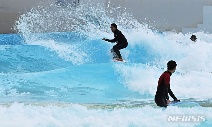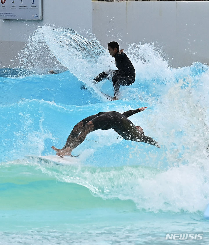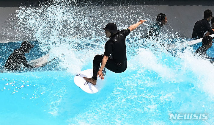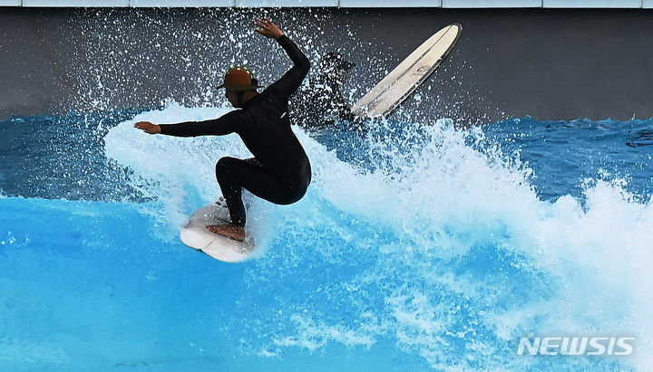 初夏の天気となった28日、京畿道始興市にあるコブクソムのウェーブパーク人工サーフィン場では、サーファーたちが波乗りをしていた。