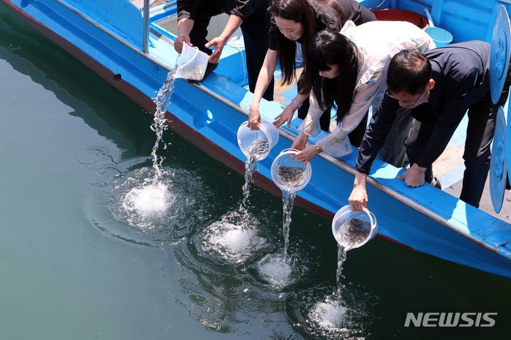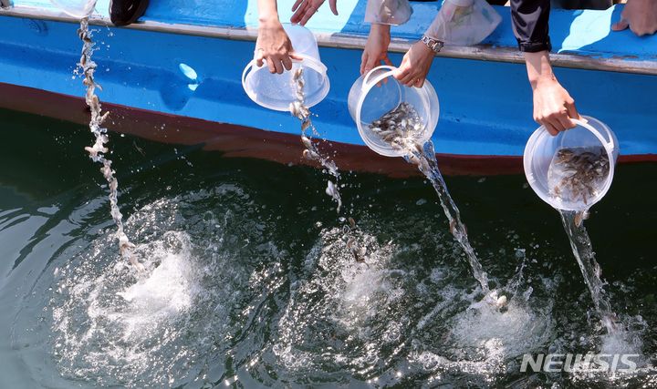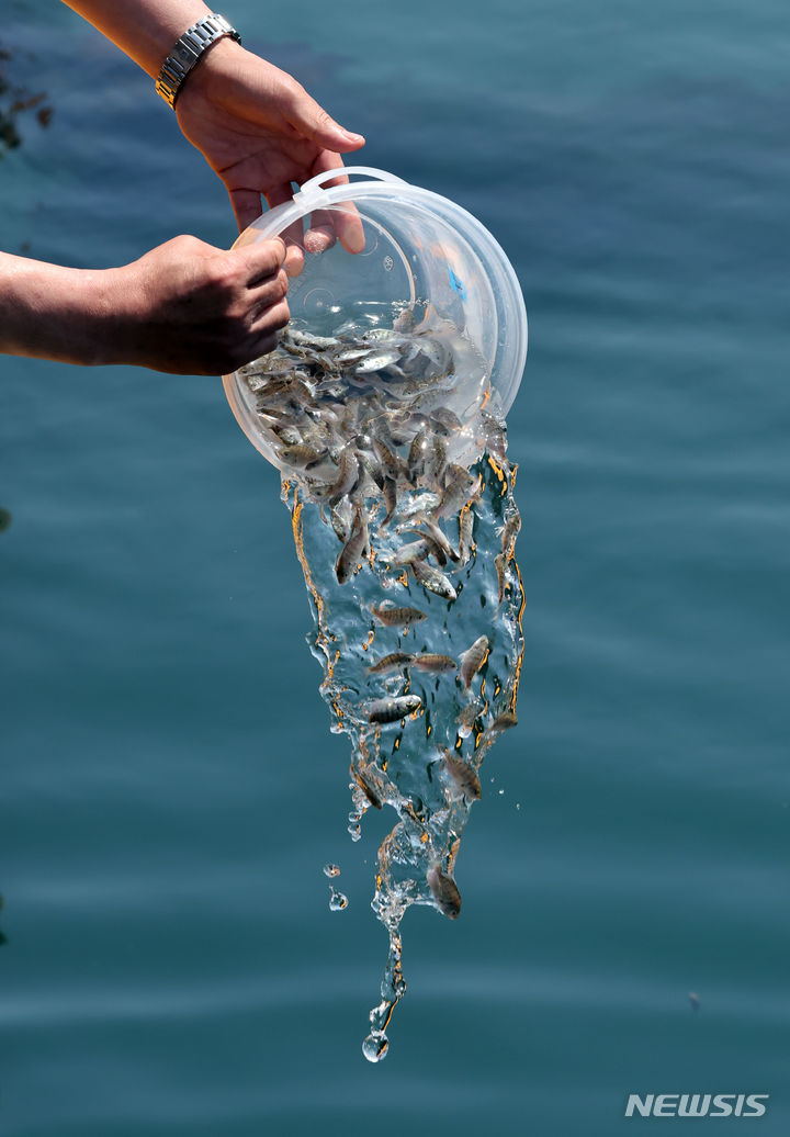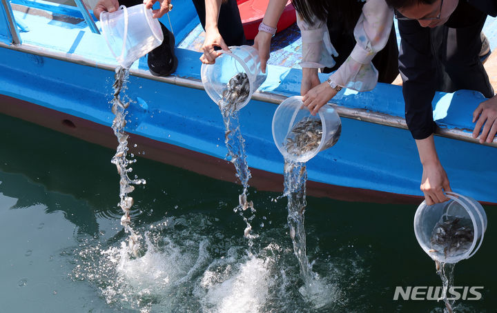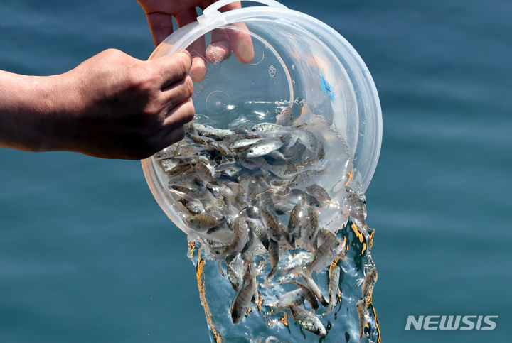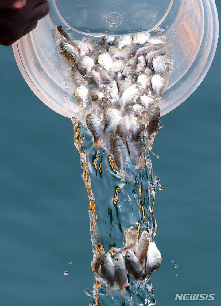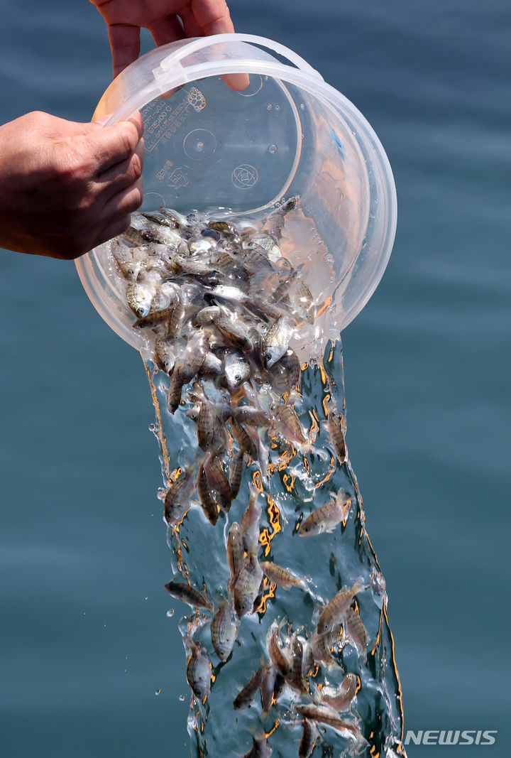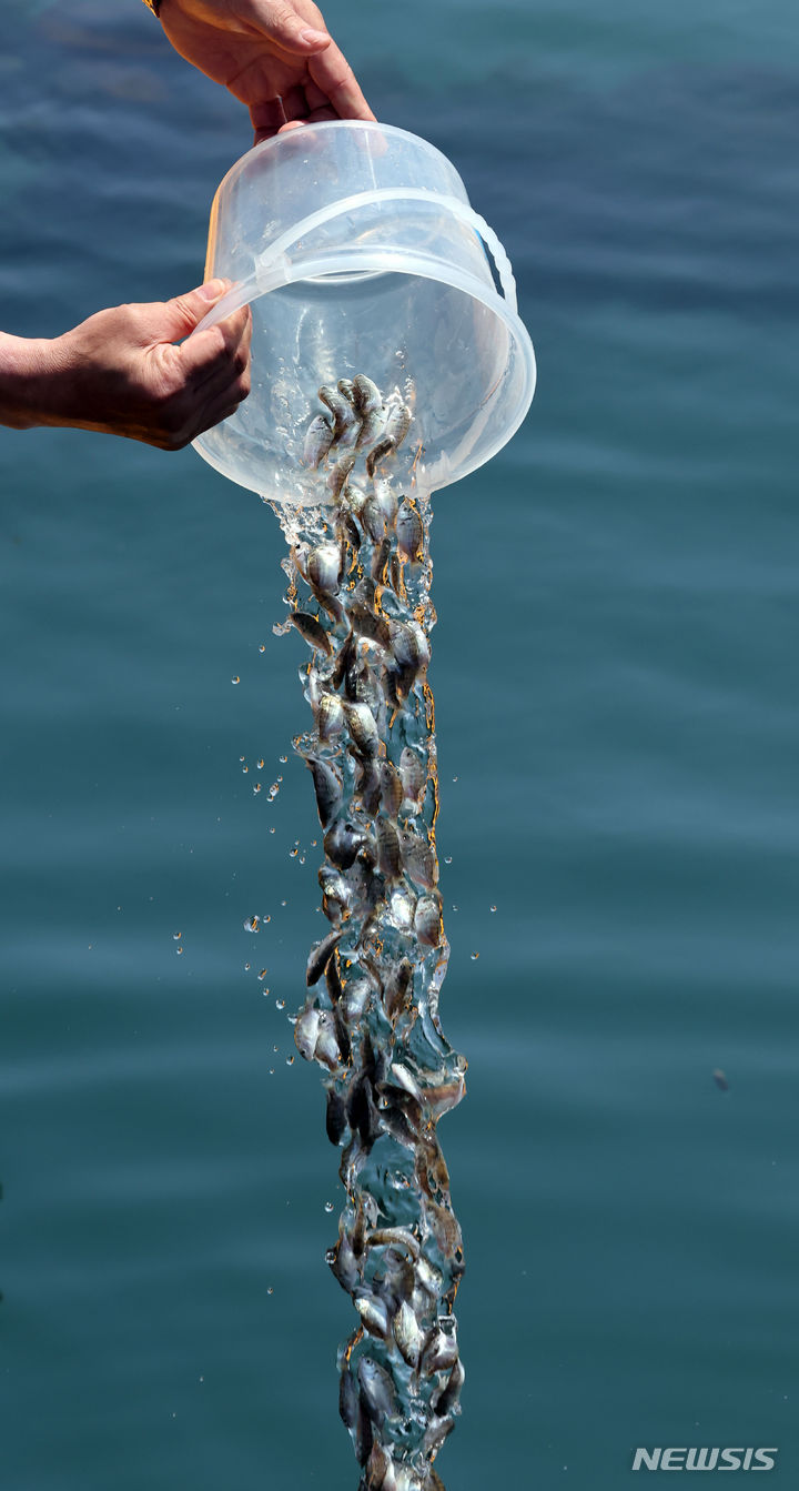 【NEWSIS】韓国の「海の日(5月31日)」が目前に迫った29日、釜山市影島区の東三港で、釜山水産資源研究所の関係者らがクロダイの稚魚4万尾を放流している様子。