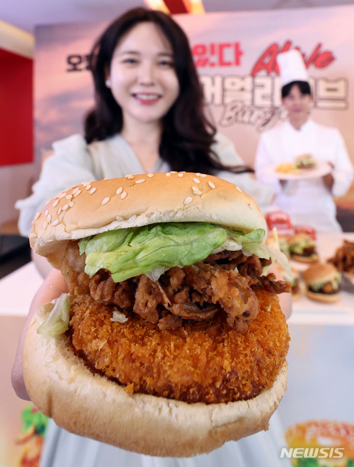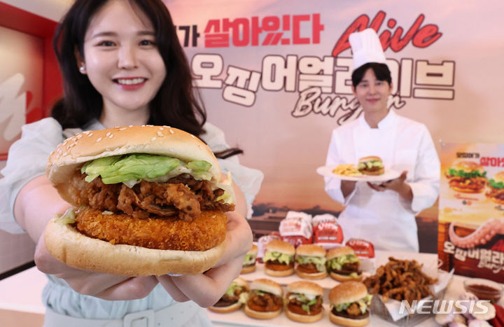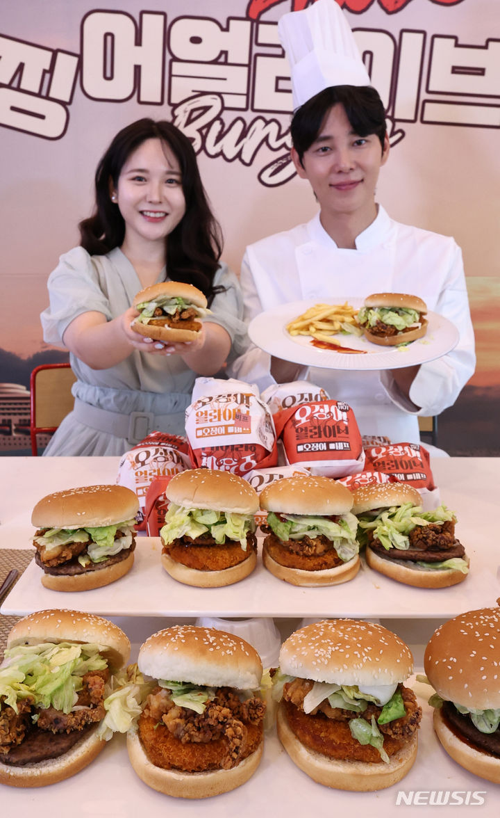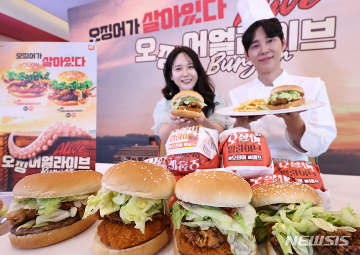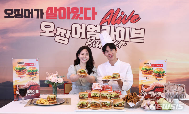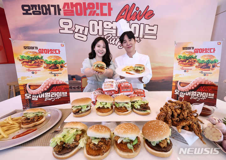 【NEWSIS】ロッテリアでは30日午前、ソウル市竜山区のロッテリア淑大入口駅店で、新製品「イカ・アライブ・バーガー」4種のPRを行った。