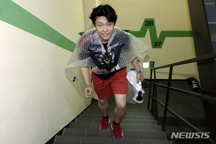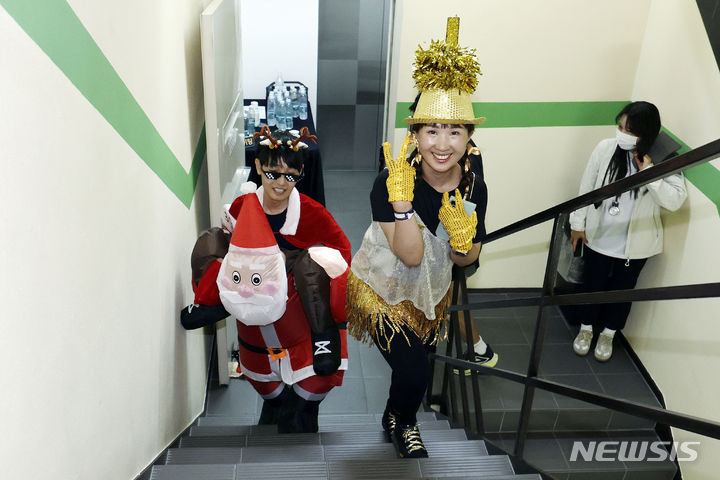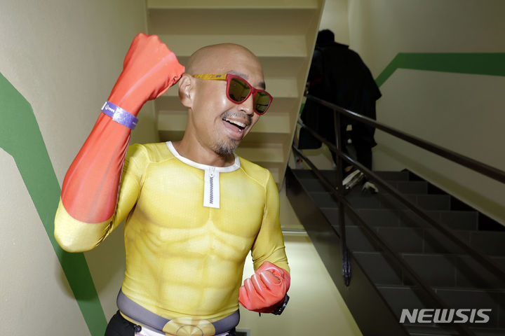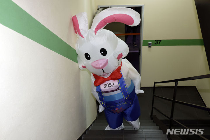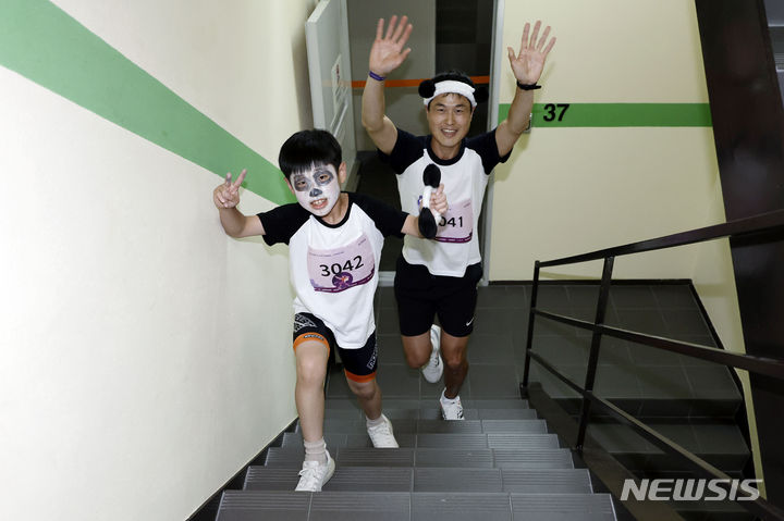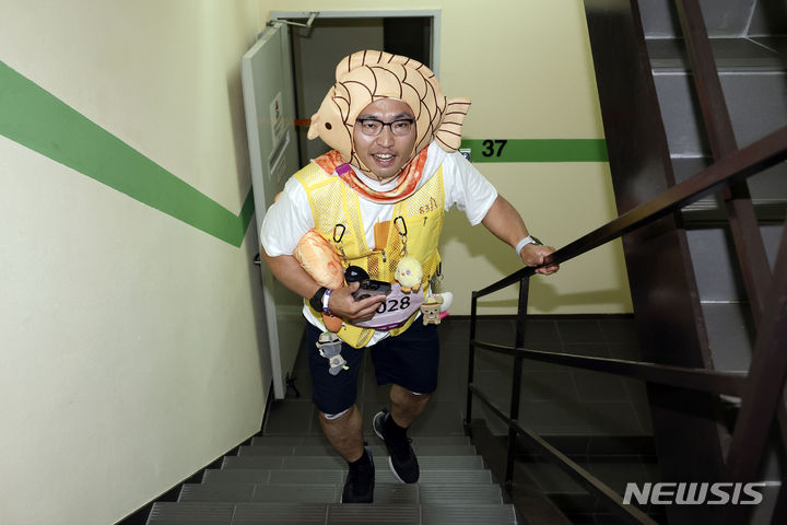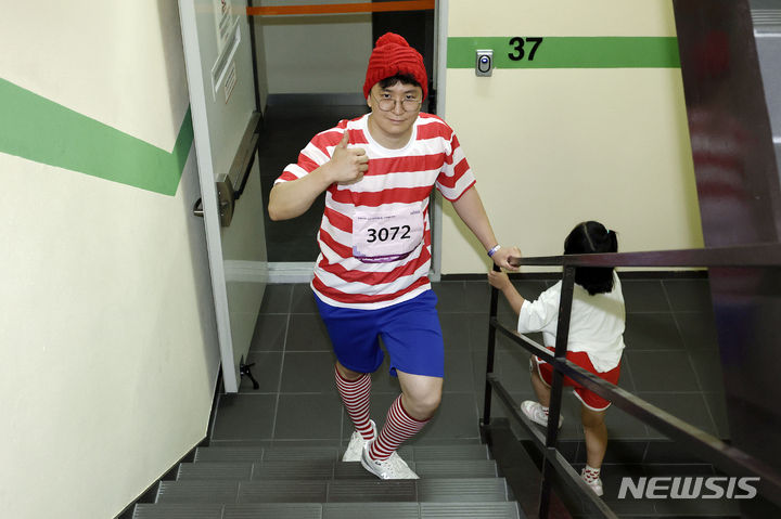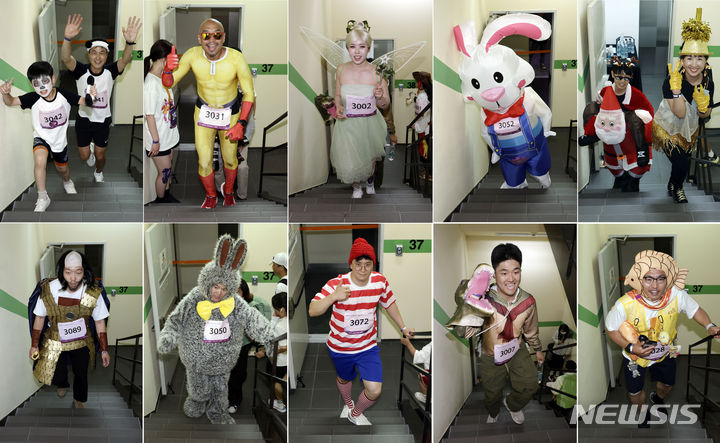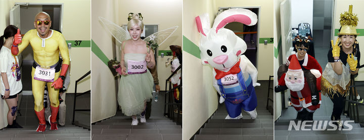 1日、ソウル市永登浦区の63ビルで開かれた第20回ハンファ生命シグネチャー63 RUN大会で、仮装して階段を上る参加者らの様子。