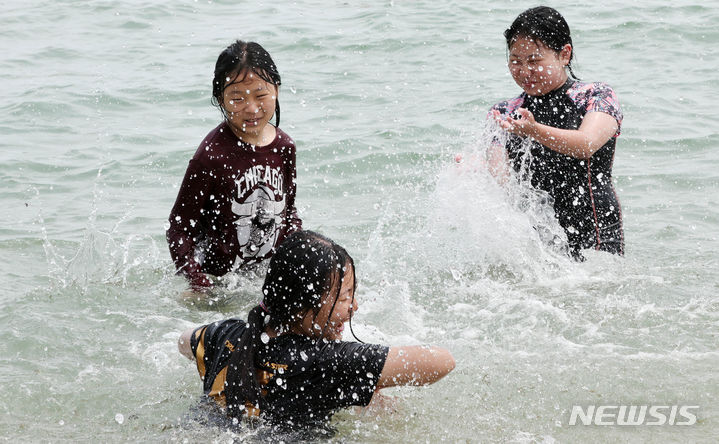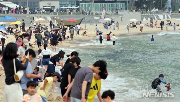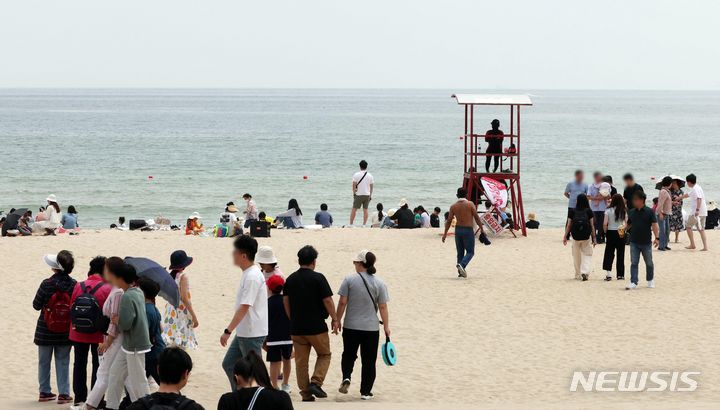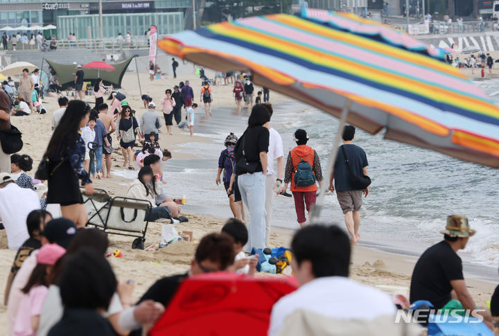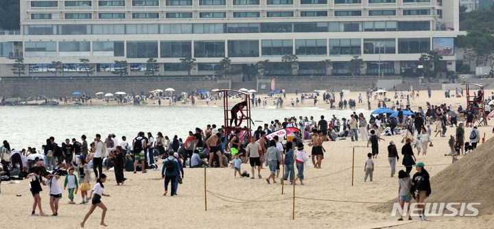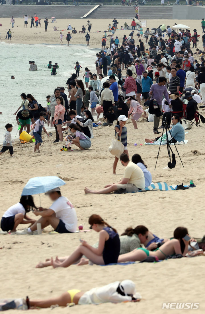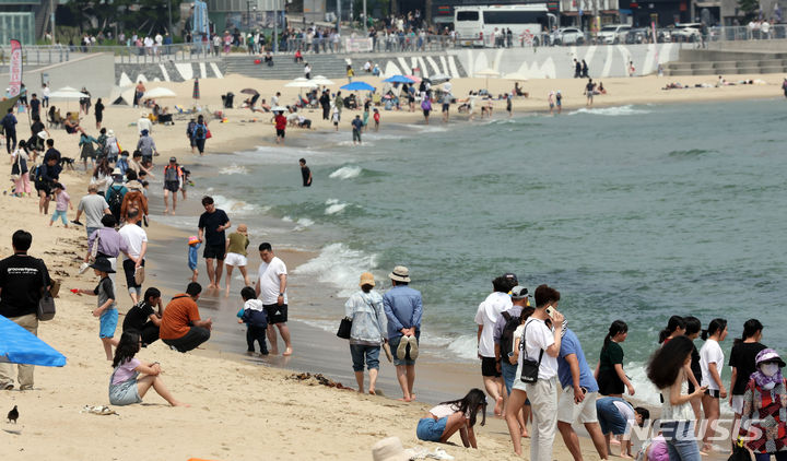 【NEWSIS】釜山市内の海雲台海水浴場・松亭海水浴場で一部が海開きして初めての休日となった2日、海雲台海水浴場を訪れた人々。6月の1カ月間、海雲台海水浴場は観光案内所からイベント広場前の300メートル区間、松亭海水浴場は観光案内所前の150メートル区間で部分的に開設される。そして7月1日からの2カ月間は海雲台・松亭・広安里・日光・林浪・松島・多大浦という7つの釜山市内の海水浴場が全面開設される。