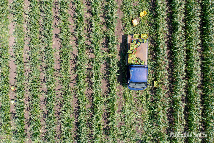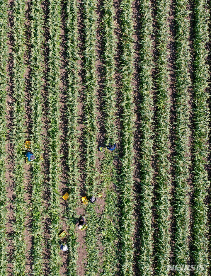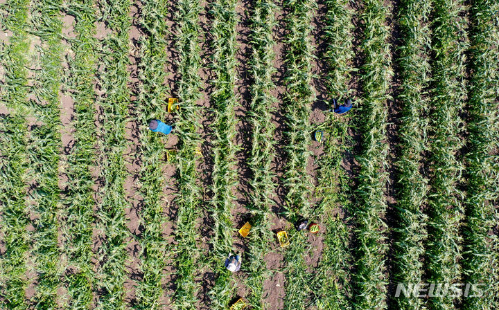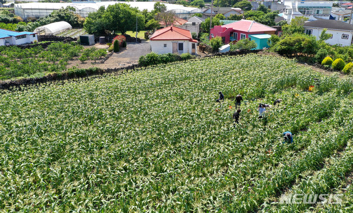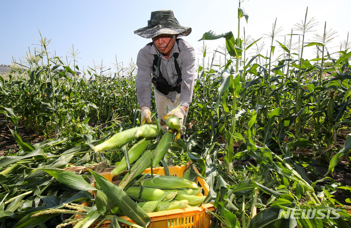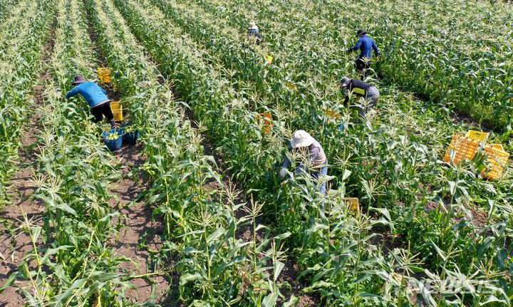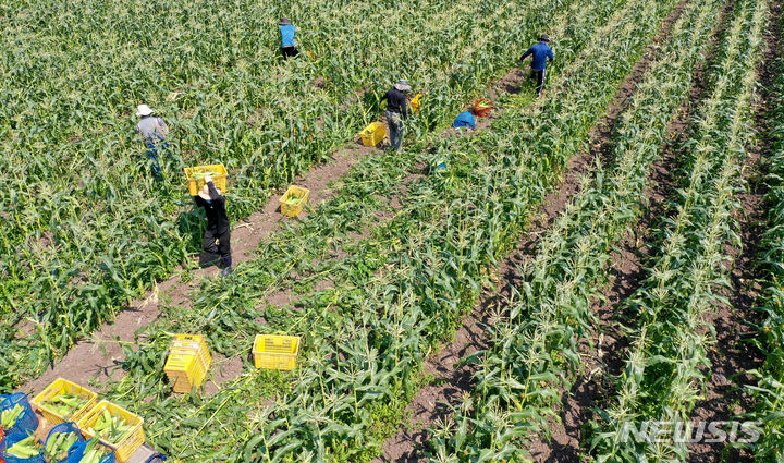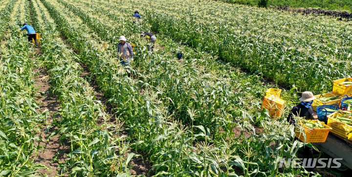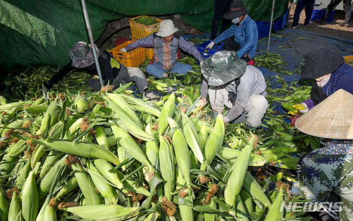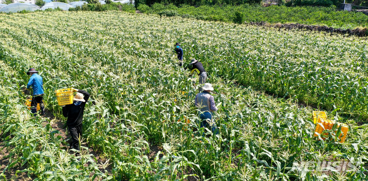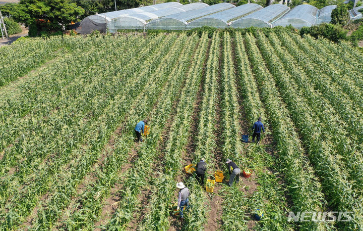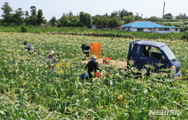 晴天に恵まれた4日午前、済州市涯月邑水山里の畑で、農民たちがスーパースイートコーンの収穫作業をしている。