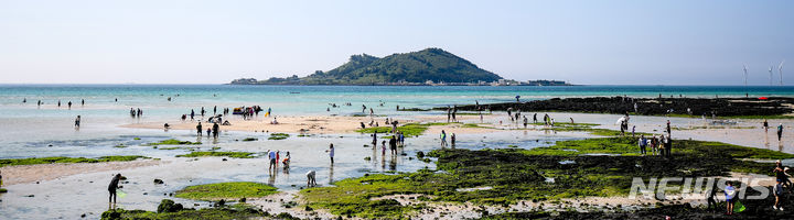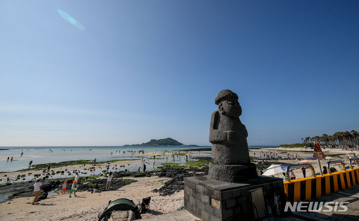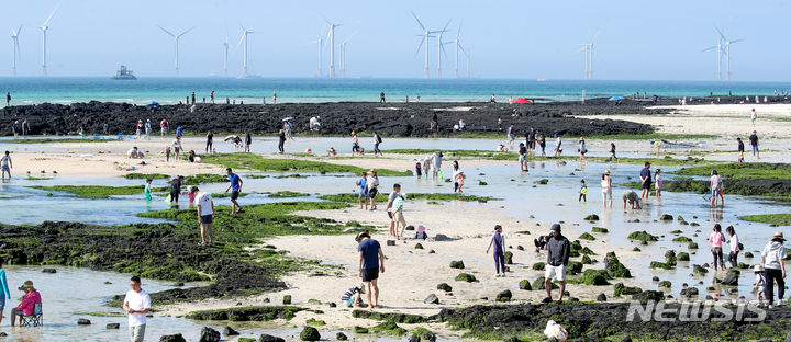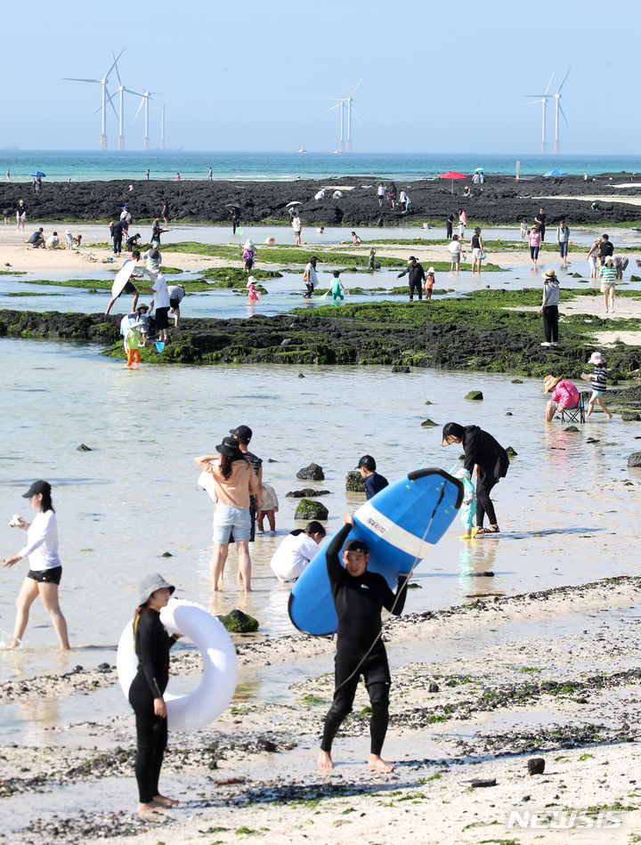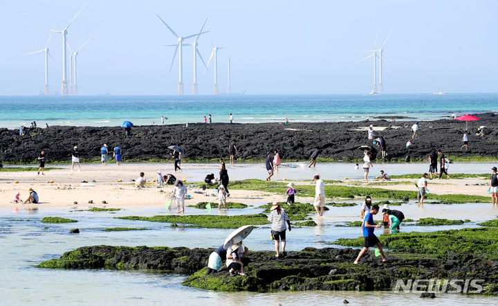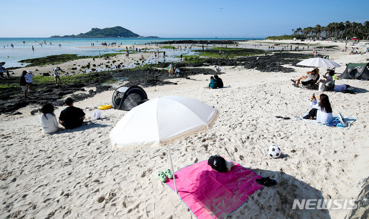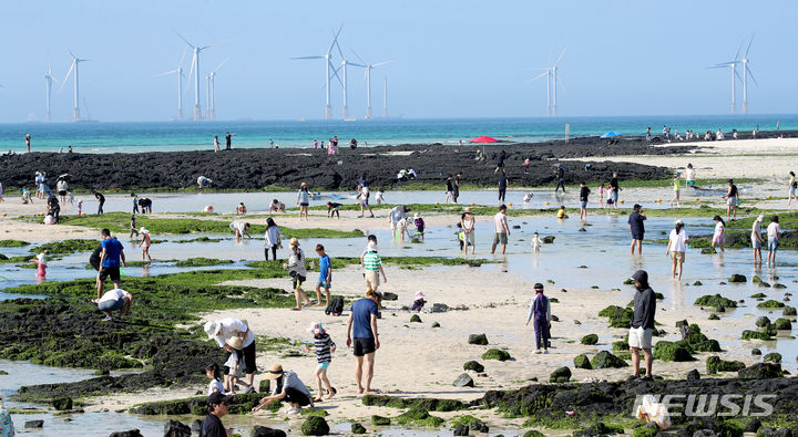 【NEWSIS】雨がやんで青空が見えた9日午後、済州特別自治道済州市の金陵海水浴場を訪れた人々。海水に足を浸して楽しいひとときを過ごした。