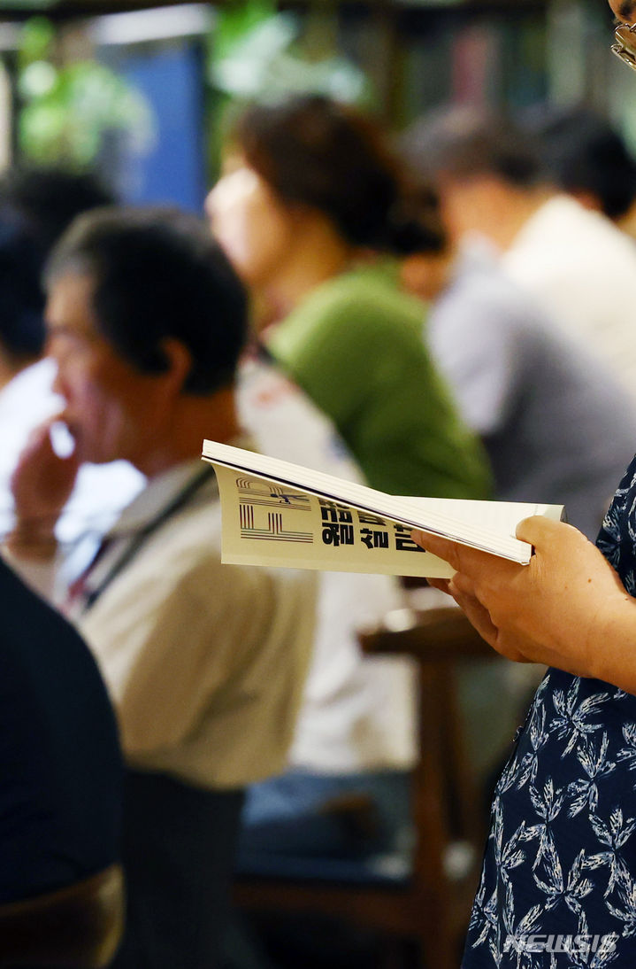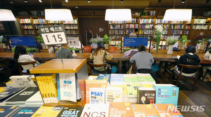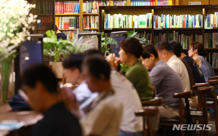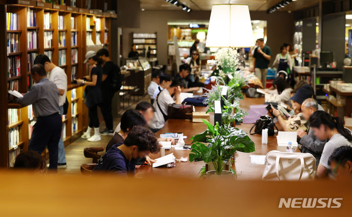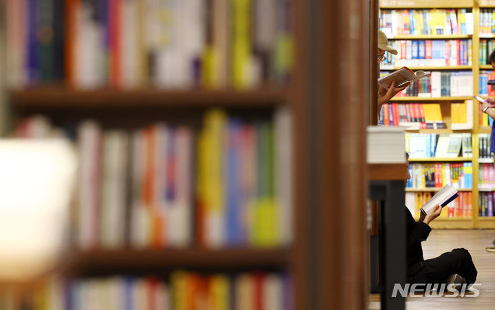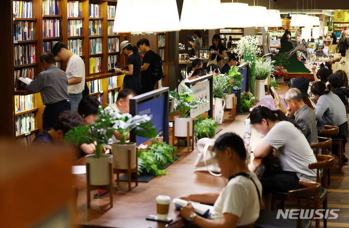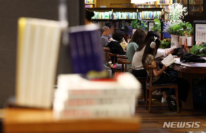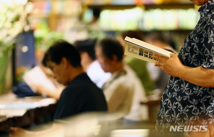 ソウルの昼間の最高気温が30度まで上昇し、暑い一日となった10日、ソウル市鍾路区の書店「教保文庫光化門店」では、訪れた市民が暑さを避けて本を読んでいた。
