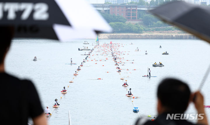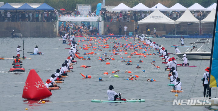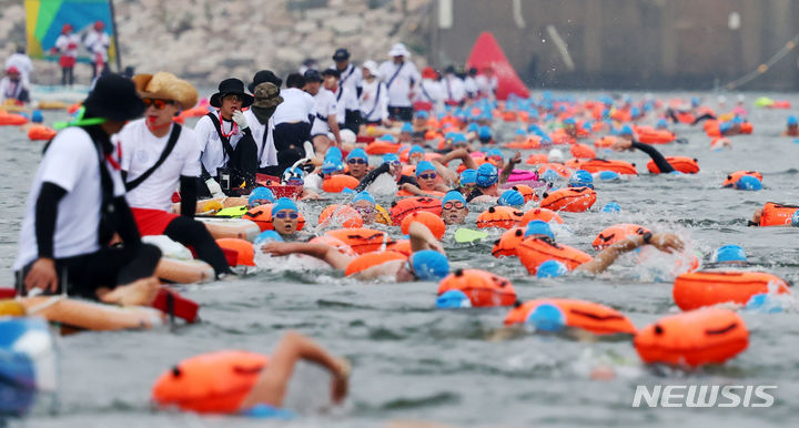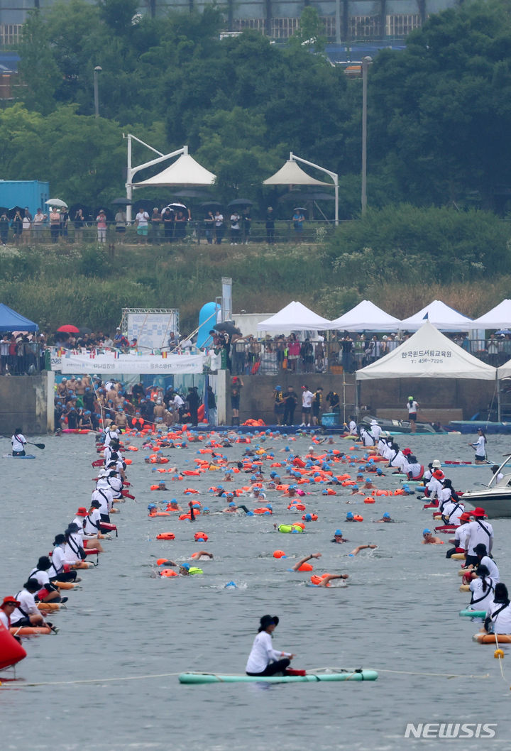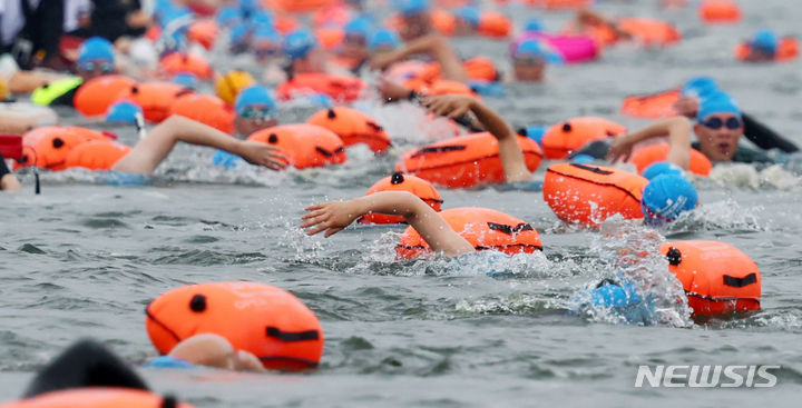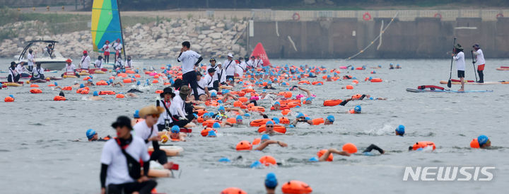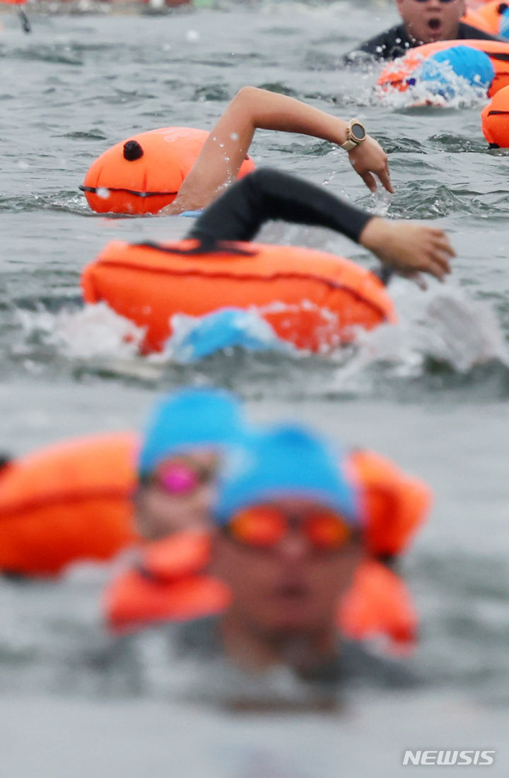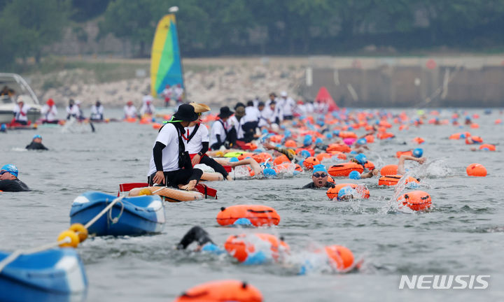 ソウル市内を流れる漢江の蚕室大橋南端一帯で22日、「漢江クロス・スイミング・チャレンジ2024」が開催され、参加者たちが力強い泳ぎを見せている。