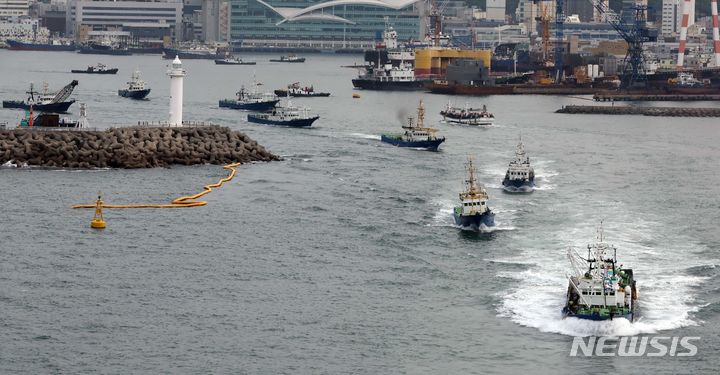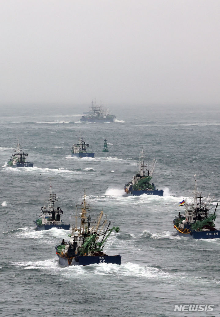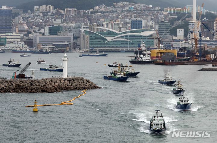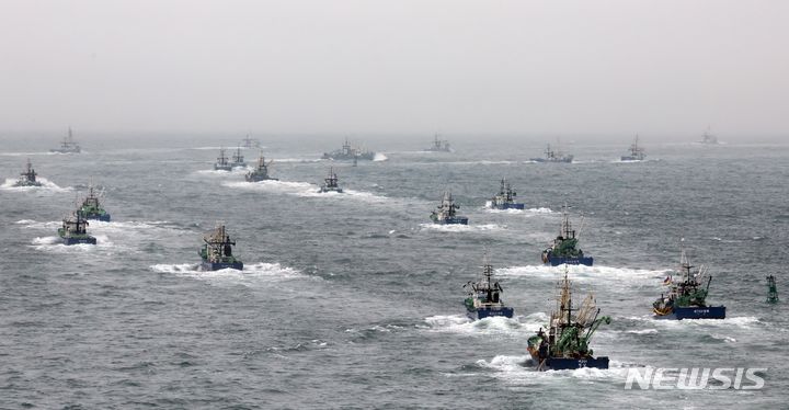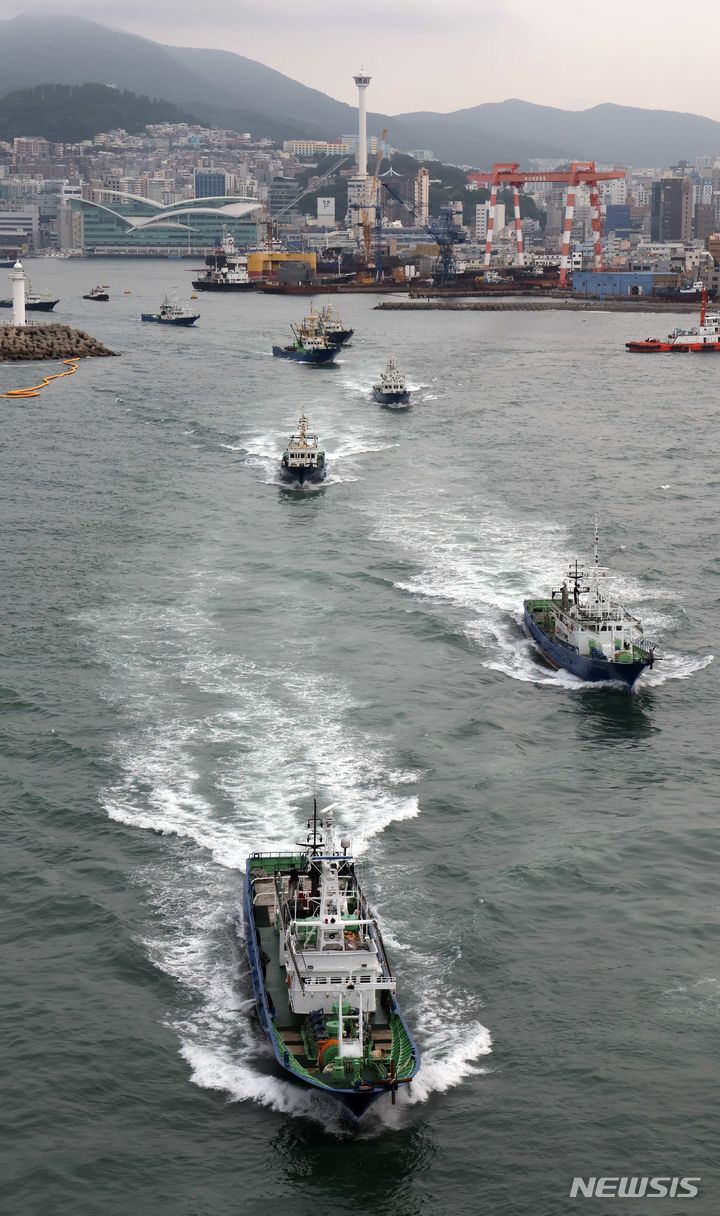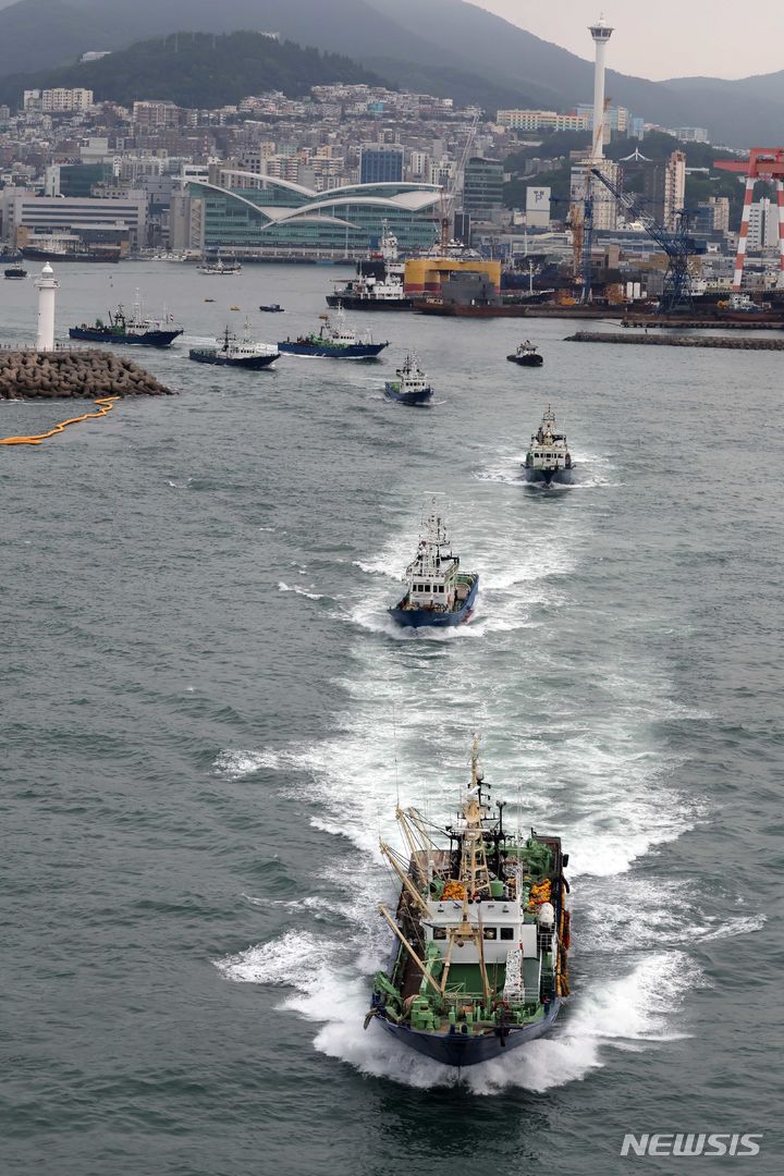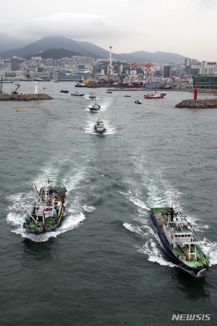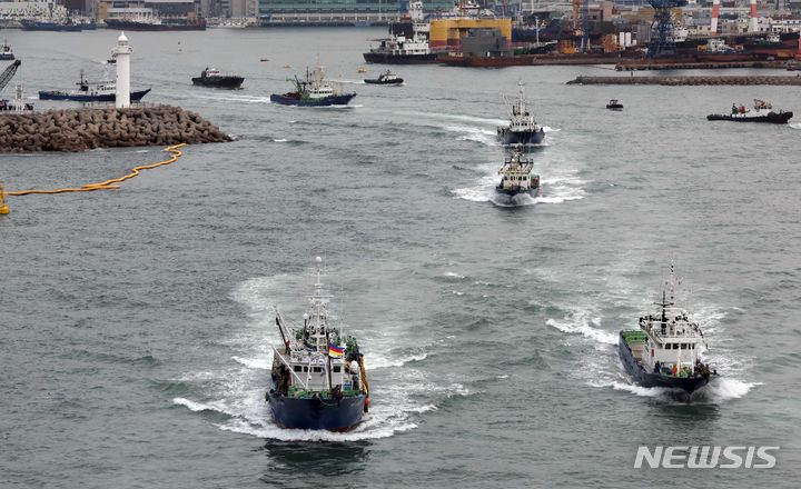 【NEWSIS】2カ月間の禁漁期を終え、大型旋網水協所属の16船団が24日午前、釜山市西区の釜山サバ市場市場ふ頭から大漁の夢を抱いて一斉に出航しているところ。