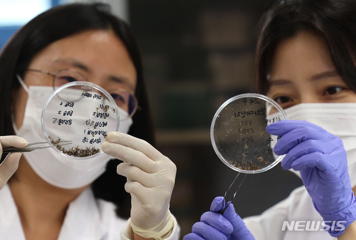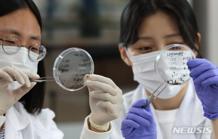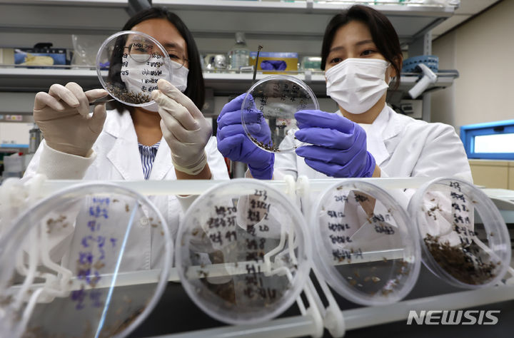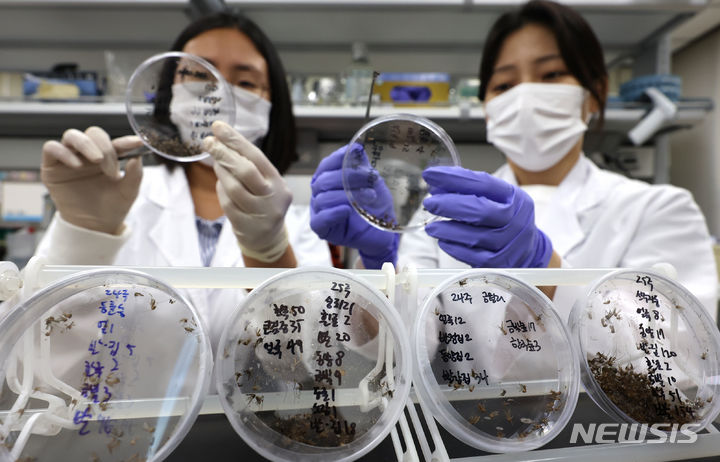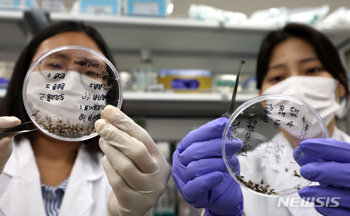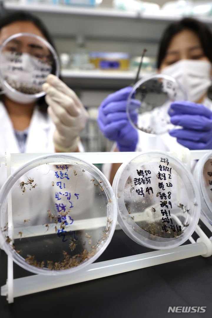 【NEWSIS】韓国各地にマラリア注意報が発令される中、27日には仁川市弥鄒忽区でマラリア患者が発生した。写真は同日午後、仁川市中区の仁川保健環境研究院媒介体感染病課実験室で、研究員らが蚊の種類の分類作業を行っているところ。